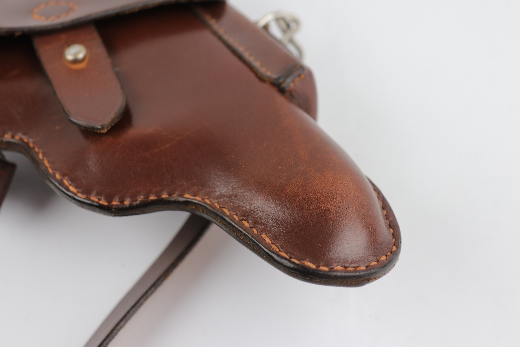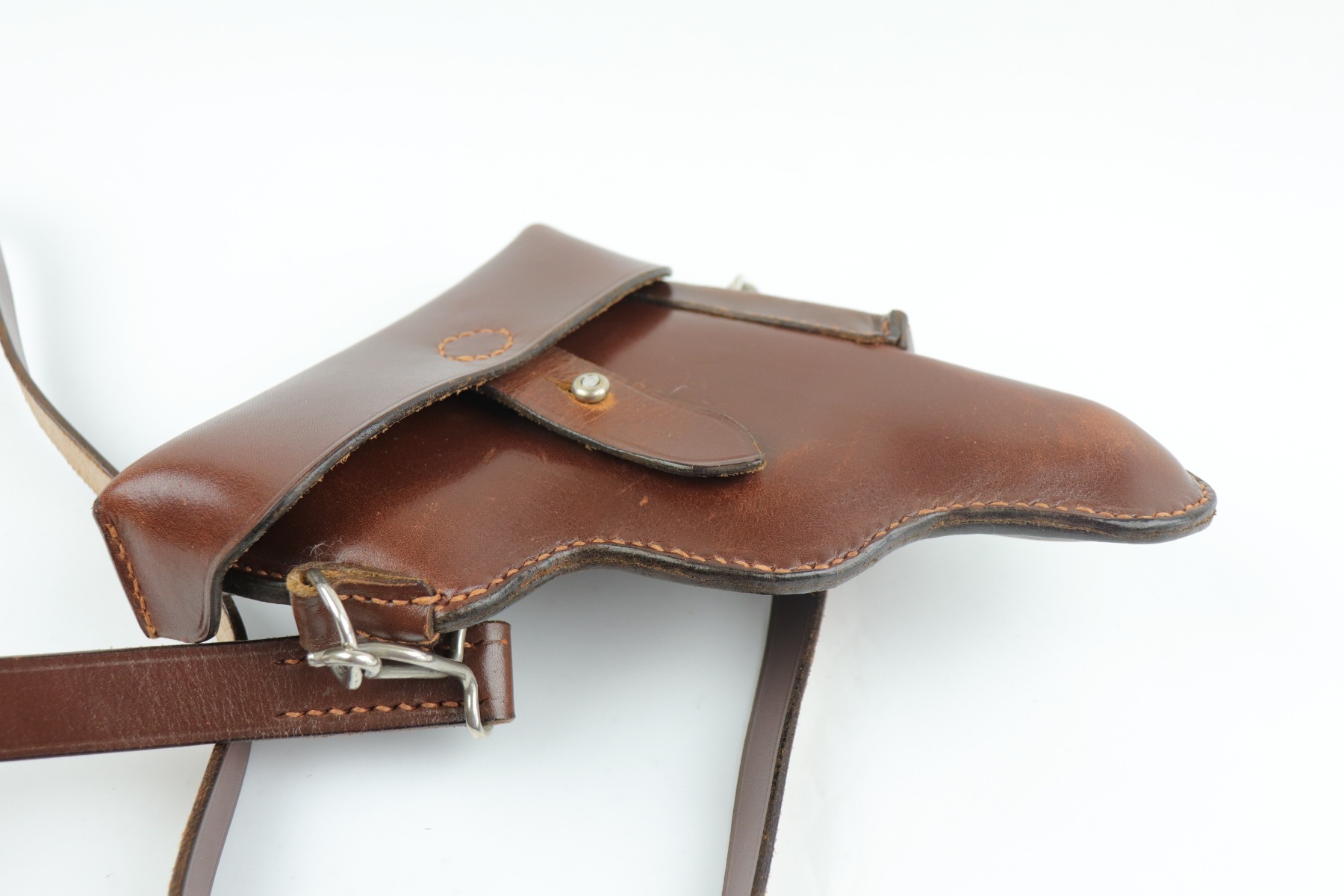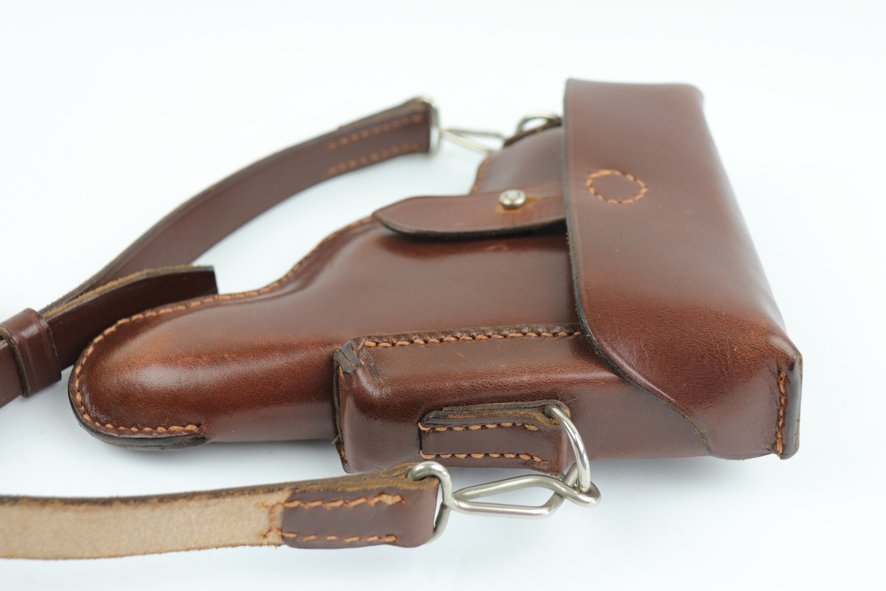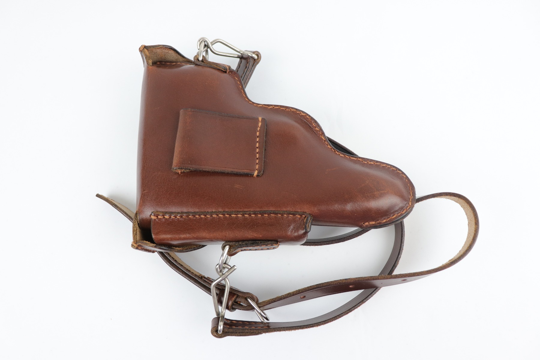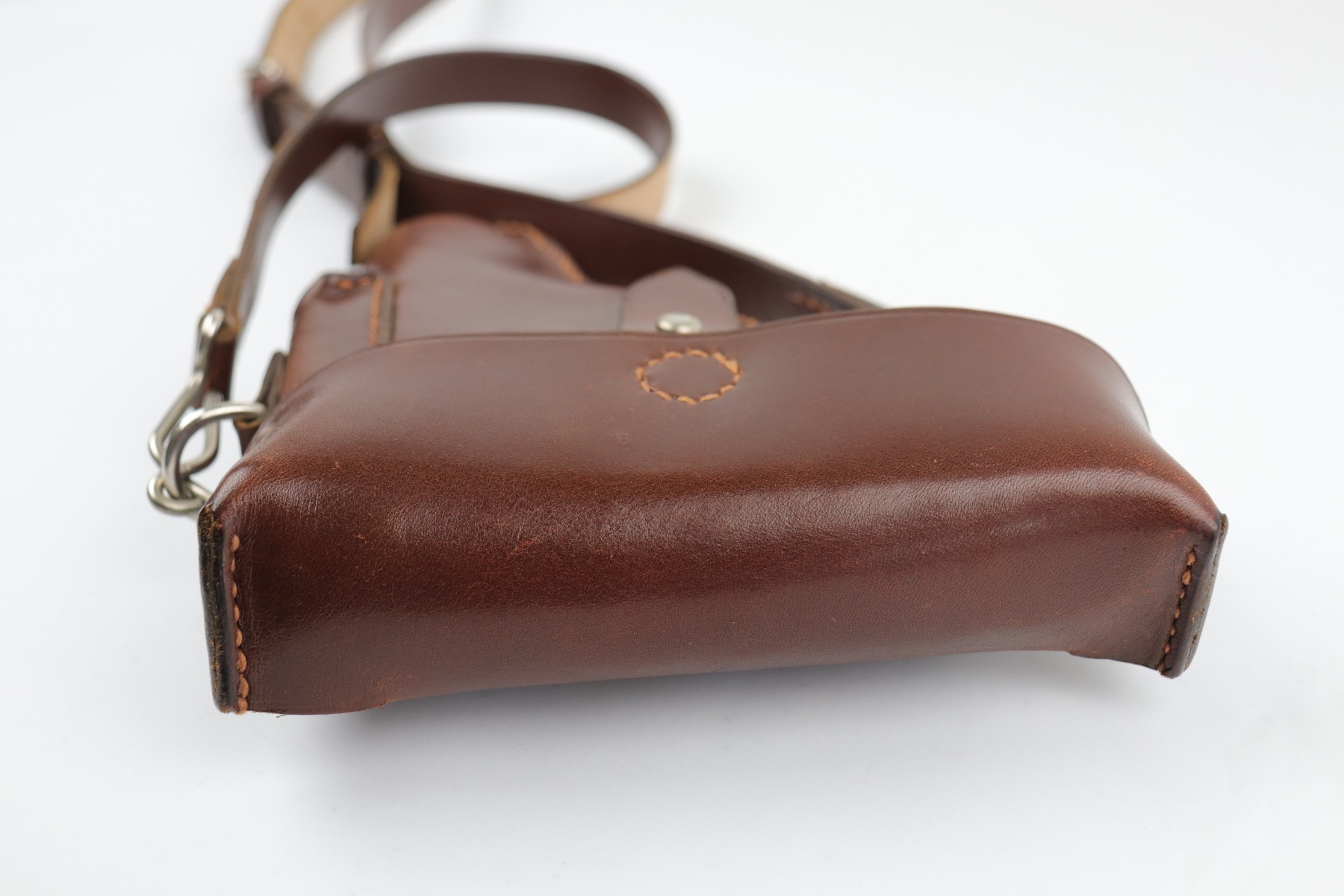 7/9/20 – Mint condition, Swiss made PP/PPK shoulder holster. It fits both a PP and PPK. These holsters came from the Swiss Factory Guard unit in about 1941. Appears un-issued. Clean, crisp leather and excellent shoulder strap. Intact, original stitching.