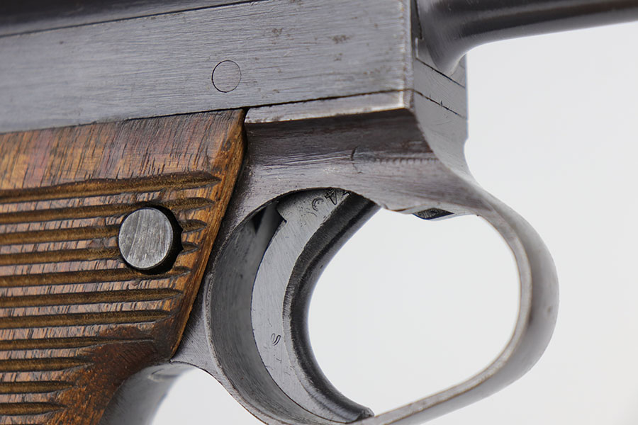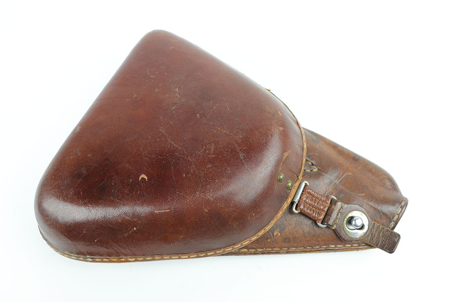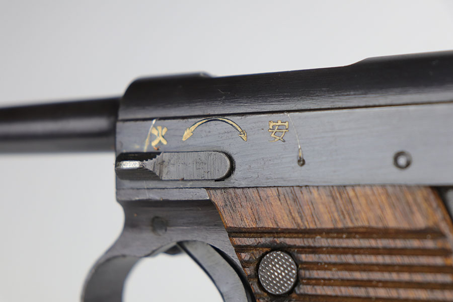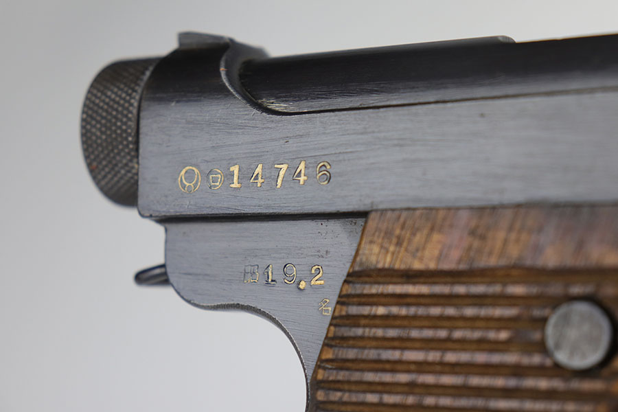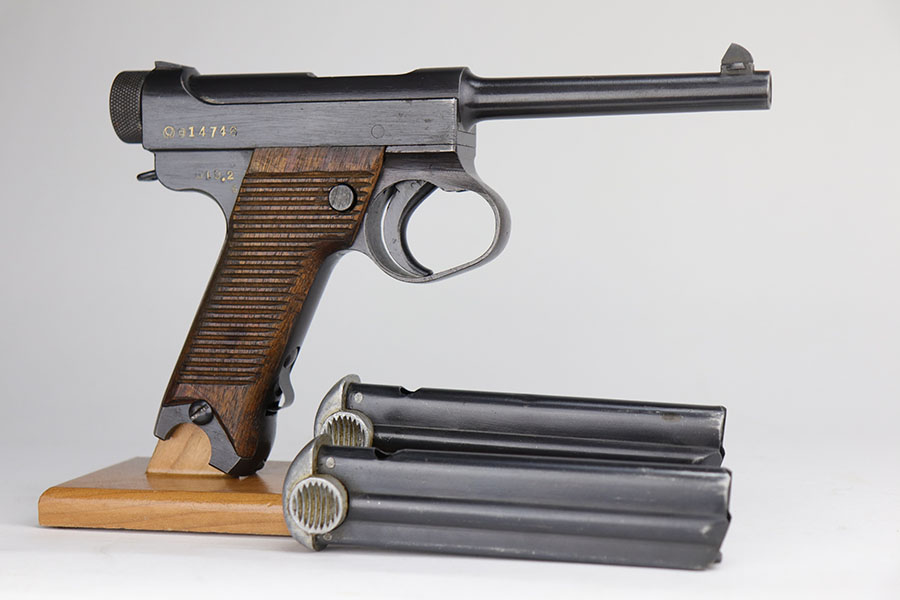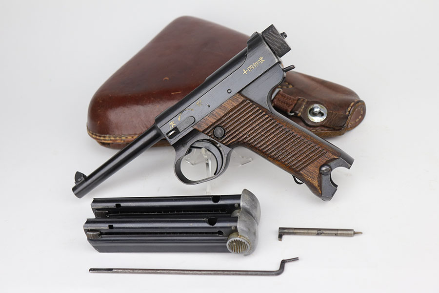 8/25/20 – This is a minty and complete Type 14 Nambu rig, including both matching magazines, matching spare firing pin, and even the holster is numbered to the gun inside. The gun was made in February of 1944 at the Toriimatsu branch of Nagoya Arsenal, second series. It has 98-99% of the original blue with just a few minor hints of holster wear on the high edges. The original matching grips are present and without defect. Bore is mint. Both magazines are factory numbered to the gun. Rig includes an excellent leather holster which has the serial and some Kanji markings on the inside of the top flap. Spare firing pin is numbered to the gun, and an original cleaning rod is included.