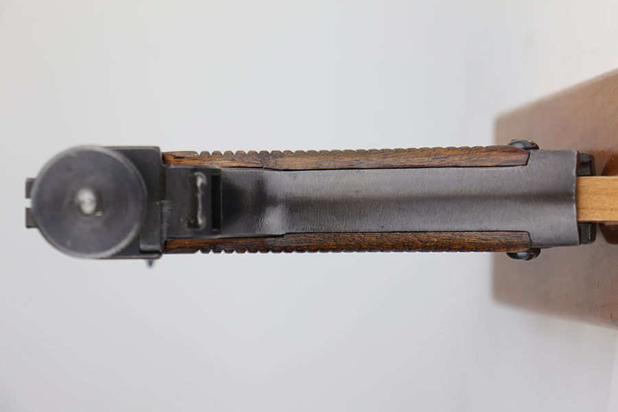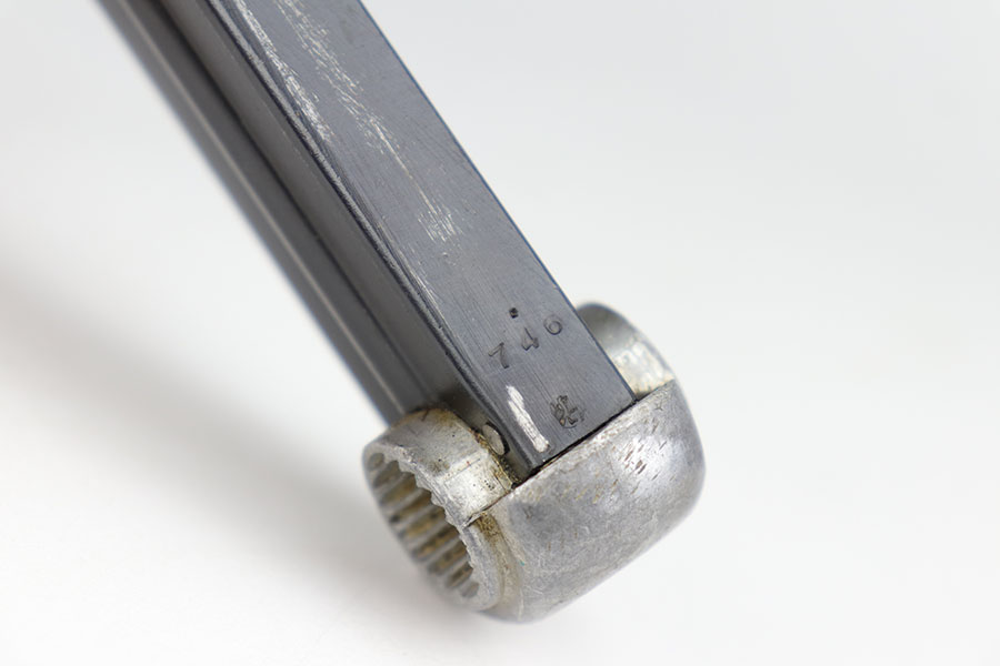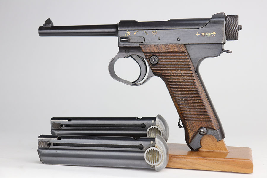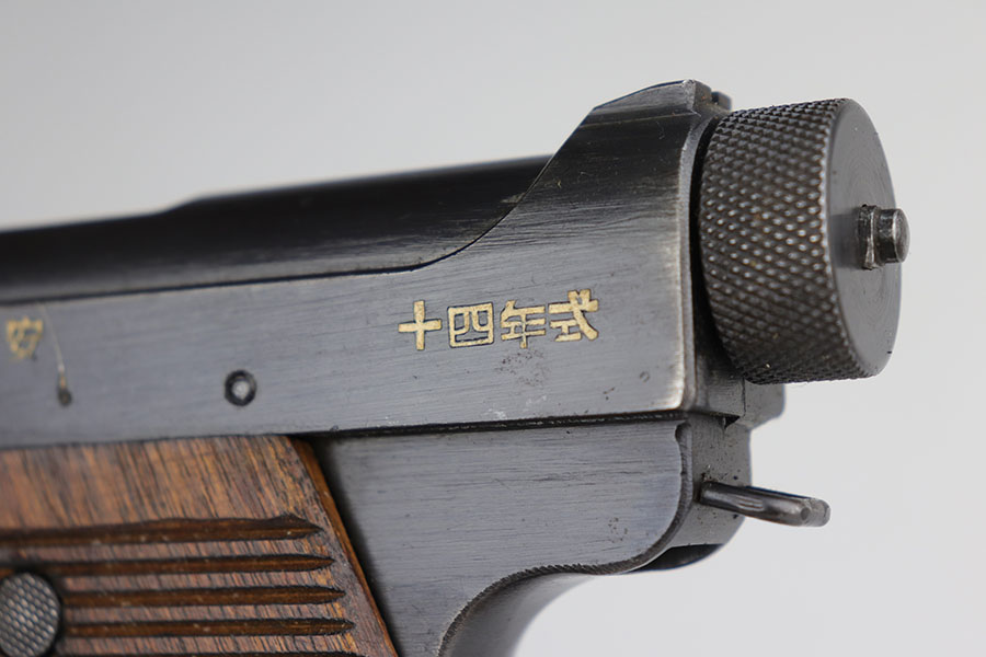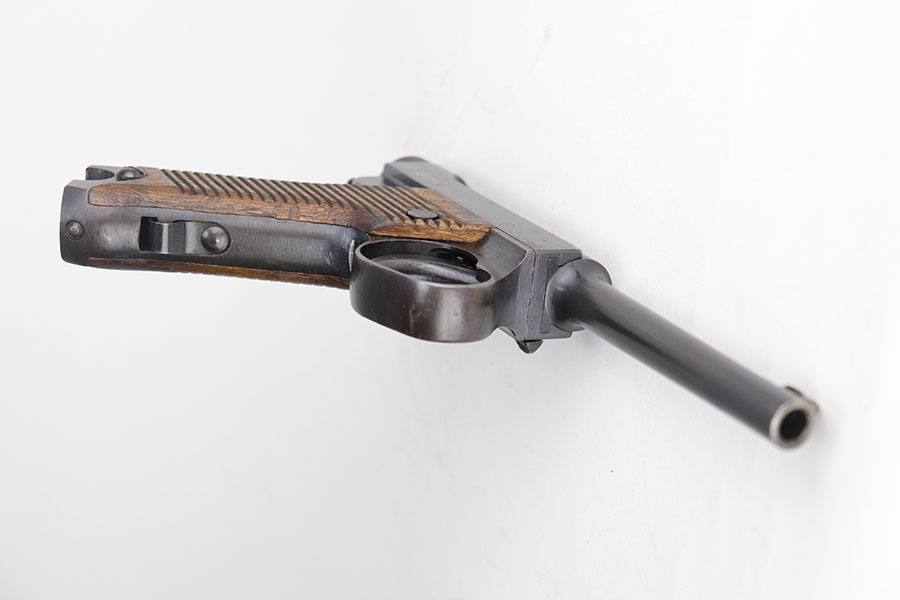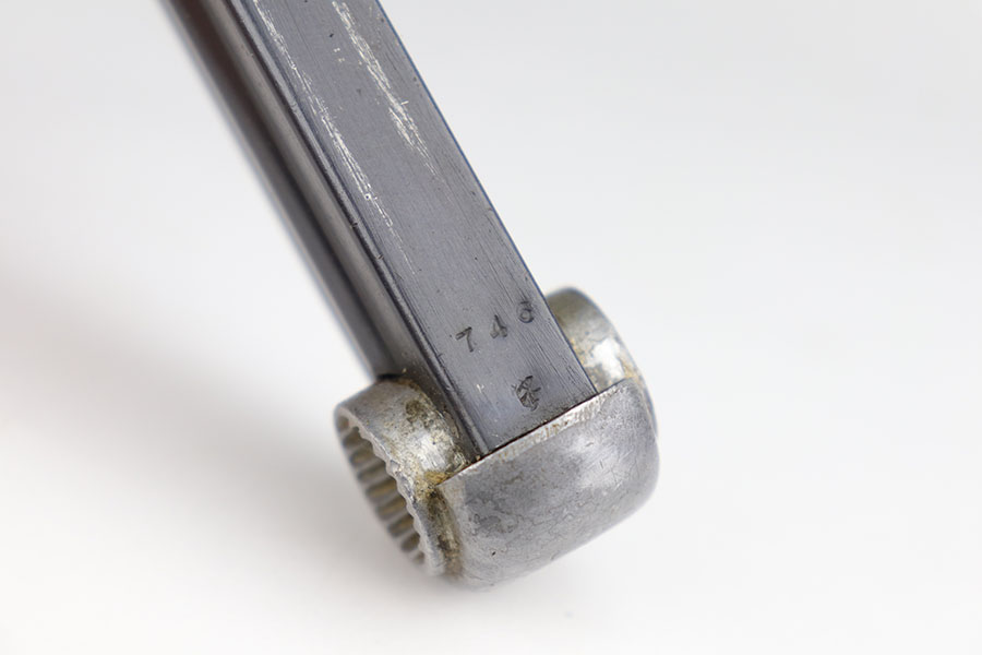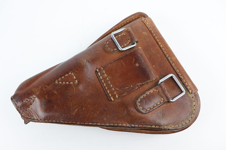 8/25/20 – This is a minty and complete Type 14 Nambu rig, including both matching magazines, matching spare firing pin, and even the holster is numbered to the gun inside. The gun was made in February of 1944 at the Toriimatsu branch of Nagoya Arsenal, second series. It has 98-99% of the original blue with just a few minor hints of holster wear on the high edges. The original matching grips are present and without defect. Bore is mint. Both magazines are factory numbered to the gun. Rig includes an excellent leather holster which has the serial and some Kanji markings on the inside of the top flap. Spare firing pin is numbered to the gun, and an original cleaning rod is included.