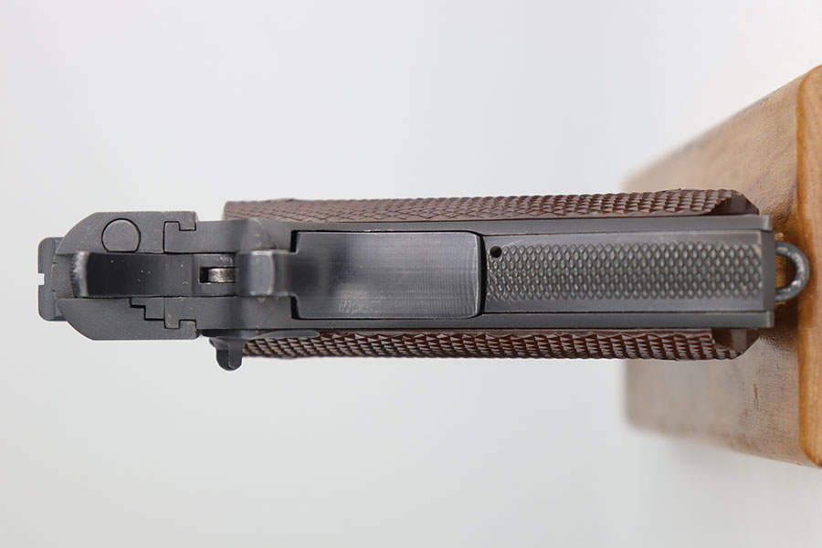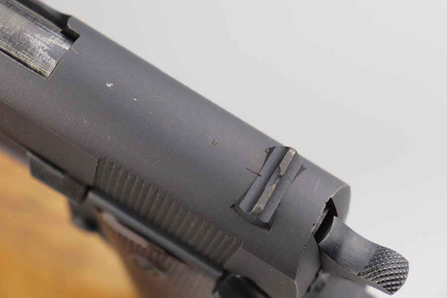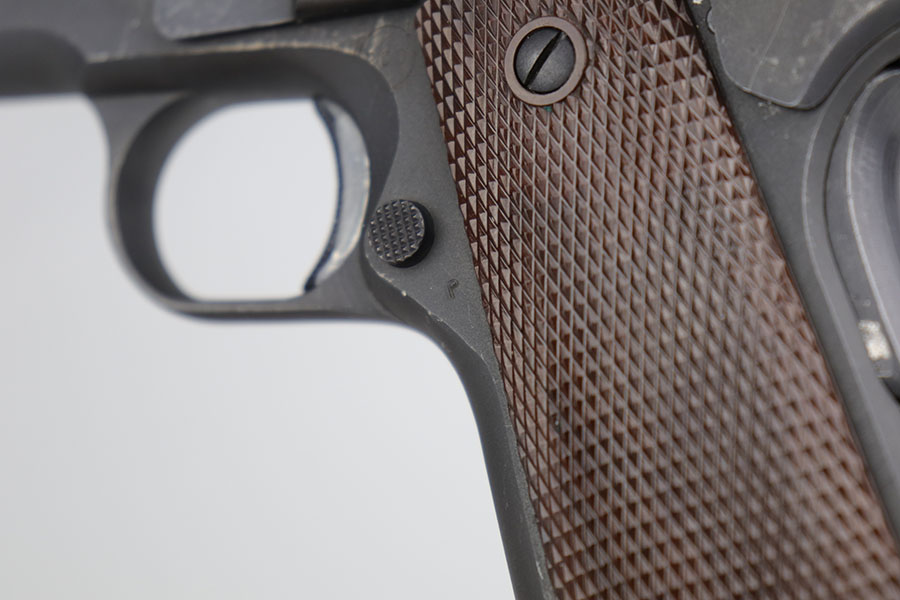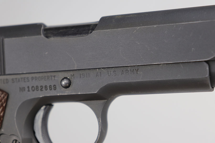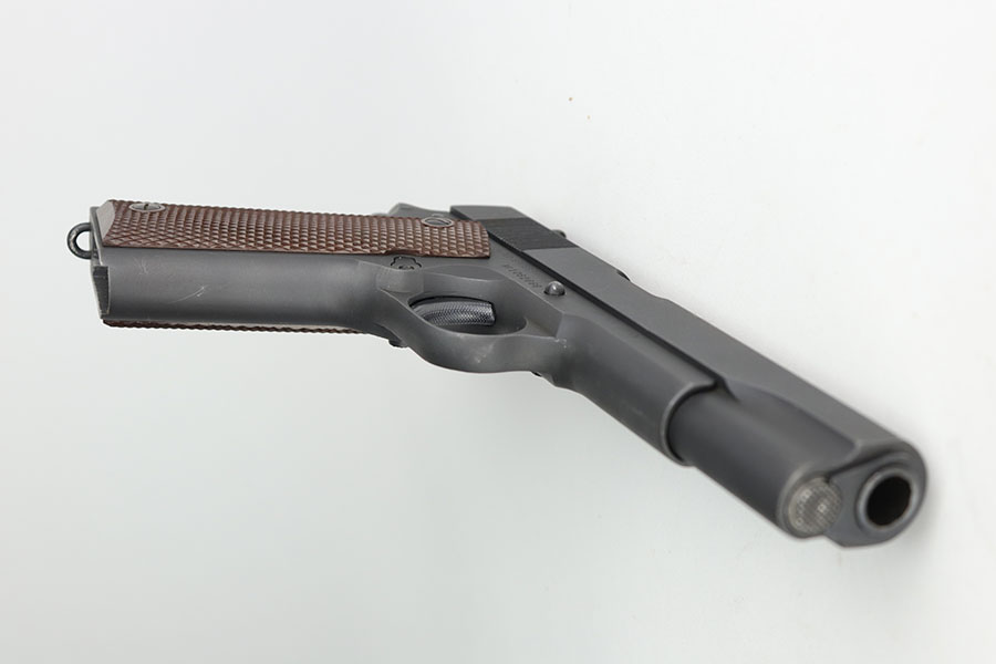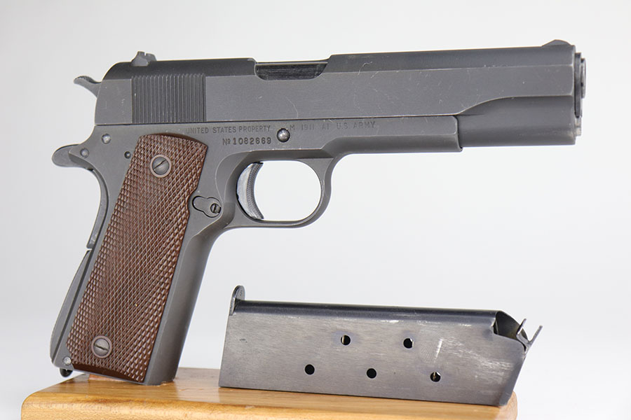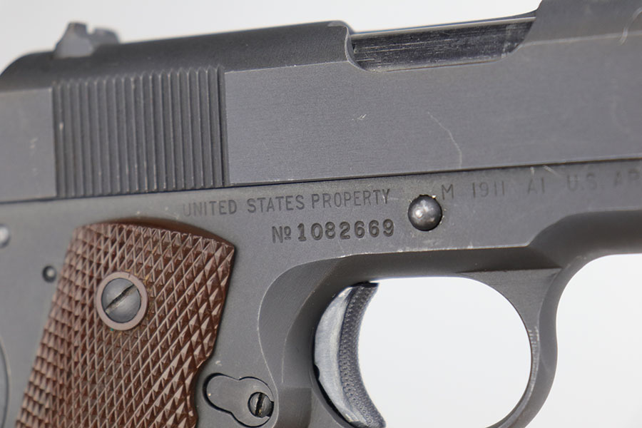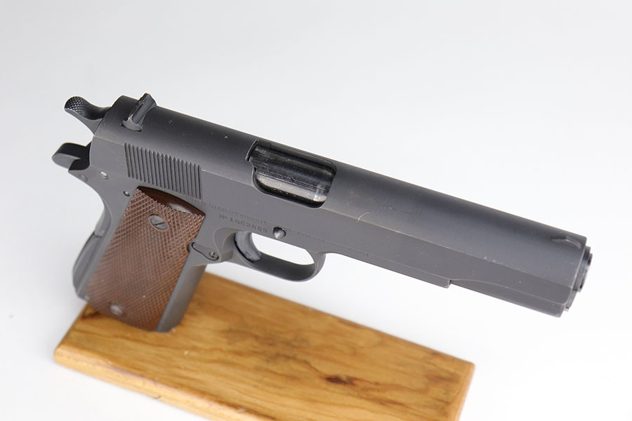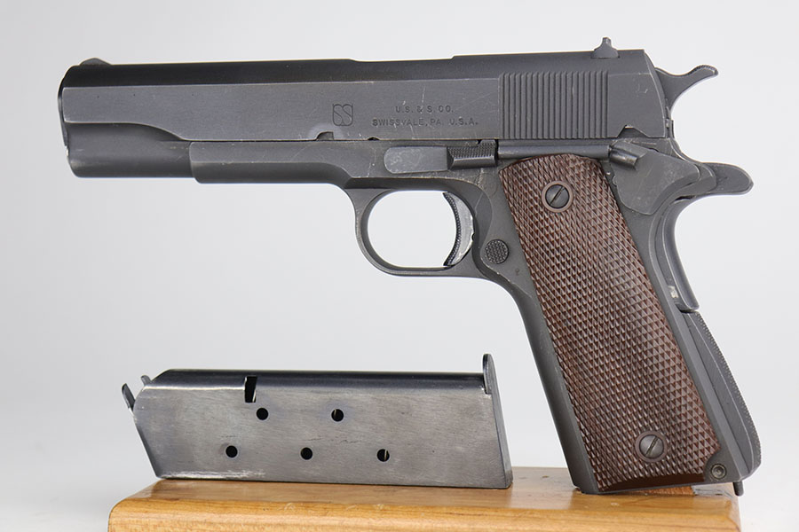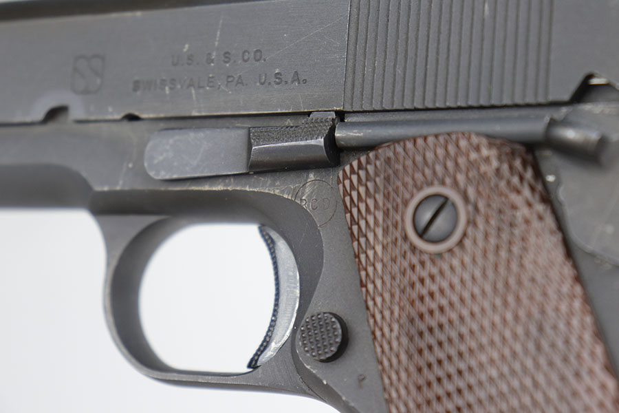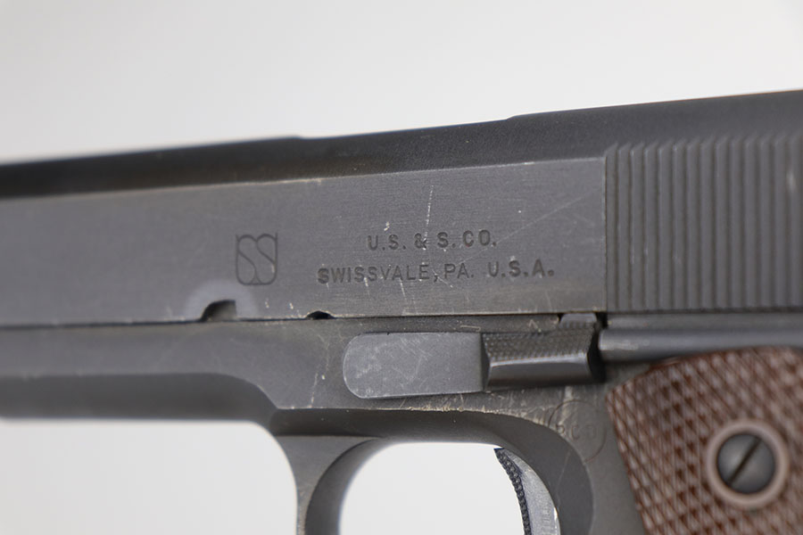 The Union Switch & Signal company of Swissvale Pennsylvania, primarily made railroad signaling equipment but received a contract on May 5, 1942 for the manufacture of M1911A1 pistols. The first pistols were accepted by Ordnance inspectors in January 1943, but the company received word that their contract would be canceled. Within a month U.S.&S. had signed a contract to supply carbine parts. On March 8, 1943 the company was officially notified that their contract had been cut back from 200,000 pistols to 30,000 pistols. However on June 26th, when the contract was nearly complete, and many of the workers had been transferred to Carbine operations, the company received a letter of intent to purchase an additional 25,000 pistols. The last of the pistols was shipped on November 27, 1943. 55,000 Union Switch and Signal pistols were delivered serial numbered from 1041405 to 1096404. U.S.&S. pistols are the second rarest of the M1911A1s (55,000 produced), only the Singer is rarer (500 produced). None of the Union Switch & Signal 1911A1s have the crossed cannons ordnance stamp. We are told these were issued to the Army Air Corps during the war.