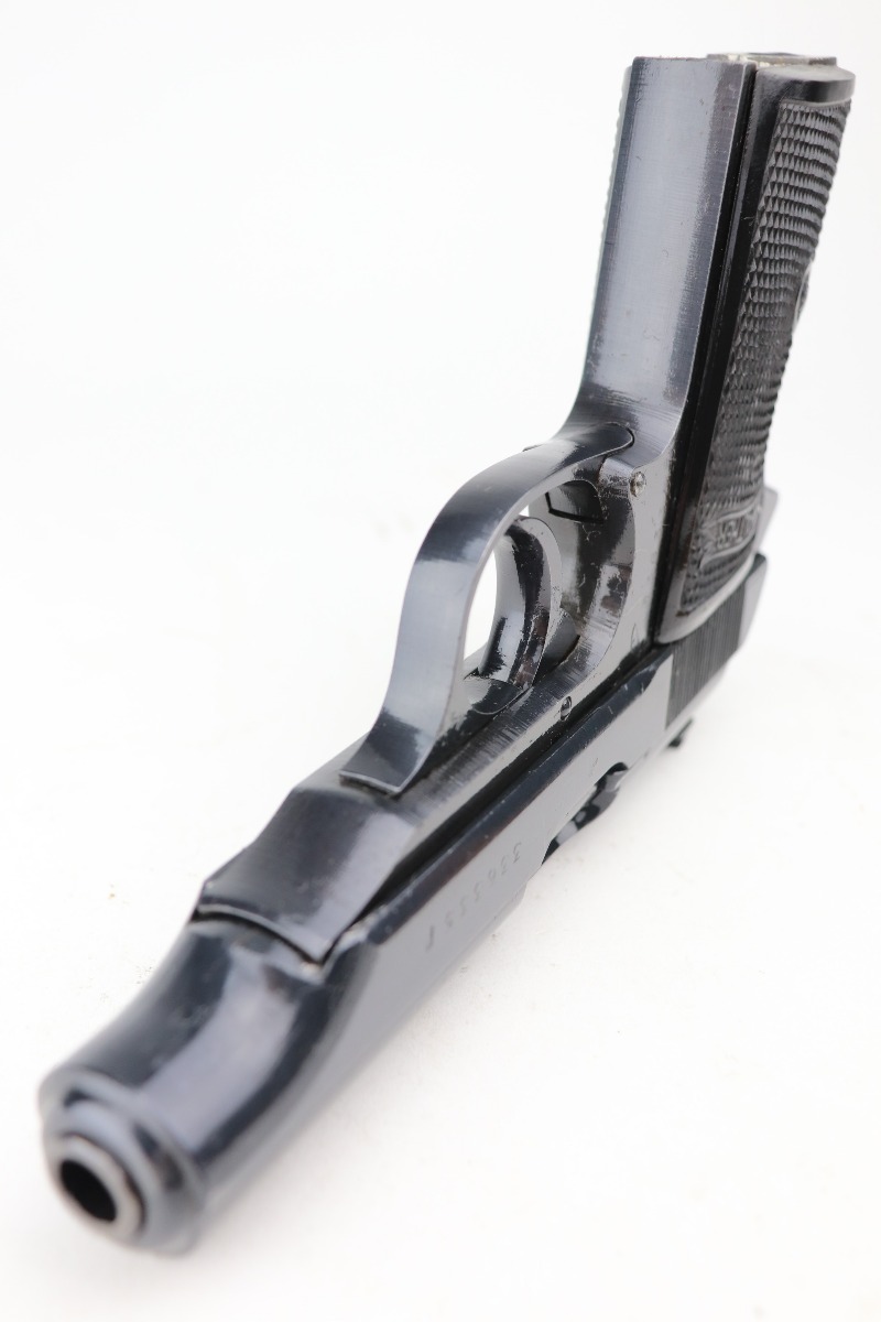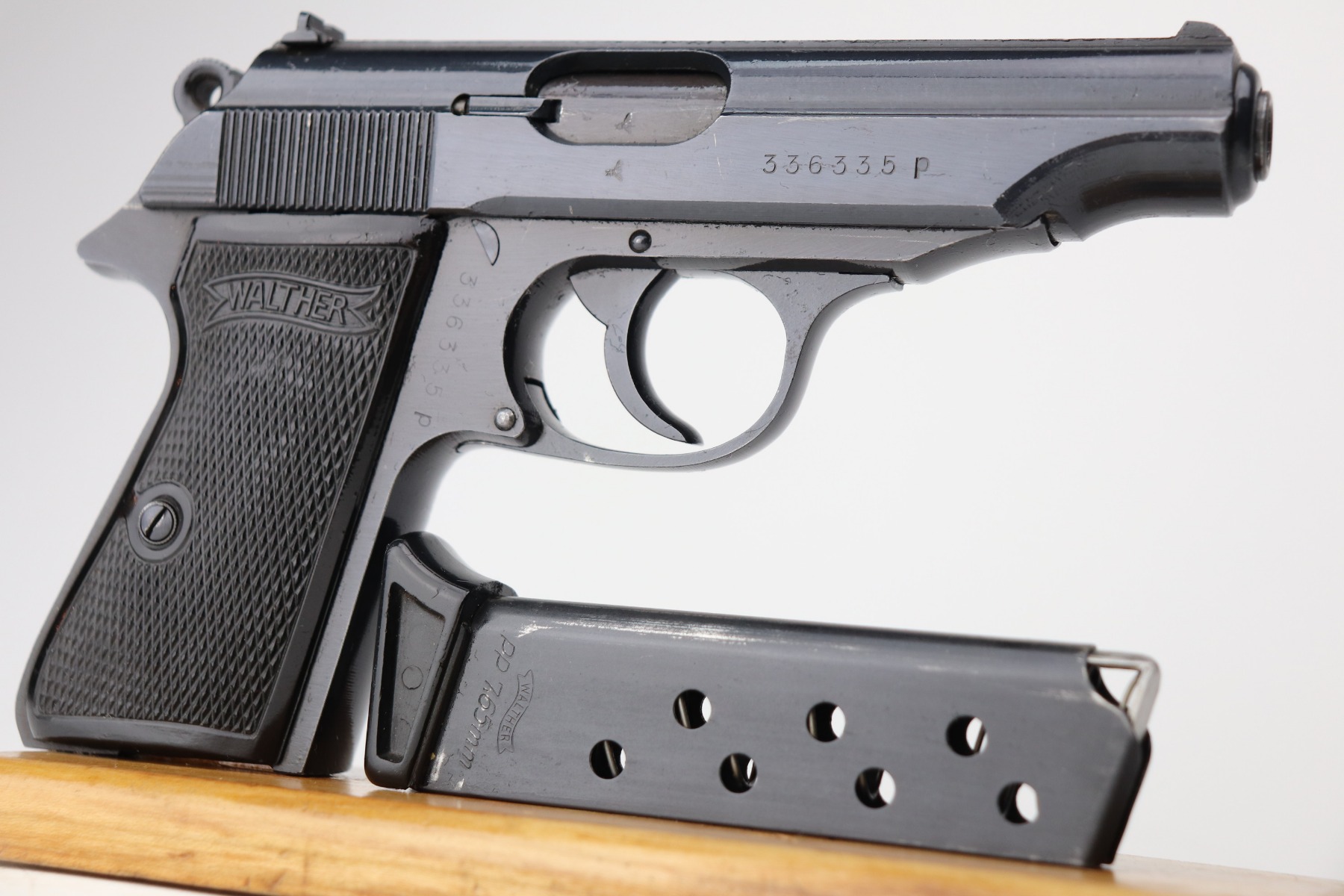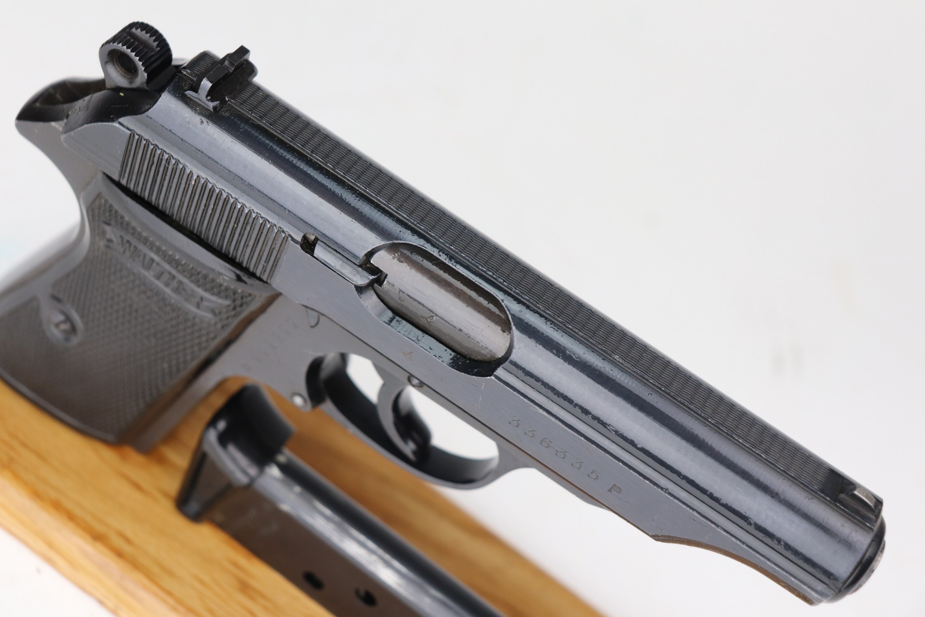 3/1/21 – This is a mint example of a Walther PP issued to the Nazi military in 1944. It is all matching and has the proper “Waffen 359” military proofs. It is in mint condition, retaining more than 98% of its original finish. The only sign of wear is a few very light handling marks here and there. Comes with excellent grips. The gun is photographed with a post-war finger extension magazine. We’ve replaced that with a period-correct finger extension magazine. Mint bore.