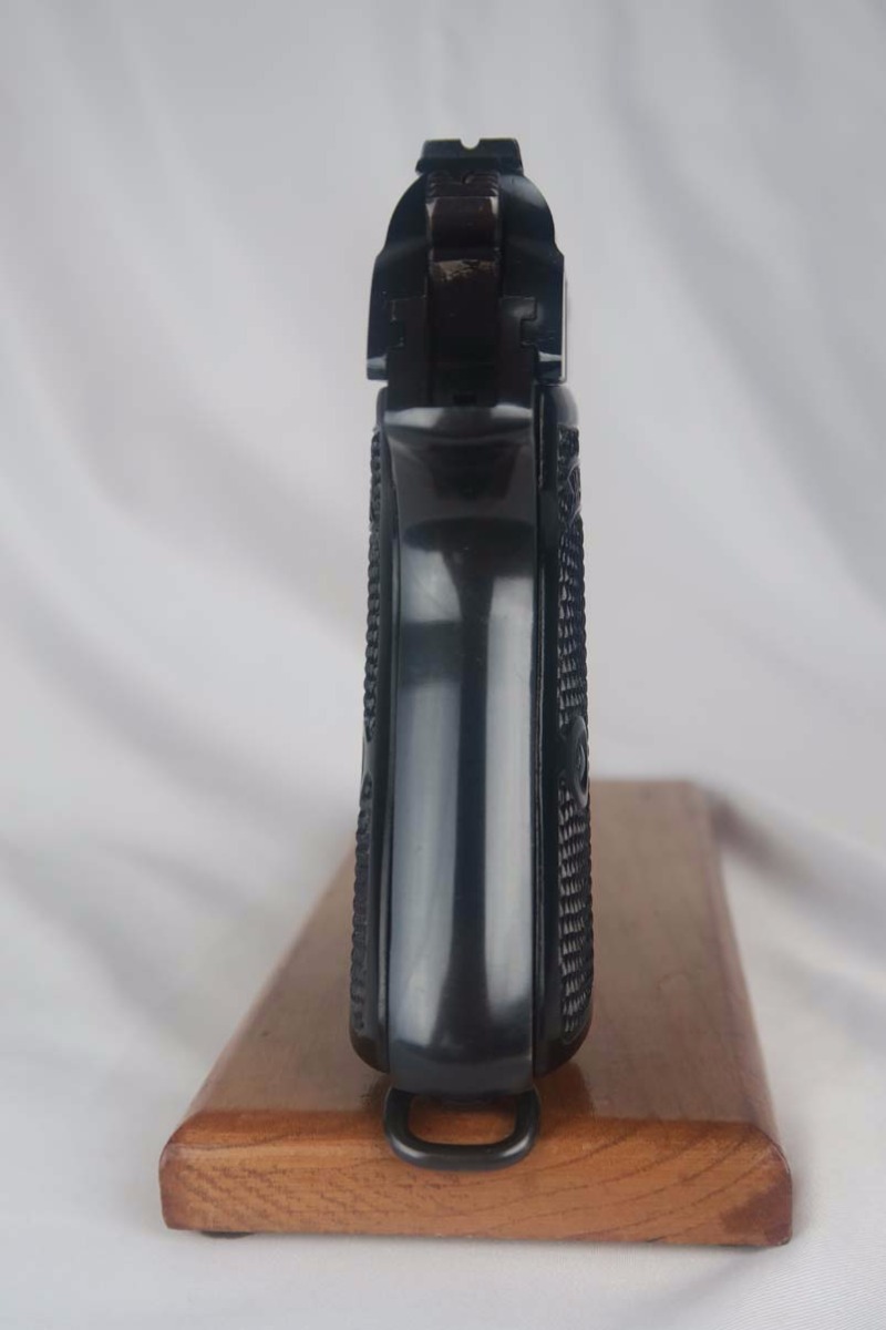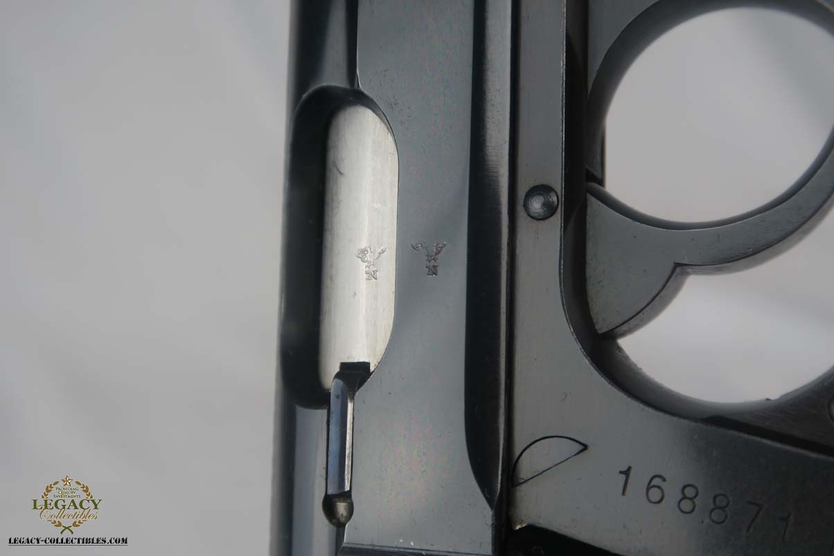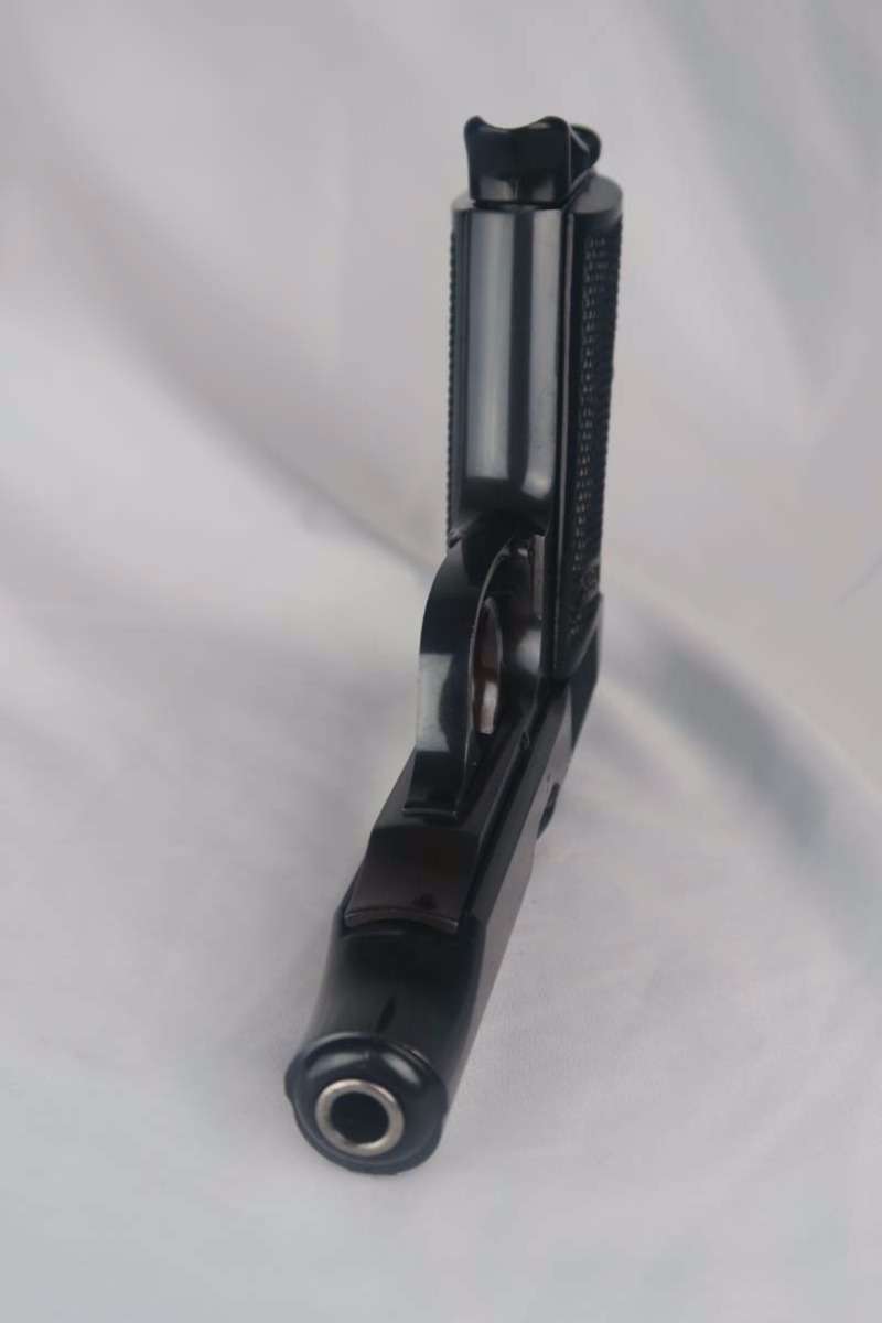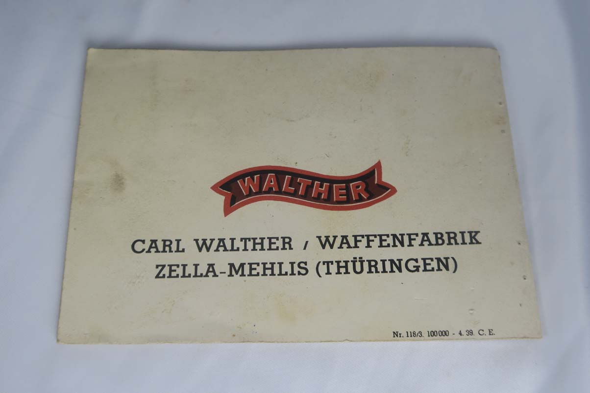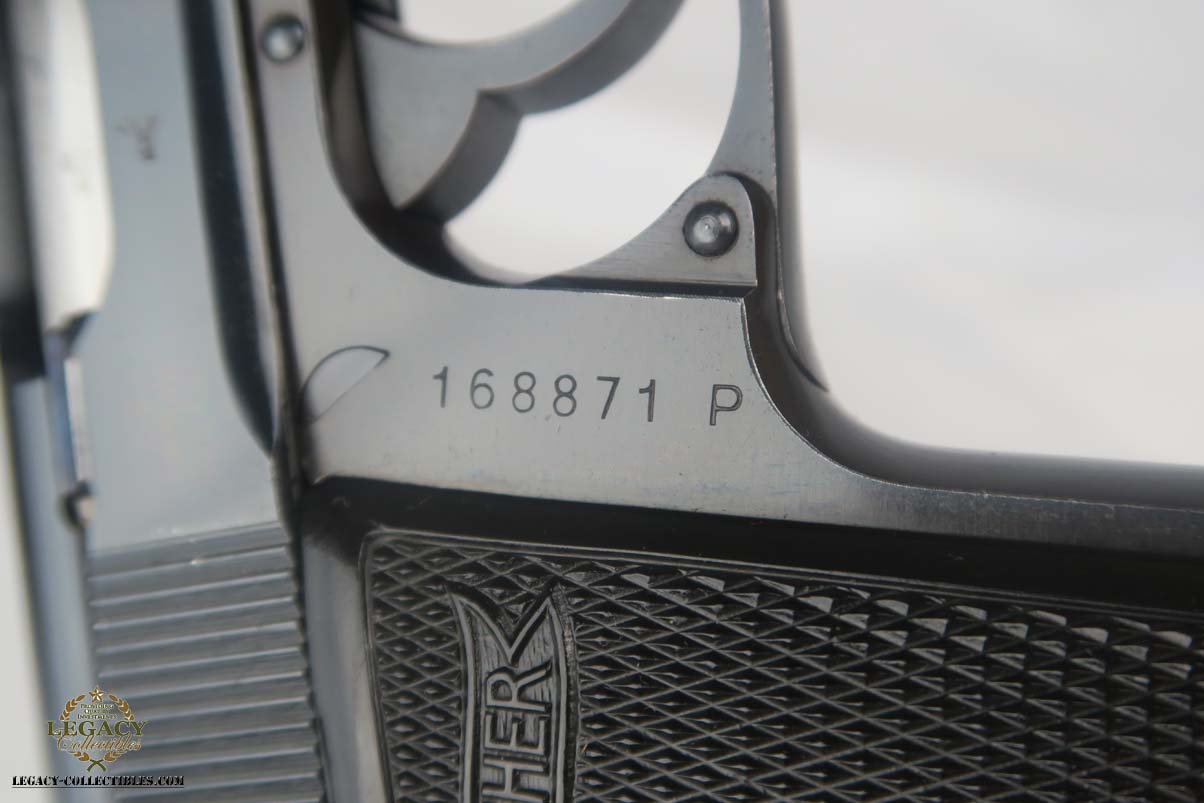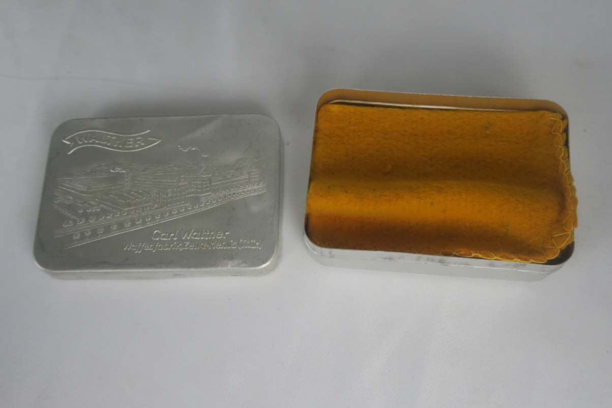 5/22/17 – This is a mint commercial Walther PP in the original matching box.  The finish rates at nearly 100%, with maybe the slightest of muzzle wear.  The numbered box is in very good condition, with the printed matching serial on the label as well as the serial written on the interior of the box.  High-polish PP with Eagle/N proofs on slide and frame.  Comes with a FACTORY installed lanyard(most of these were contracted to Swedish police in 1940).  This listing comes with one original finger extension mag, and one with flat bottom.  Original cleaning tin with rag, but no oiler.  Correct manual is included and dated 4/39.  Excellent bore.