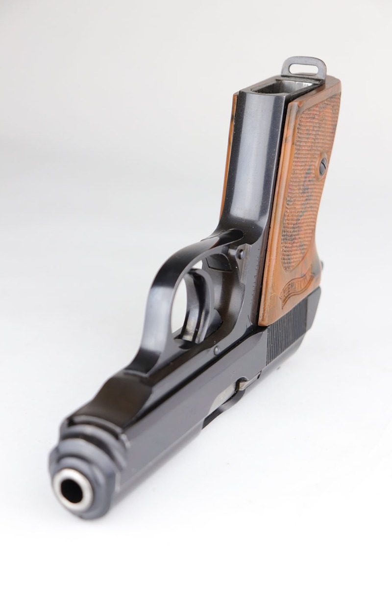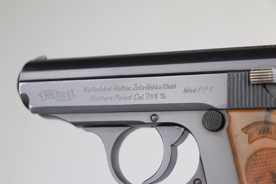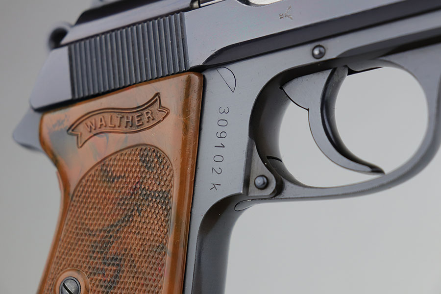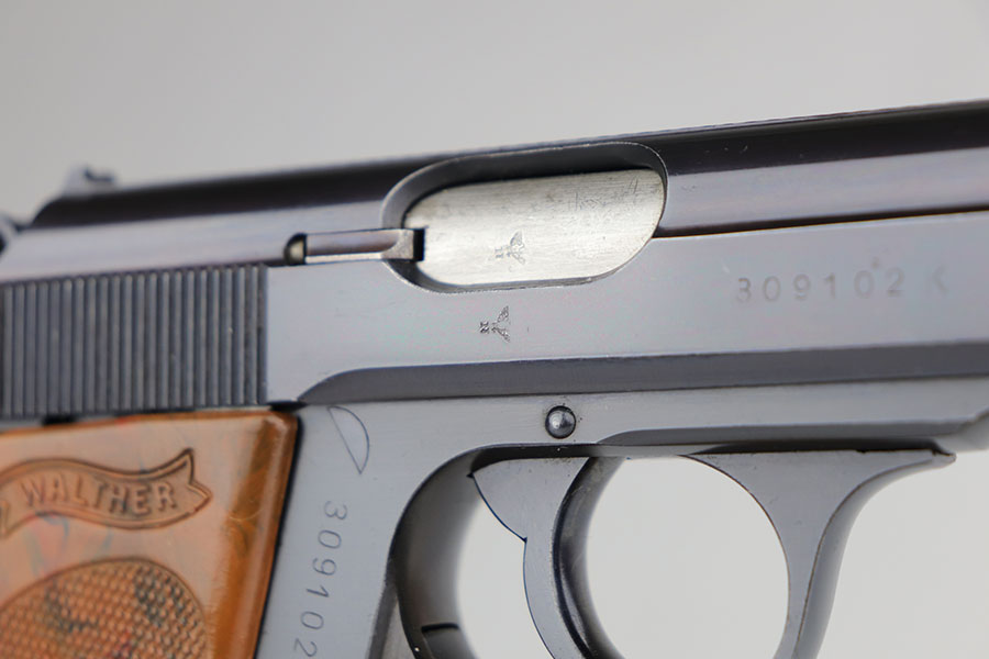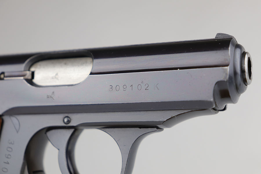 5/13/20 – This is a mint Walther PPK that was part of an SS contract order and still retains one of the matching numbered magazines. It’s a fifth variation SS contract PPK and the high-polish blue is original and rates at 99+% with just a hint of muzzle wear. Mint bore, grip and magazine. SS contract characteristics include the serial range, the serial on slide, and spine numbered magazine that matches the serial of the pistol.