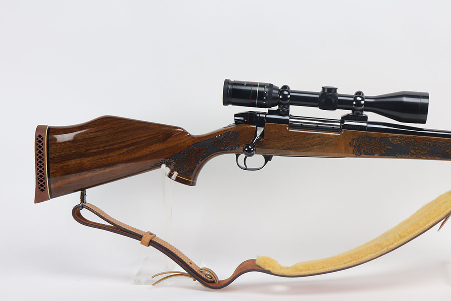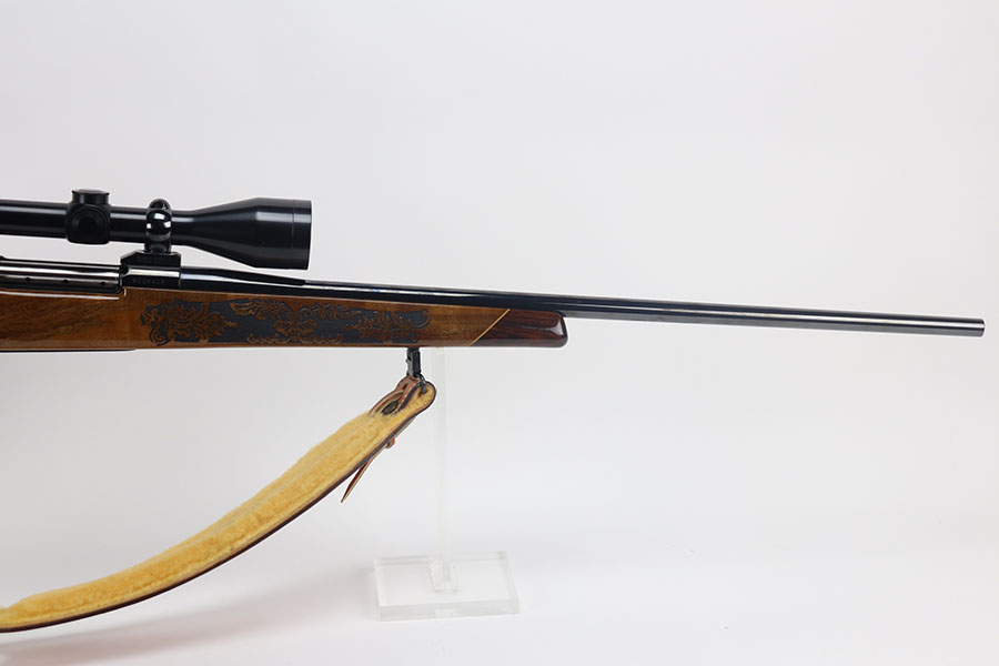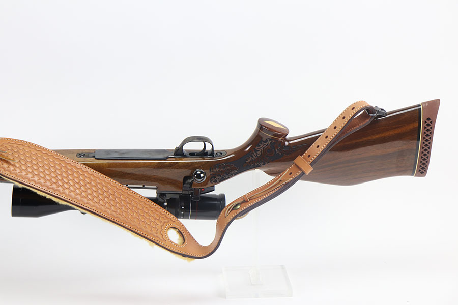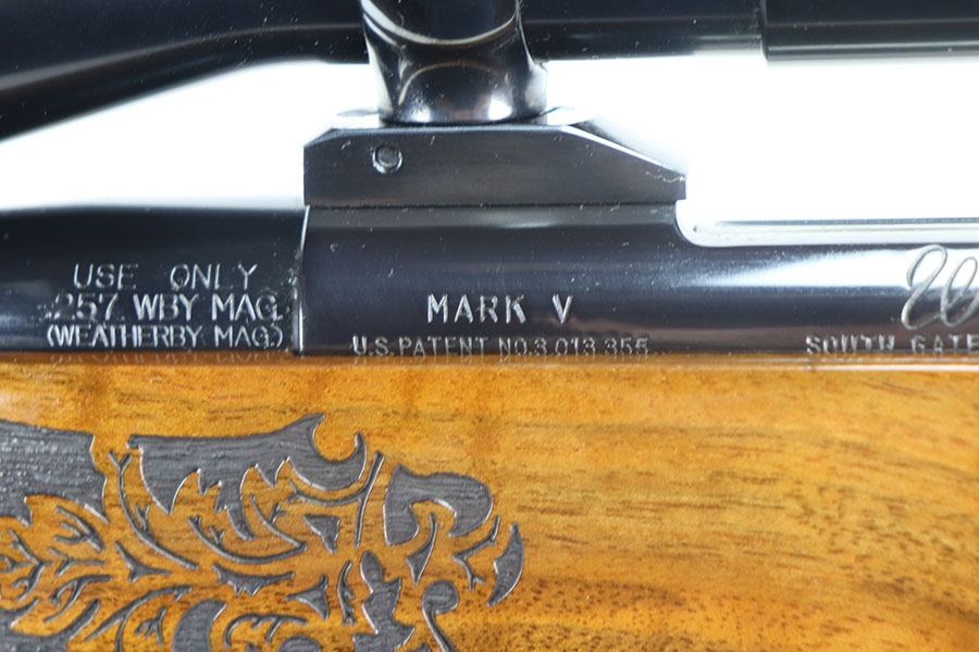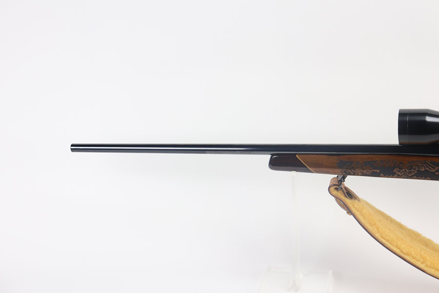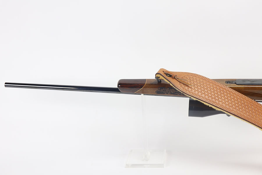 5/21/21 – This is a mint example of a Weatherby Laser Mark V bolt action rifle, chambered in .257 Weatherby Magnum. This particular gun was made in Japan and issued in connection with the Bank of Colorado. The gun is equipped with Beuhler scope rings and an original 3-9x44mm rifle scope (excellent optics). It also comes with a nice padded leather sling. The stock features a beautiful floral engraving. The gun is in like-new condition with no obvious signs of wear. Just some very light cracking in the varnish, near the front of the stock. Excellent bore – shiny with strong rifling.