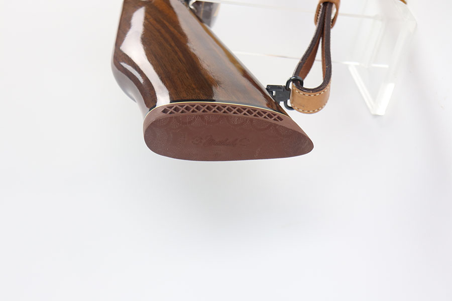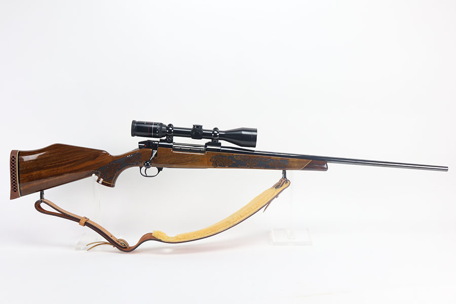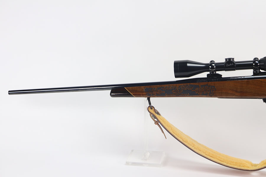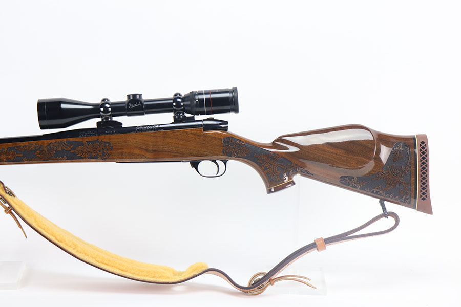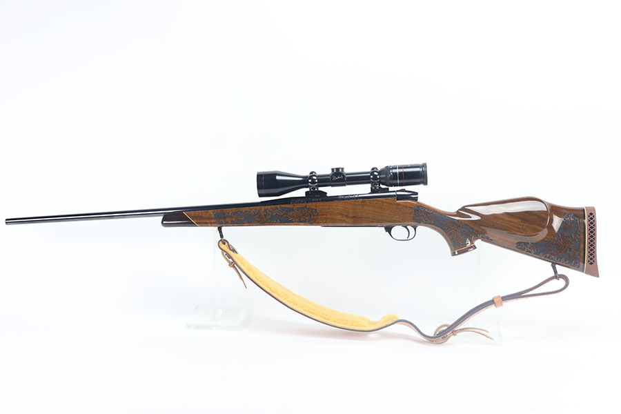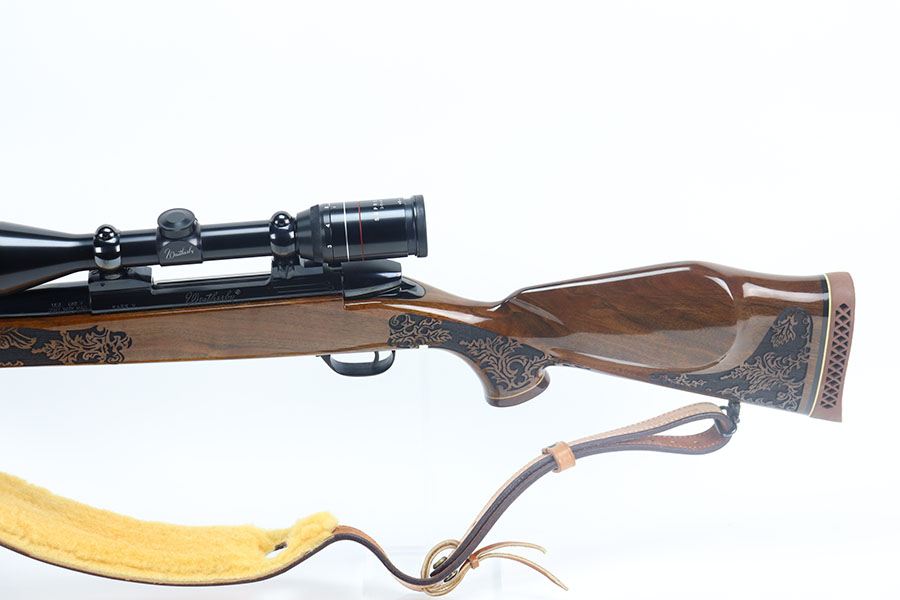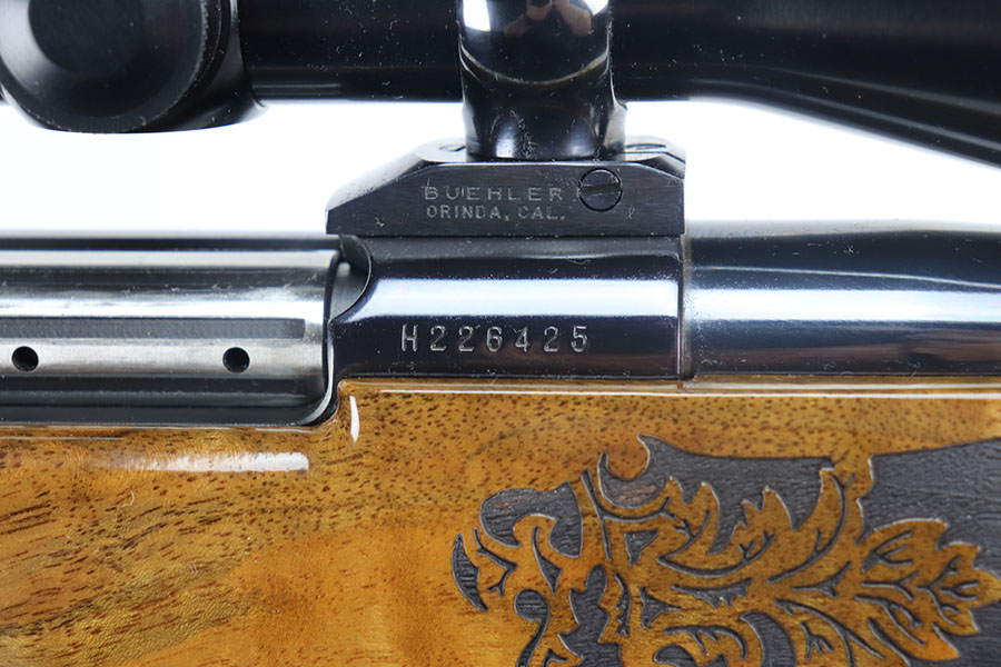 5/21/21 – This is a mint example of a Weatherby Laser Mark V bolt action rifle, chambered in .257 Weatherby Magnum. This particular gun was made in Japan and issued in connection with the Bank of Colorado. The gun is equipped with Beuhler scope rings and an original 3-9x44mm rifle scope (excellent optics). It also comes with a nice padded leather sling. The stock features a beautiful floral engraving. The gun is in like-new condition with no obvious signs of wear. Just some very light cracking in the varnish, near the front of the stock. Excellent bore – shiny with strong rifling.