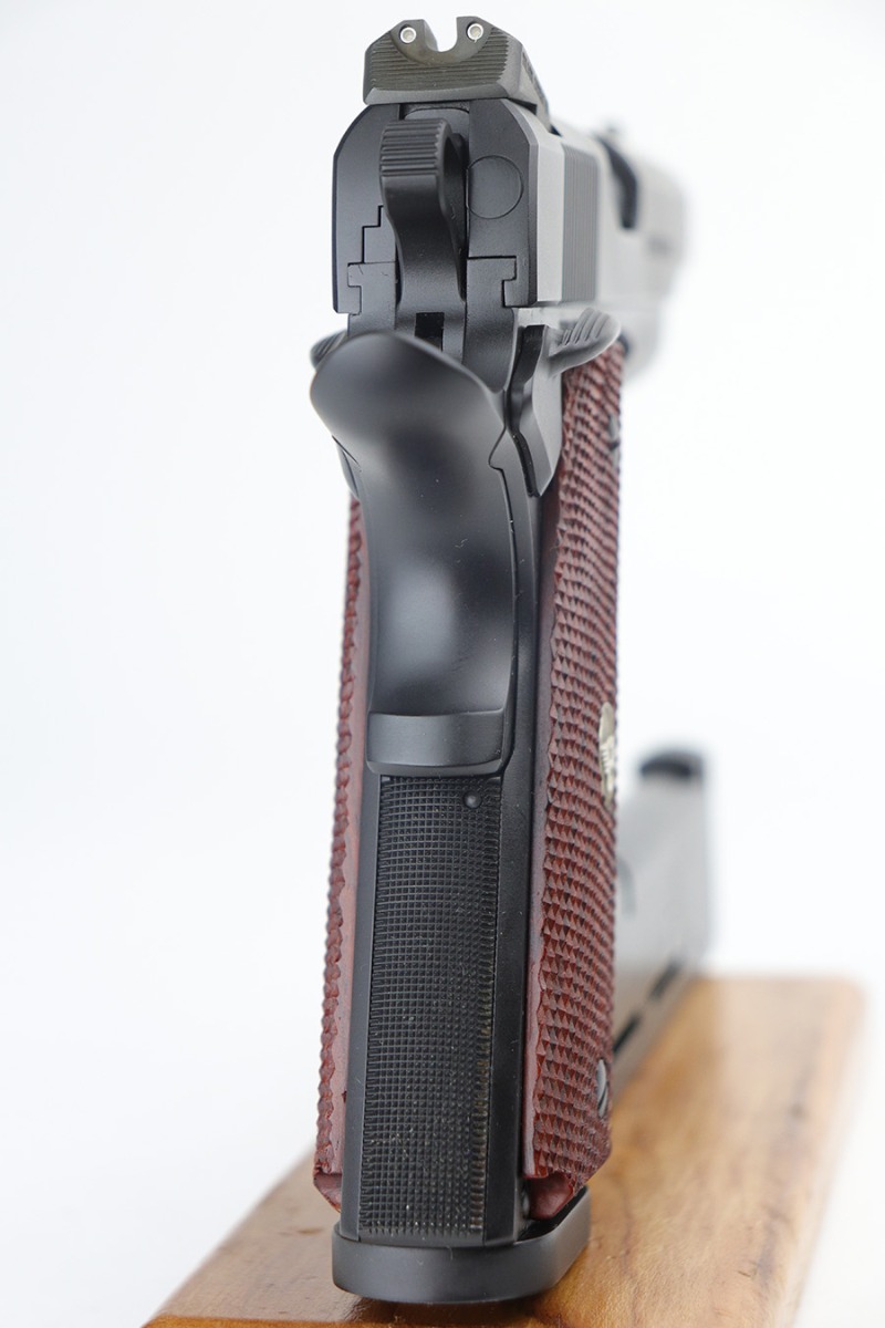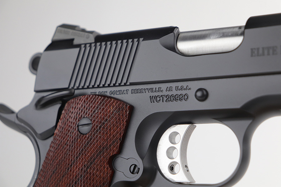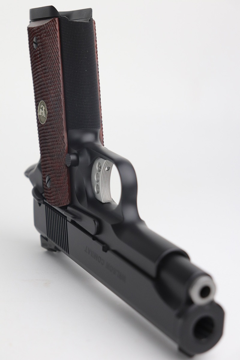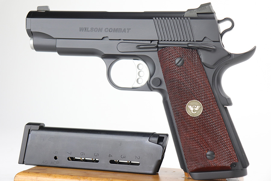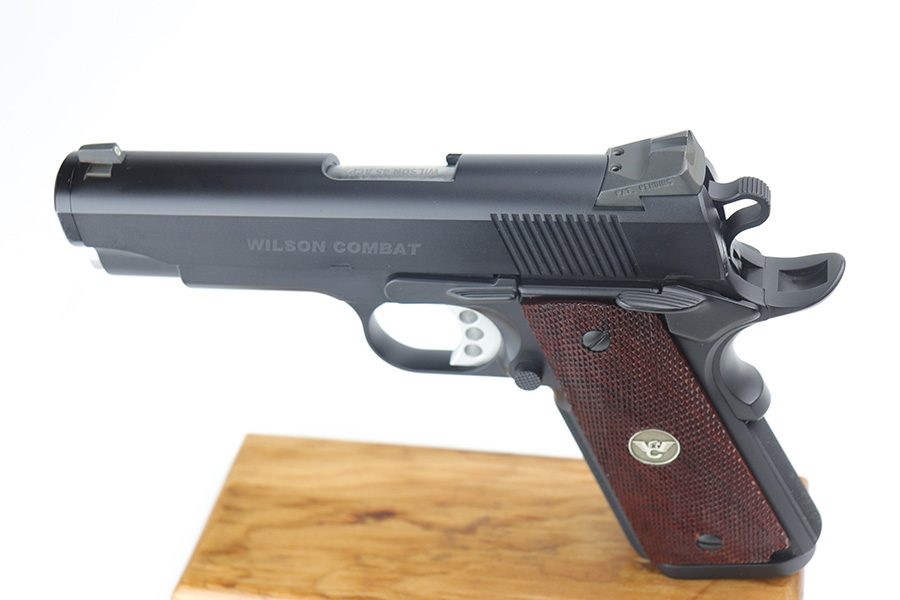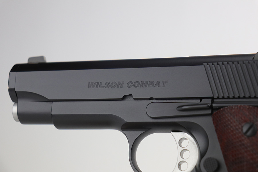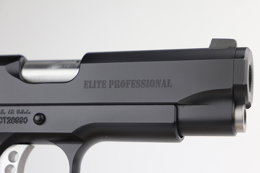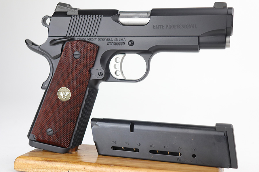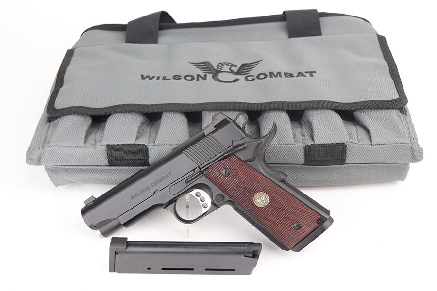 11/29/21 – This is a mint Wilson Combat Elite Professional in the original carry case. From the Wilson Combat website, “The Professional series of pistols are some of the most popular Wilson Combat® builds, and the Elite Professional is the newest member of that series. It includes the best of several of our models, enhanced with a 4 1/16” version of the hand-fit, heavy-flanged cone, match-grade barrel pioneered on our Tactical Elite. With this barrel, we have reduced the slide length by a full inch, giving you a speed advantage in target acquisition with the shorter sighting plane. The frame is the comfortable full size you’re accustomed to in your traditional 1911 pistol, but with the shorter slide the result is excellent concealability. An excellent choice for daily carry, The Elite Professional provides the rapid shot-to-shot recovery and reduced recoil one would expect from a compensated pistol. You can be sure of 100% functional reliability, fast handling, rapid shot-to-shot recovery and accuracy when you need it.” This particular example is in nearly unfired condition, with a mint bore and just the tiniest hint of muzzle wear. It comes with the original carry case, which has a spare magazine, test target, lock and gun cloth. FFL required.