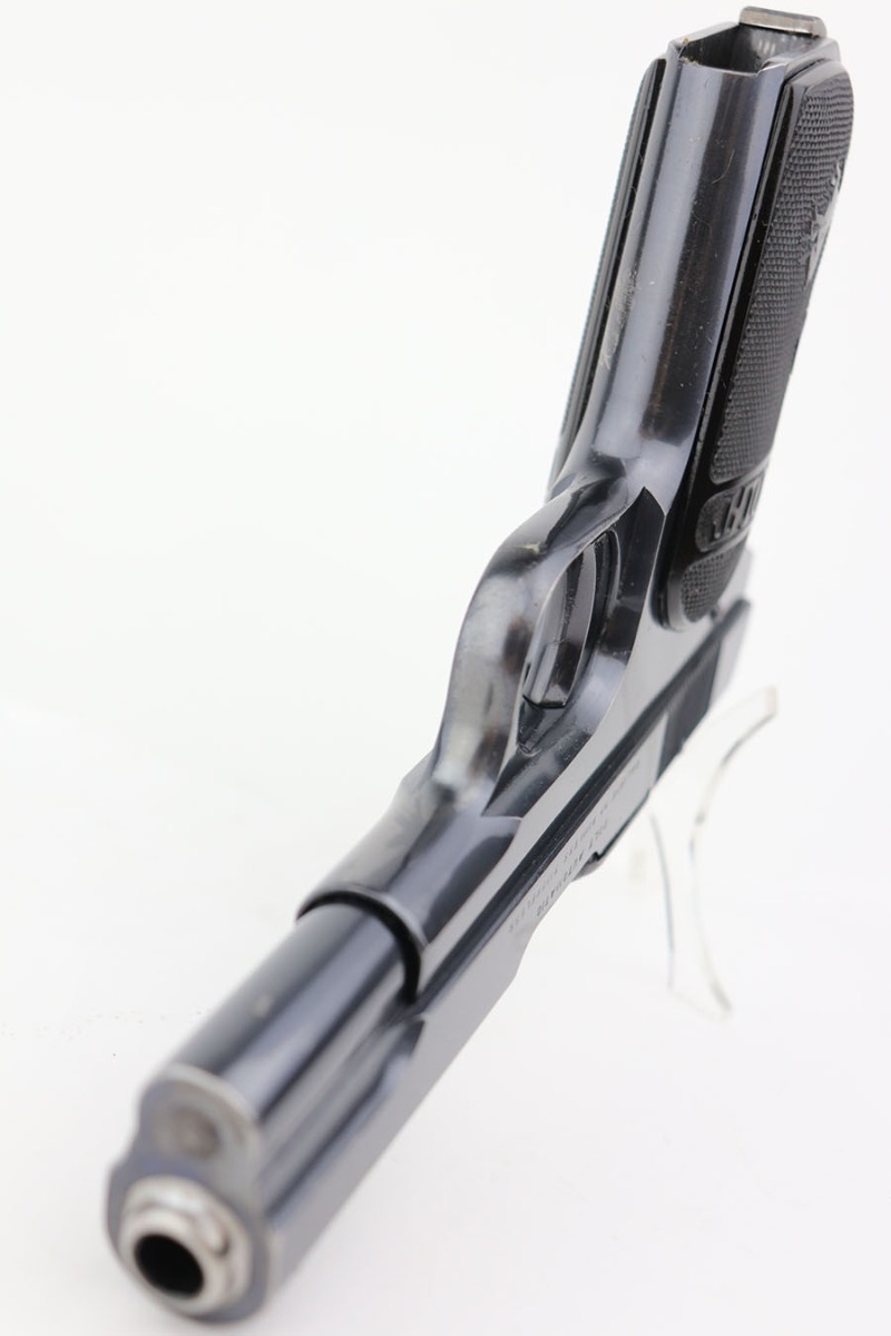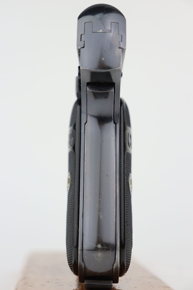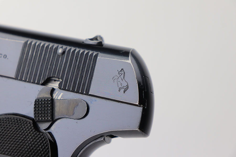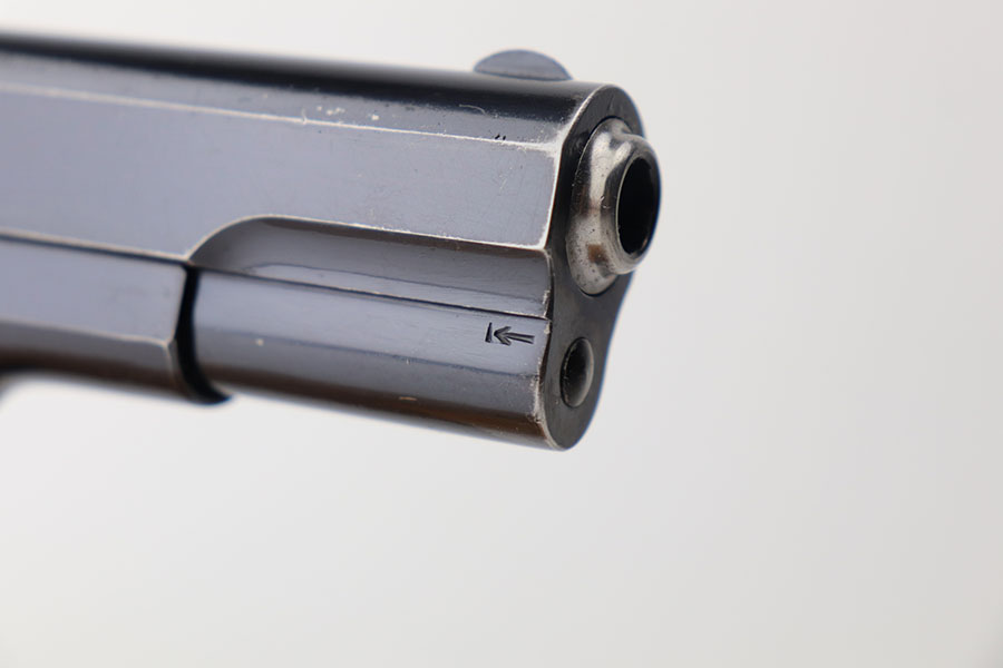 4/14/21 – This is a beautiful, early and all original Colt Hammerless model 1903. Made in 1916 with a shiny blued finish. Overall the finish is about 98% with original grips and a correct magazine. Mechanically excellent with a minty bore. Slide is matching numbered to the frame. The only wear on the pistol is some mild edge wear, a spot of finish loss on the front strap, and some general thinning of the finish on the back strap.