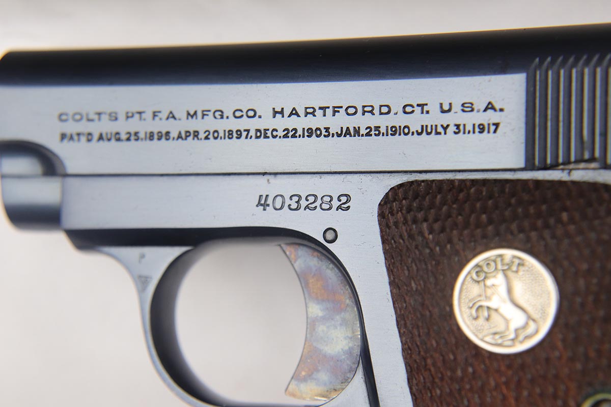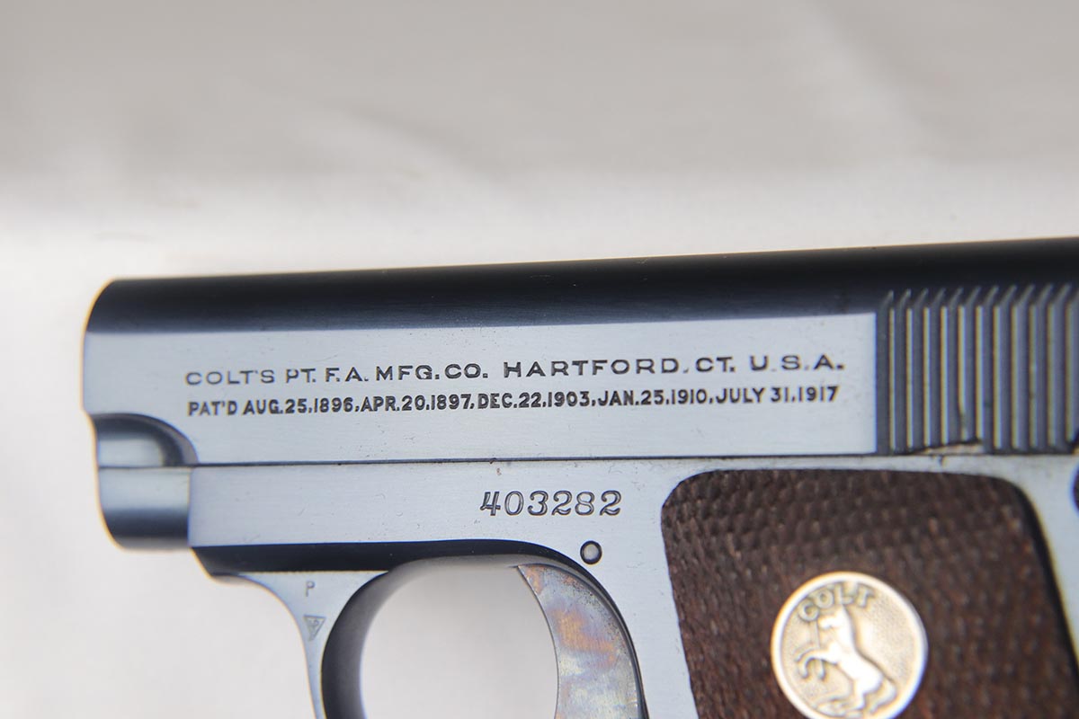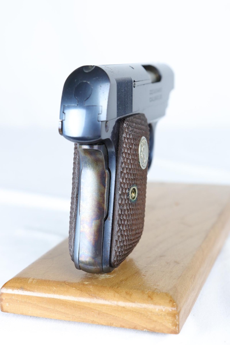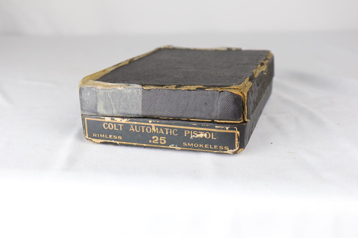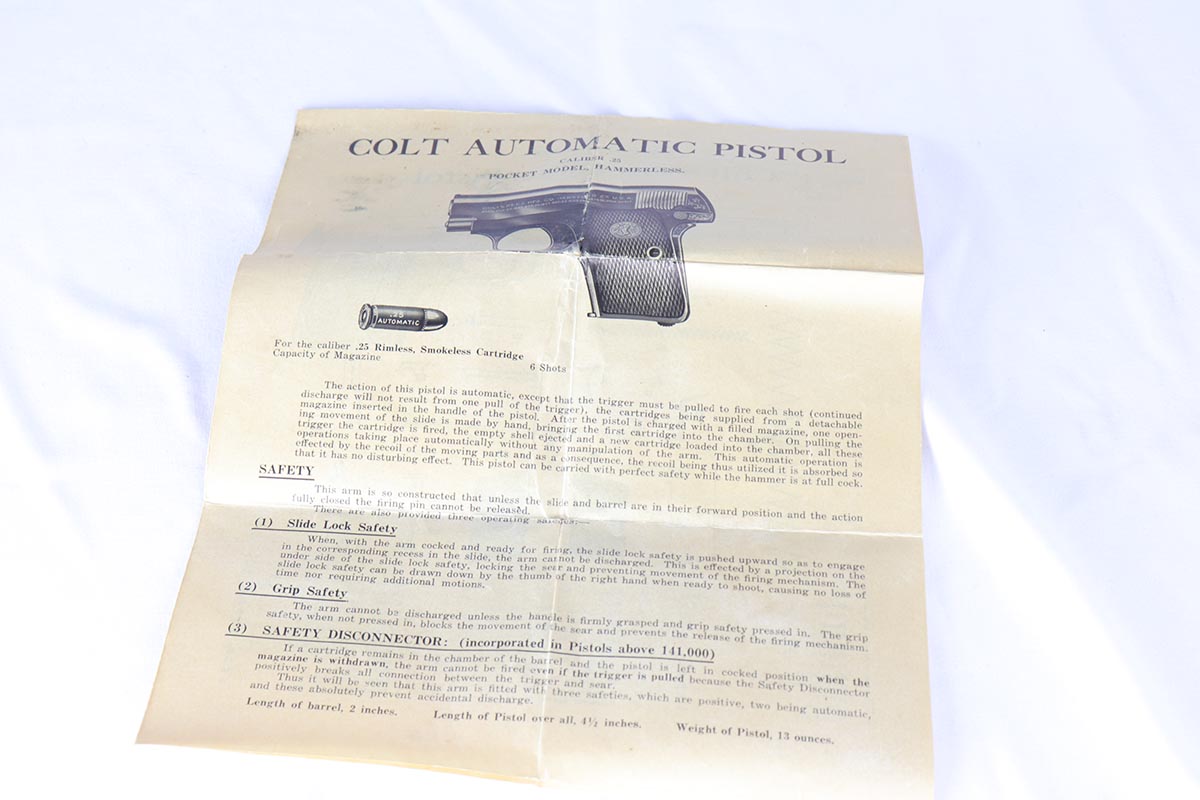 4/10/18 – This is a gorgeous 1908 Colt Vest Pocket in near-mint condition with original matching box. The finish on the pistol rates at 99% with just a tiny spot of wear on the front strap. The safety, trigger and grip safety are all beautifully case hardened, and the photos don’t quite do it justice. Manufactured in 1936 and chambered in .25 caliber. The original box is hand numbered to the pistol on the bottom, and is in decent condition but a previous owner did apply tape the edges to hold a couple of the edges together.