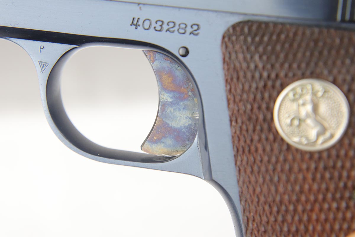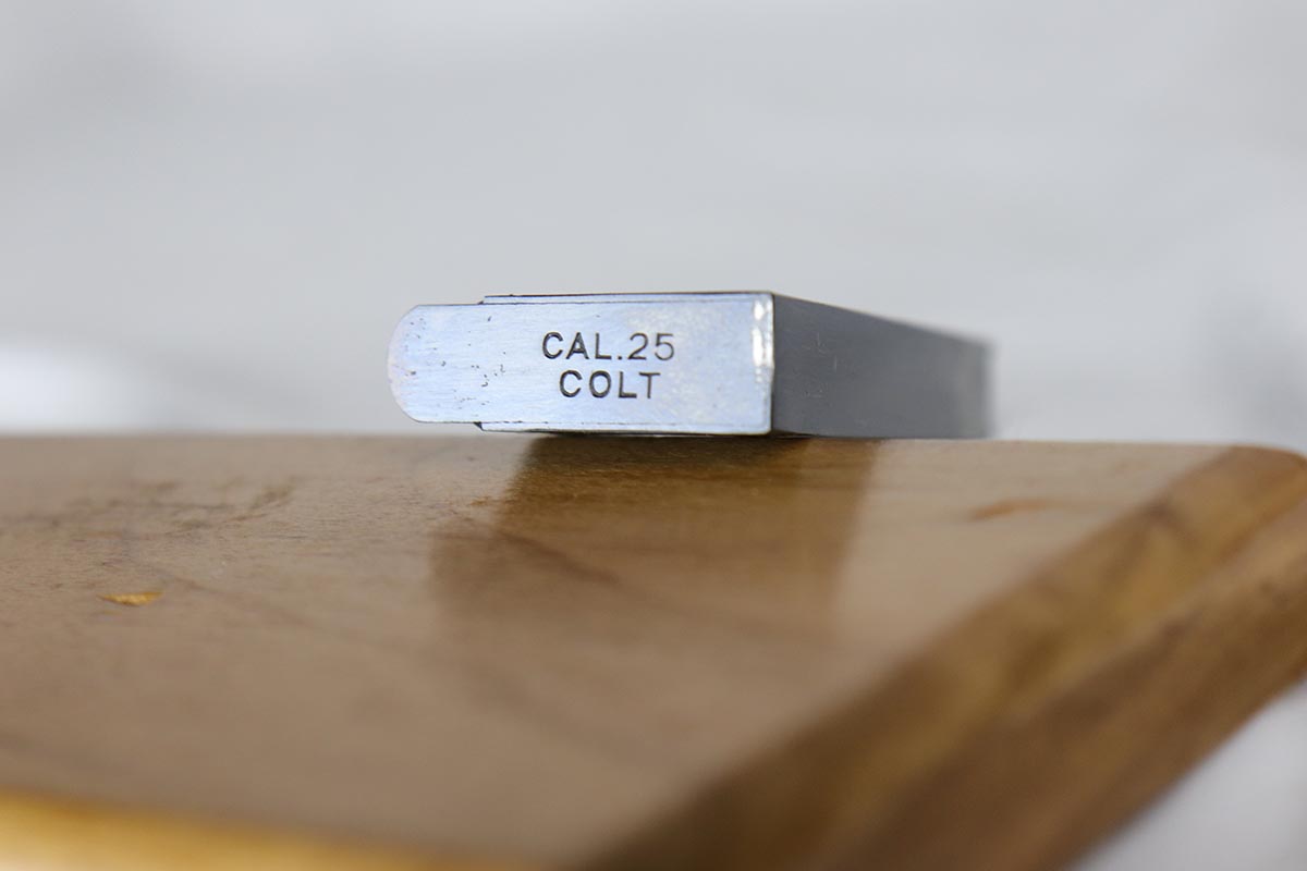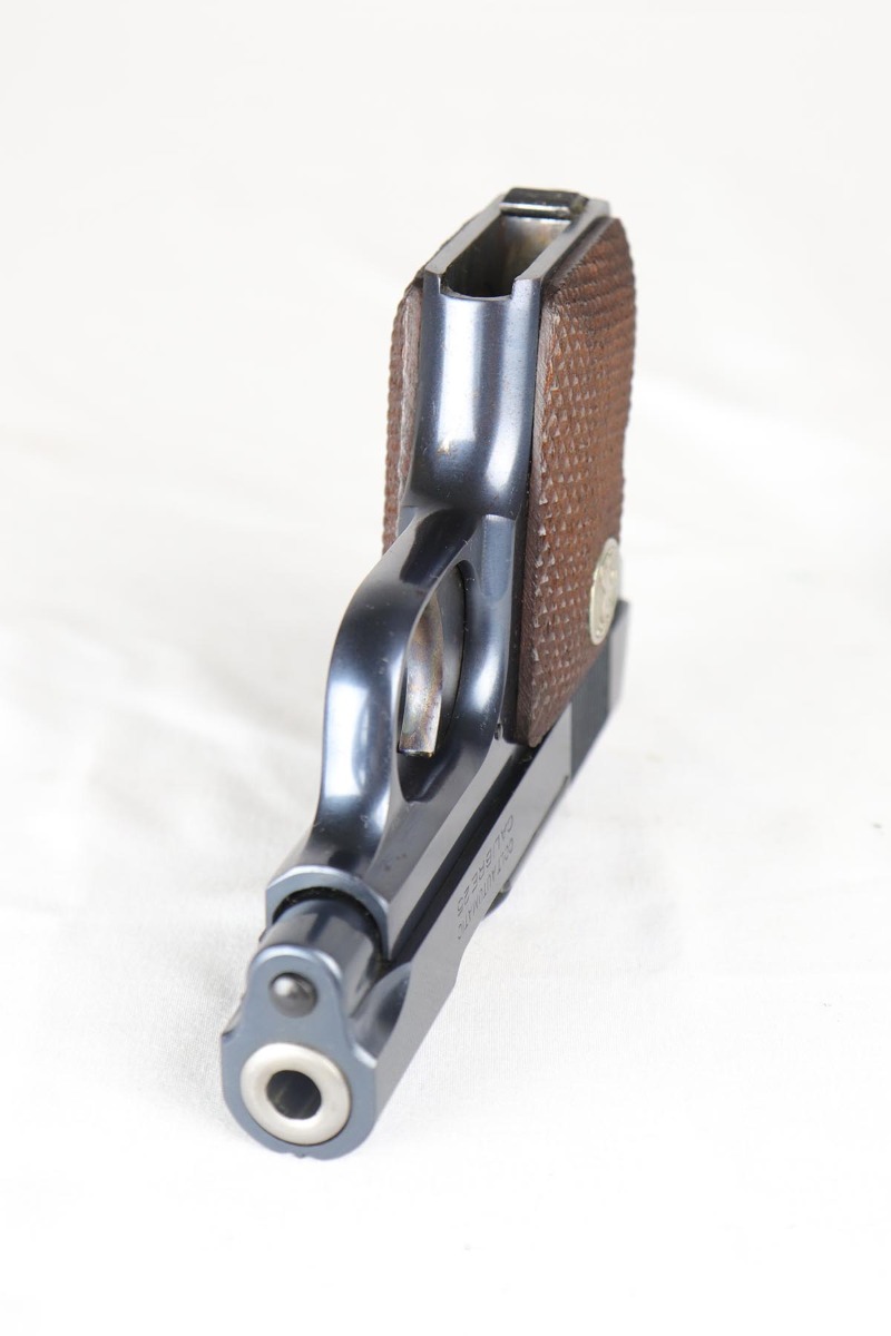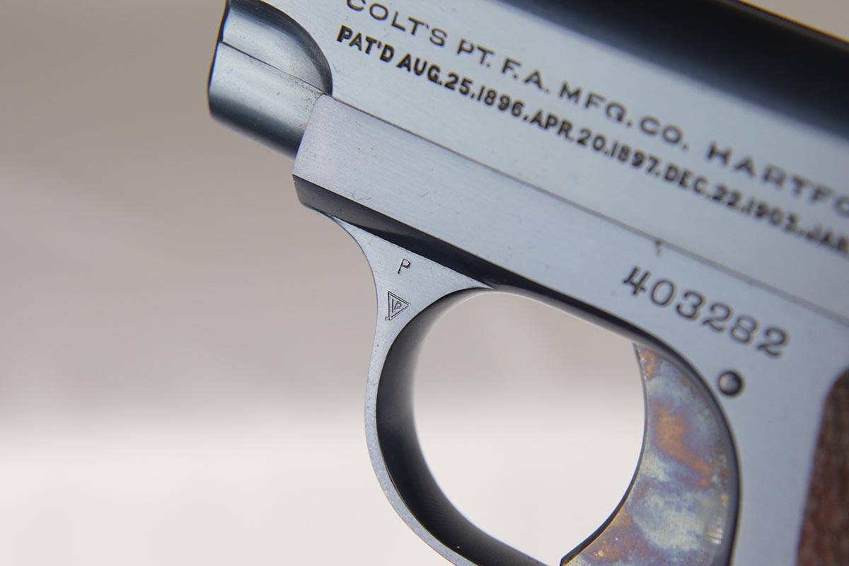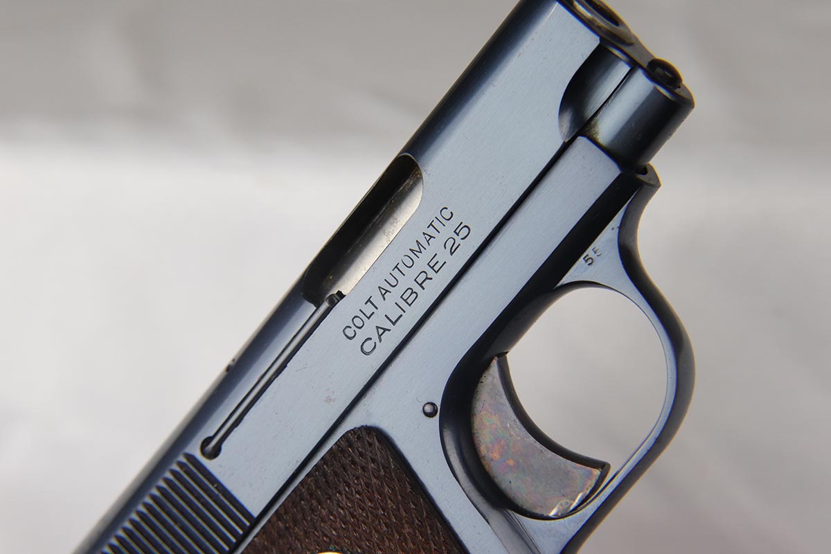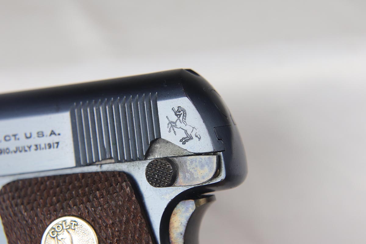 4/10/18 – This is a gorgeous 1908 Colt Vest Pocket in near-mint condition with original matching box. The finish on the pistol rates at 99% with just a tiny spot of wear on the front strap. The safety, trigger and grip safety are all beautifully case hardened, and the photos don’t quite do it justice. Manufactured in 1936 and chambered in .25 caliber. The original box is hand numbered to the pistol on the bottom, and is in decent condition but a previous owner did apply tape the edges to hold a couple of the edges together.