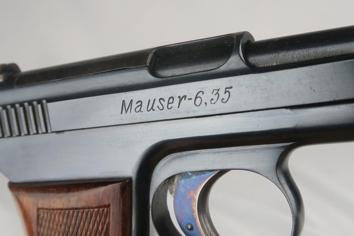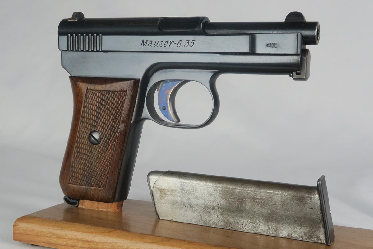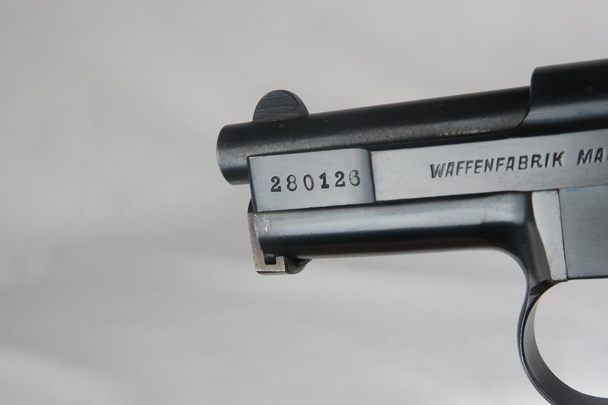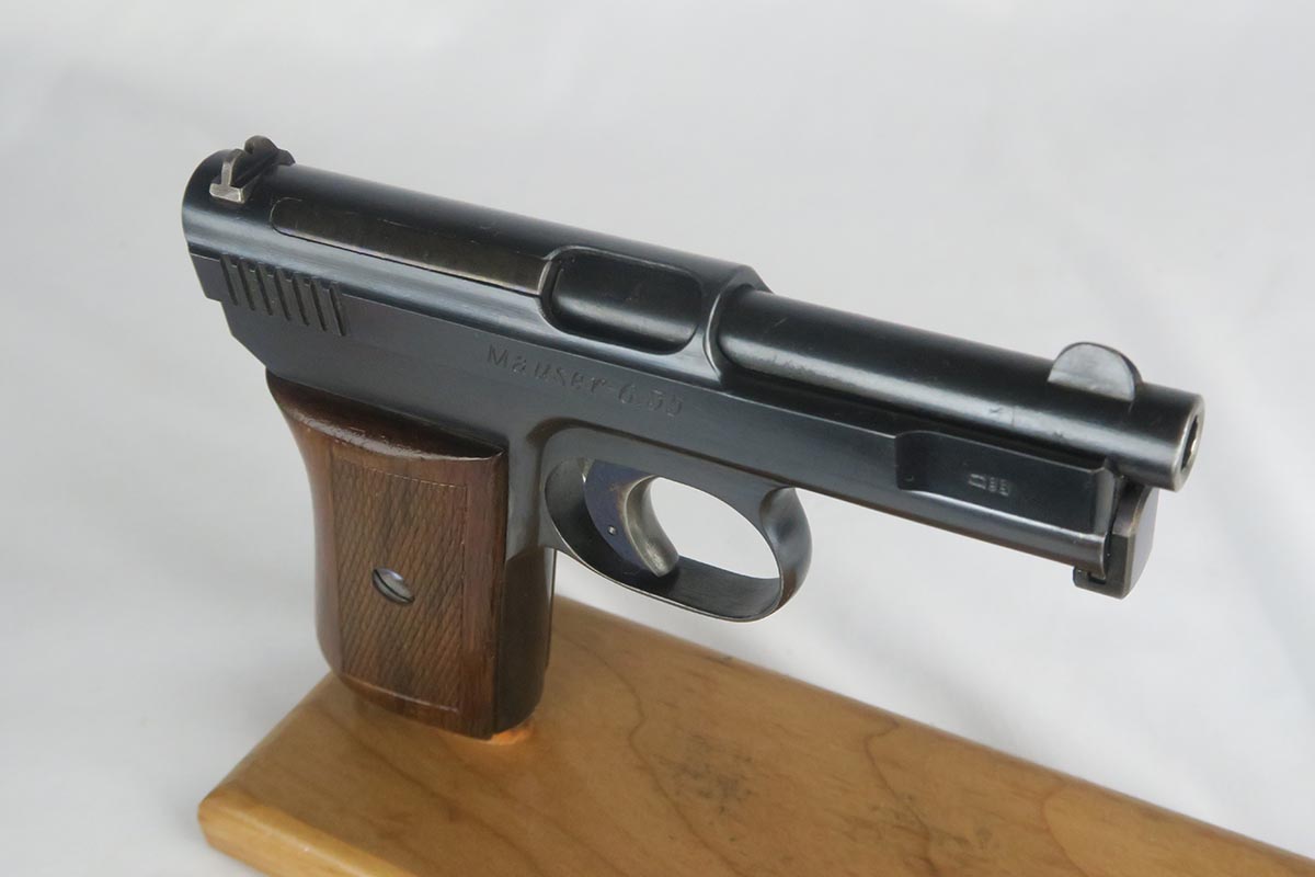 11/7/17 – This is a near-mint Mauser 1910, chambered in 6.35mm. The original finish rates at over 99% with brilliant fire blue on the trigger. Excellent one-piece grip with a couple very minor dings. All matching numbers. Mint bore. Commercial Crown/U proofs.