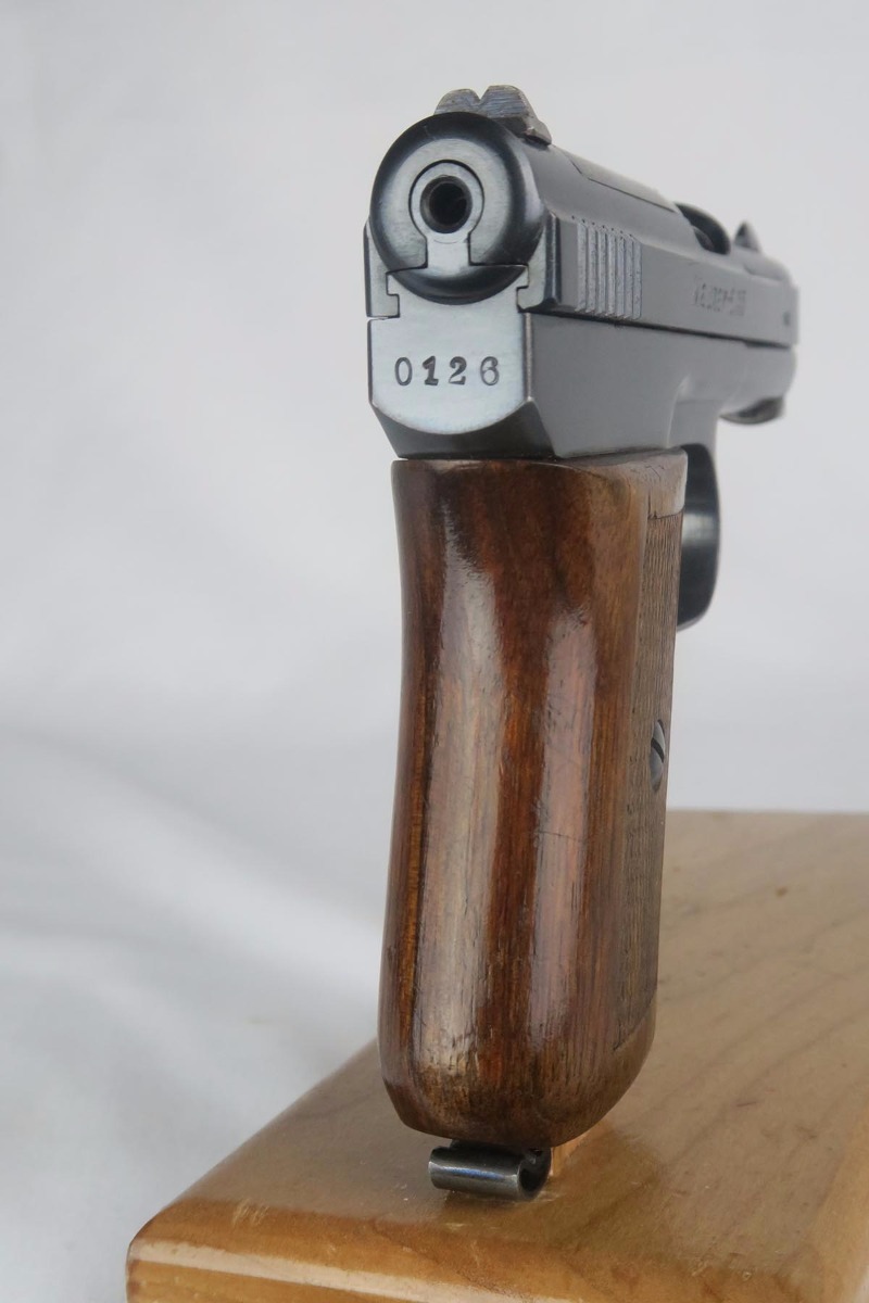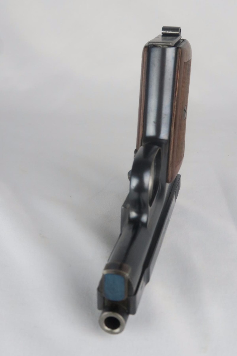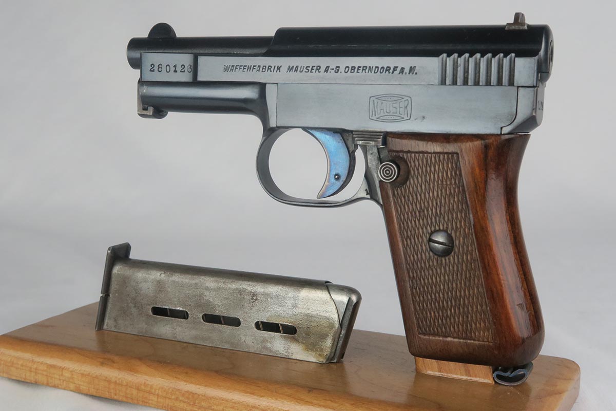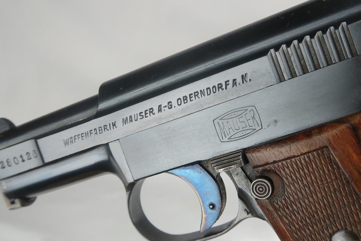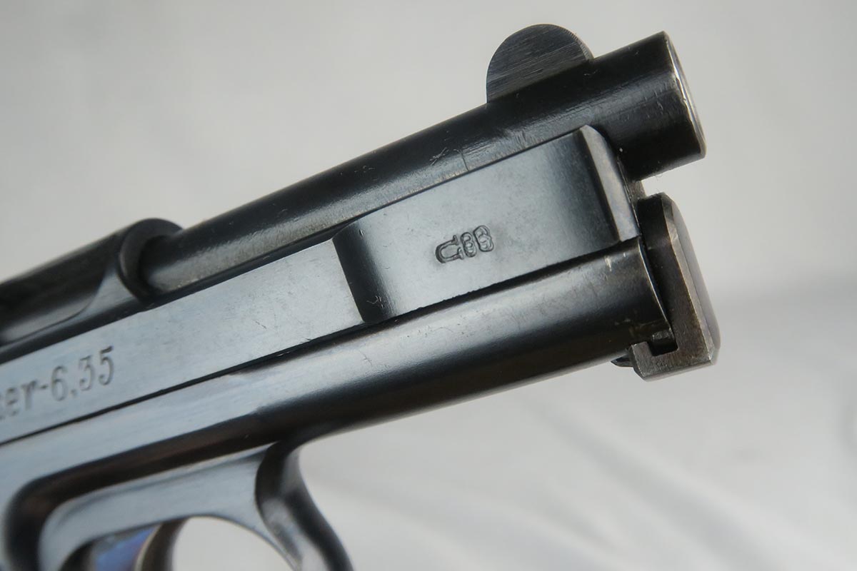 11/7/17 – This is a near-mint Mauser 1910, chambered in 6.35mm. The original finish rates at over 99% with brilliant fire blue on the trigger. Excellent one-piece grip with a couple very minor dings. All matching numbers. Mint bore. Commercial Crown/U proofs.