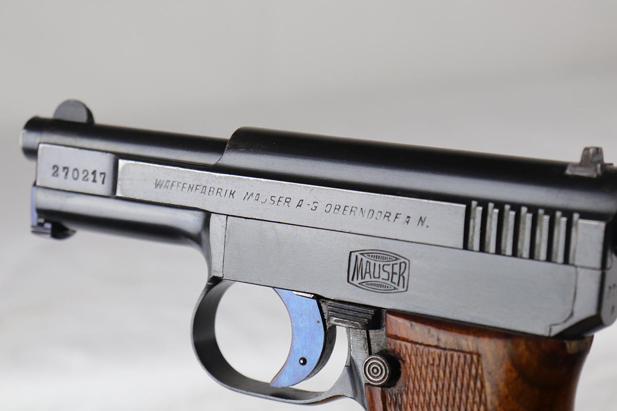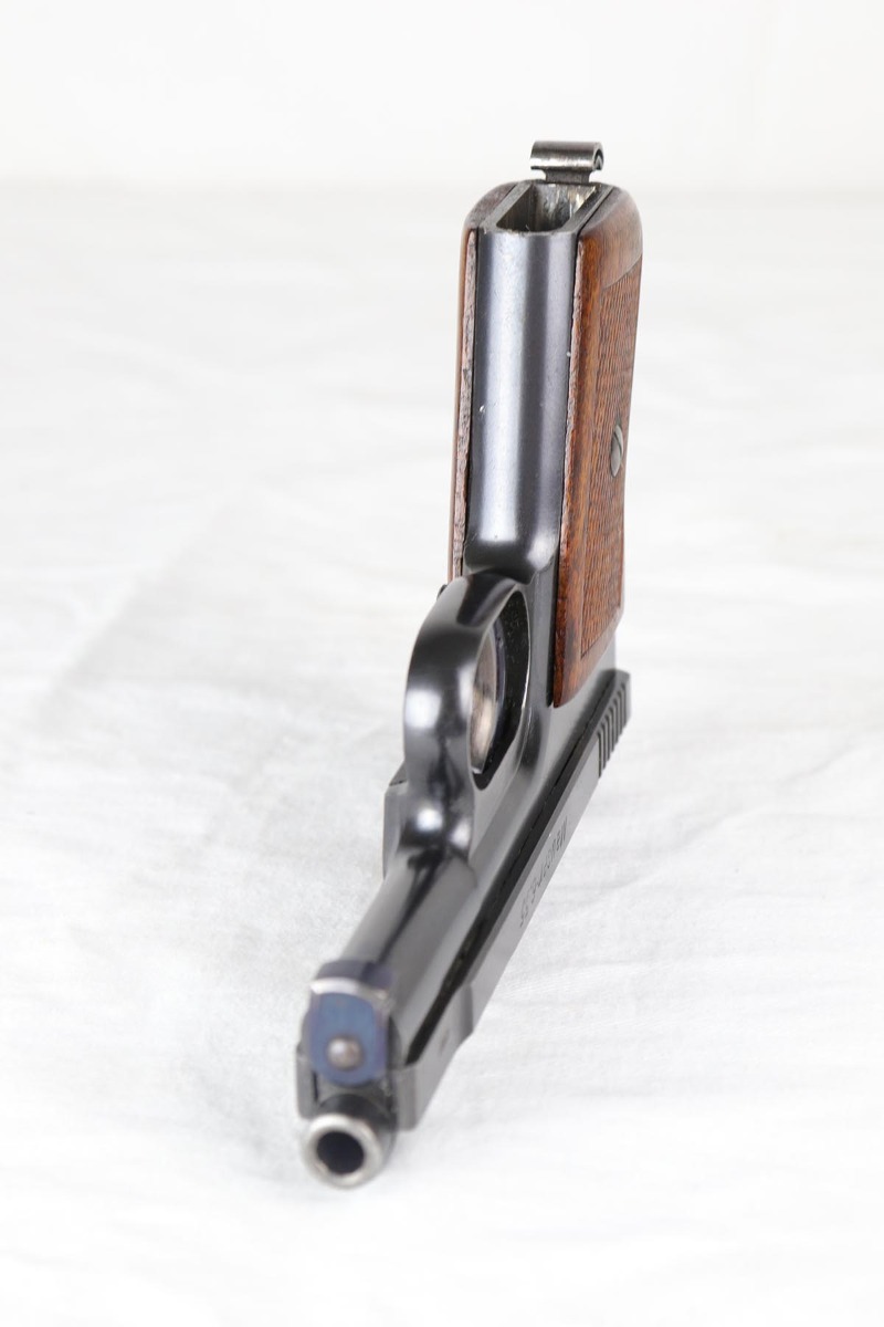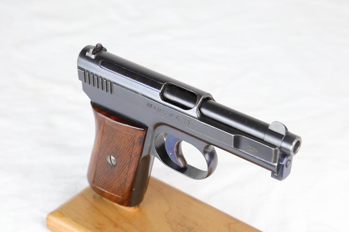 3/23/18 – This is a minty condition, .25 caliber 1910 Mauser with 98-99% original finish and all matching numbers. This pistol was part of a Portuguese contract that was sold on the commercial market in Portugal in the 1920’s, as evidenced by the triangle in circle proof on the back of the slide. The wood grip is excellent as well. Fire blue small parts including the trigger is also in the 98% range. Correct excellent magazine. Overall, a cute little addition to your collection. Gun was made in the 20’s but looks to be in near new condition. The bore was not cared for as well as the rest of the pistol, and does have minor corrosion in the grooves.