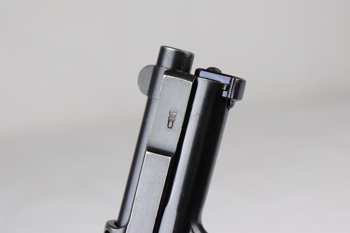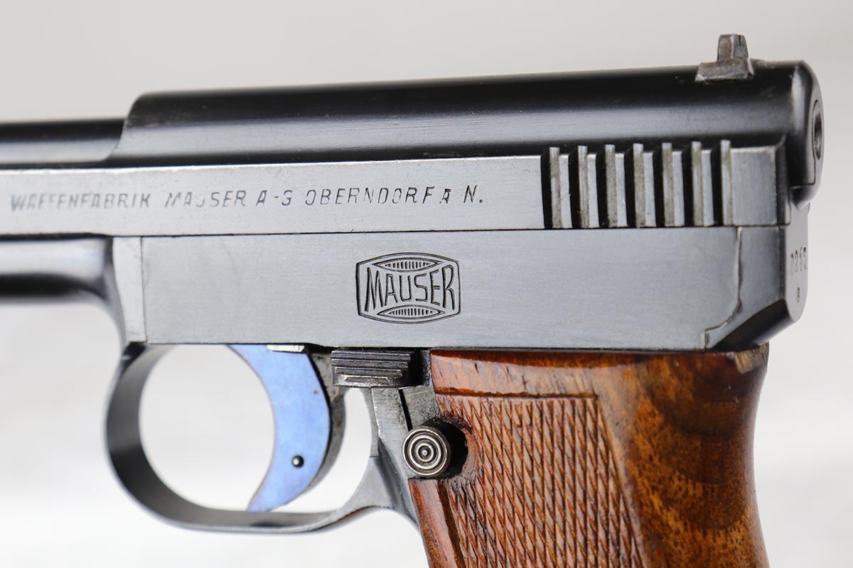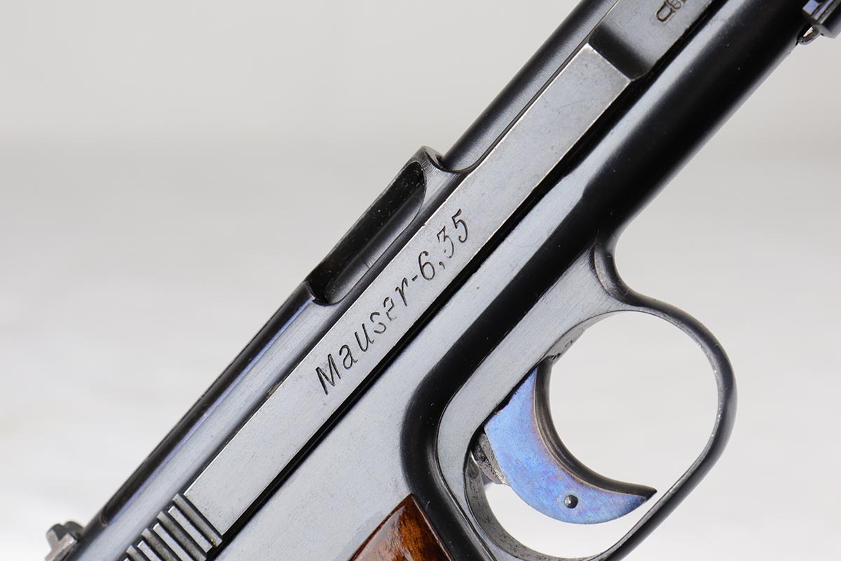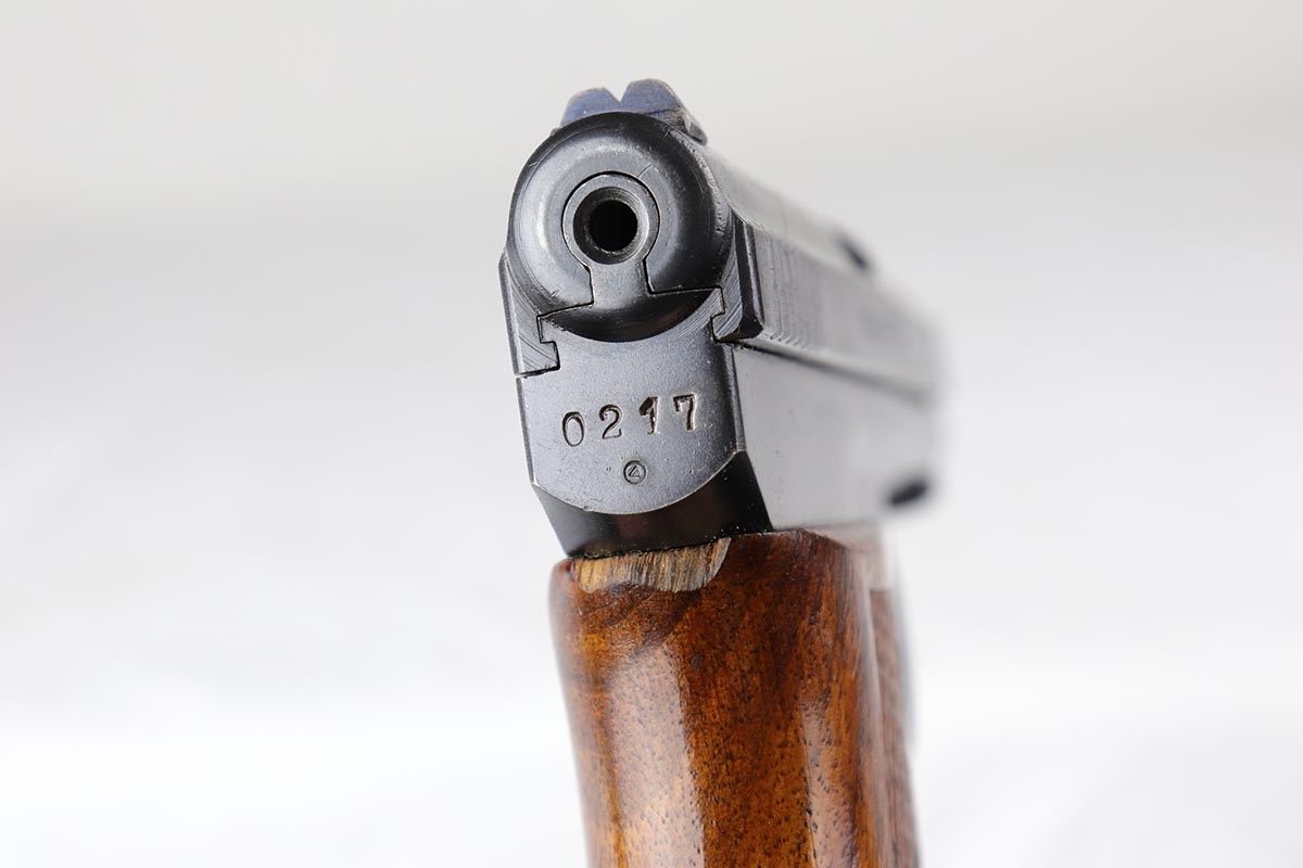 3/23/18 – This is a minty condition, .25 caliber 1910 Mauser with 98-99% original finish and all matching numbers. This pistol was part of a Portuguese contract that was sold on the commercial market in Portugal in the 1920’s, as evidenced by the triangle in circle proof on the back of the slide. The wood grip is excellent as well. Fire blue small parts including the trigger is also in the 98% range. Correct excellent magazine. Overall, a cute little addition to your collection. Gun was made in the 20’s but looks to be in near new condition. The bore was not cared for as well as the rest of the pistol, and does have minor corrosion in the grooves.