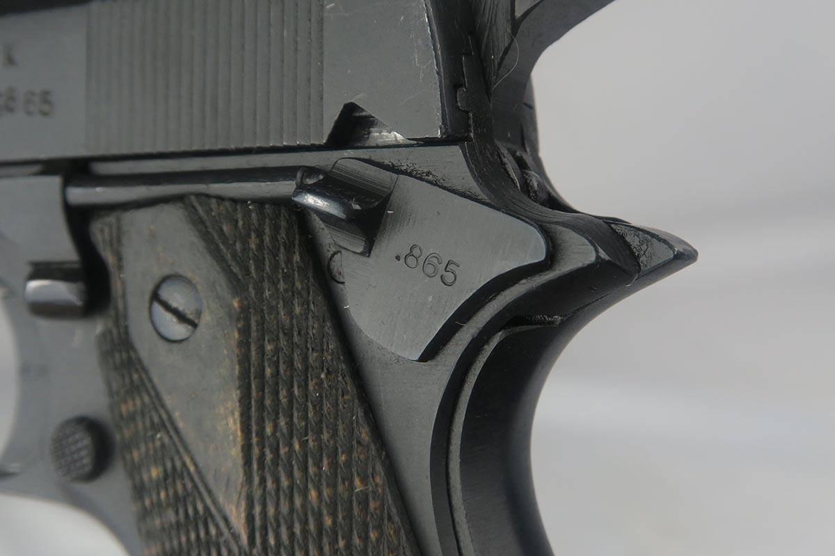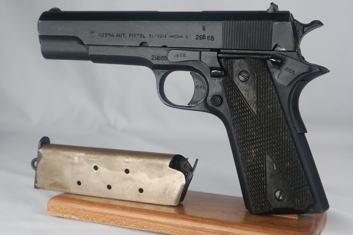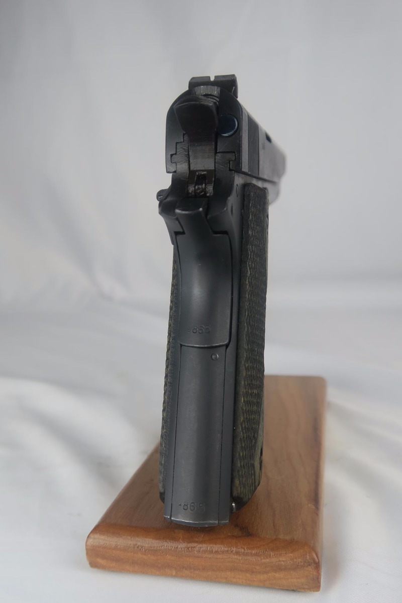 9/8/17 – This is a near-mint Kongsberg Colt model 1914, manufactured in 1945 and issued to the Nazi Army.  These are rare pistols, and it would be nearly impossible to find an upgrade for this one.  The original finish rates at 99% with minor scuff marks on the right side of the slide.   Colt licensed out production of the 1911 to Kongsberg Vaapenfabrik in Norway, who in 1945 produced less than 1,000 of this waffen variation according to Jan Still’s book. This particular piece falls in the documented serial range of 29261-30523, where only ~30-50 have been reported. It has the original matte blue finish and stained birch grips, which have retained a good portion of the dark stain finish. The gun is 1945 dated, and it is stamped along the left side of the slide “11.25m/m AUT. PISTOL M/1914” followed by the serial number, above which is a crown/K inspector proof. To the left of this stamp is an E/WaA84 nazi proof, showing this gun was delivered to the German occupying forces in Norway.  Bore is minty, all parts are original and matching and gun comes with original loop magazine.