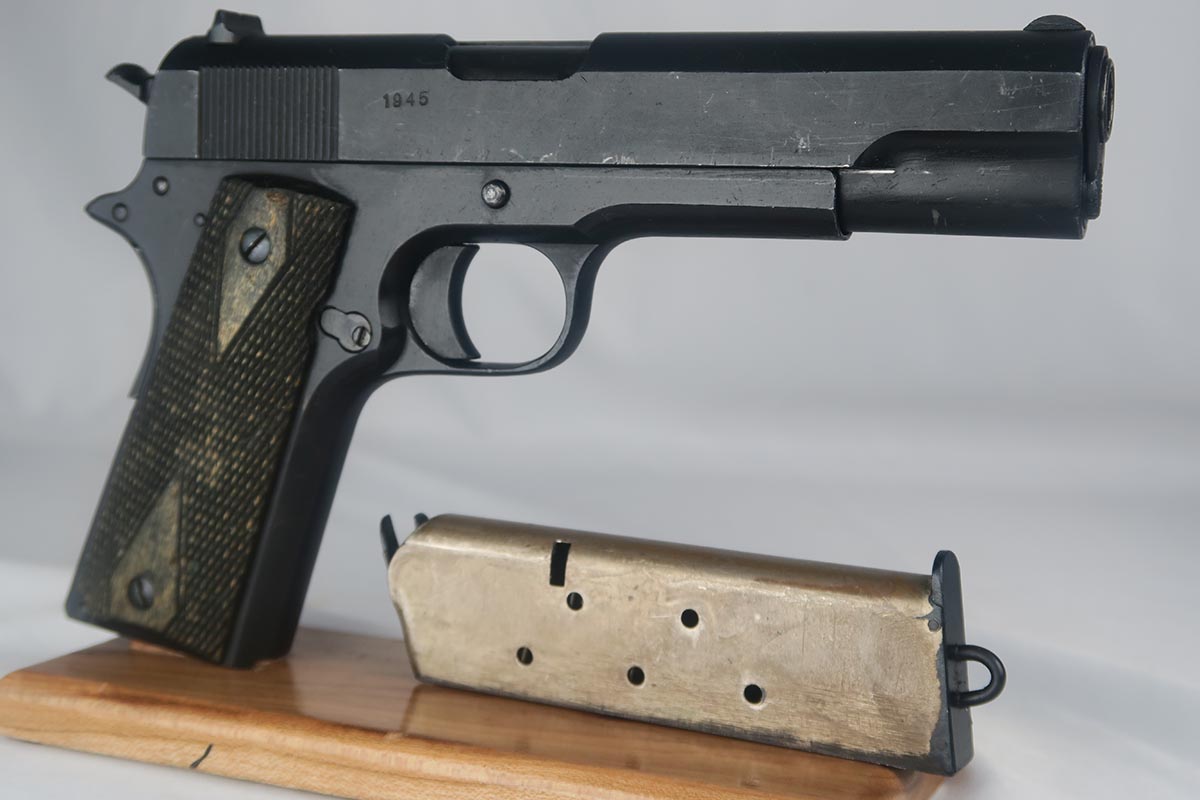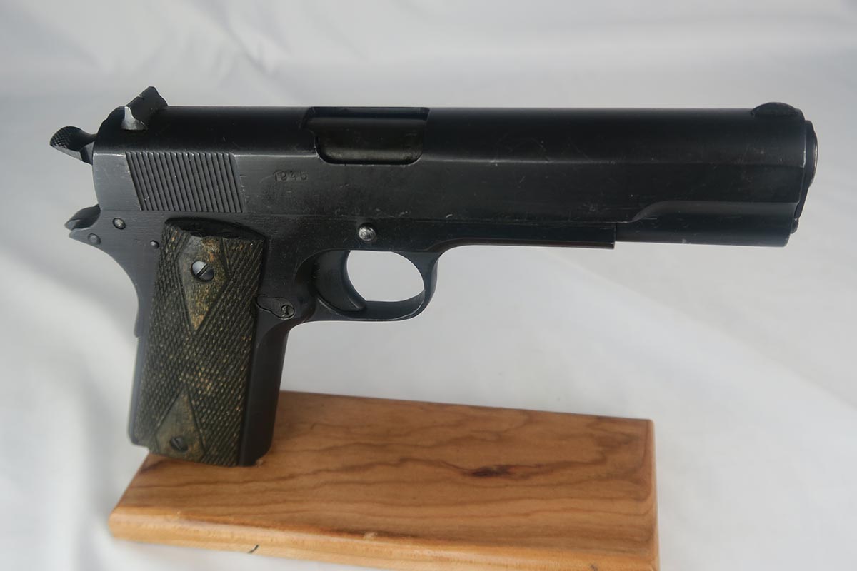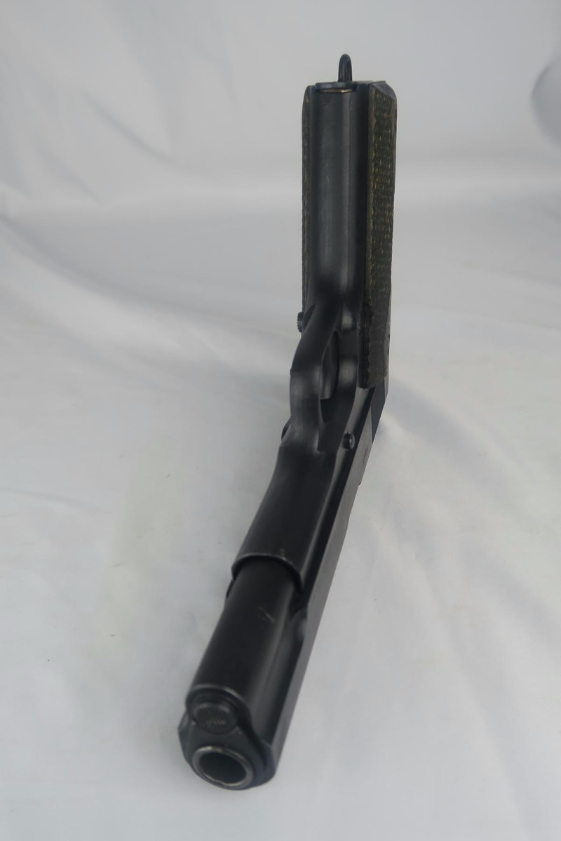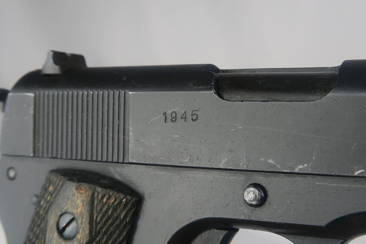 9/8/17 – This is a near-mint Kongsberg Colt model 1914, manufactured in 1945 and issued to the Nazi Army.  These are rare pistols, and it would be nearly impossible to find an upgrade for this one.  The original finish rates at 99% with minor scuff marks on the right side of the slide.   Colt licensed out production of the 1911 to Kongsberg Vaapenfabrik in Norway, who in 1945 produced less than 1,000 of this waffen variation according to Jan Still’s book. This particular piece falls in the documented serial range of 29261-30523, where only ~30-50 have been reported. It has the original matte blue finish and stained birch grips, which have retained a good portion of the dark stain finish. The gun is 1945 dated, and it is stamped along the left side of the slide “11.25m/m AUT. PISTOL M/1914” followed by the serial number, above which is a crown/K inspector proof. To the left of this stamp is an E/WaA84 nazi proof, showing this gun was delivered to the German occupying forces in Norway.  Bore is minty, all parts are original and matching and gun comes with original loop magazine.