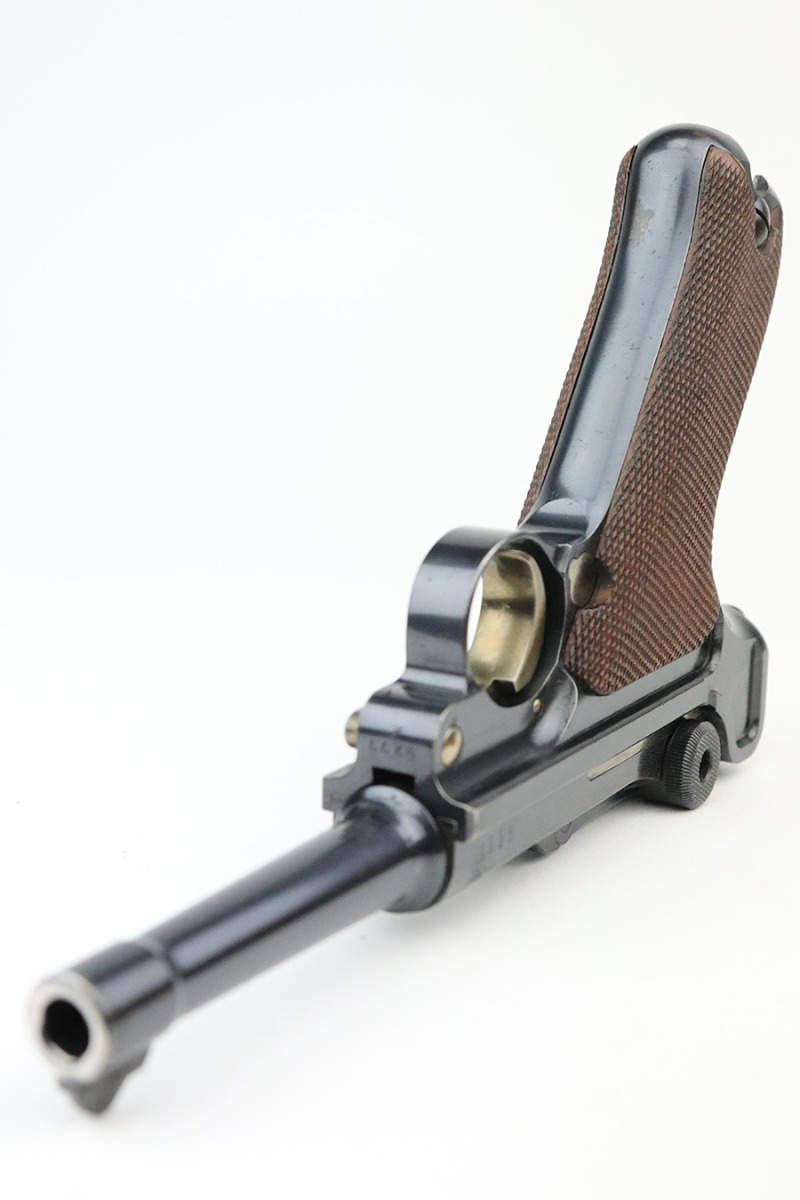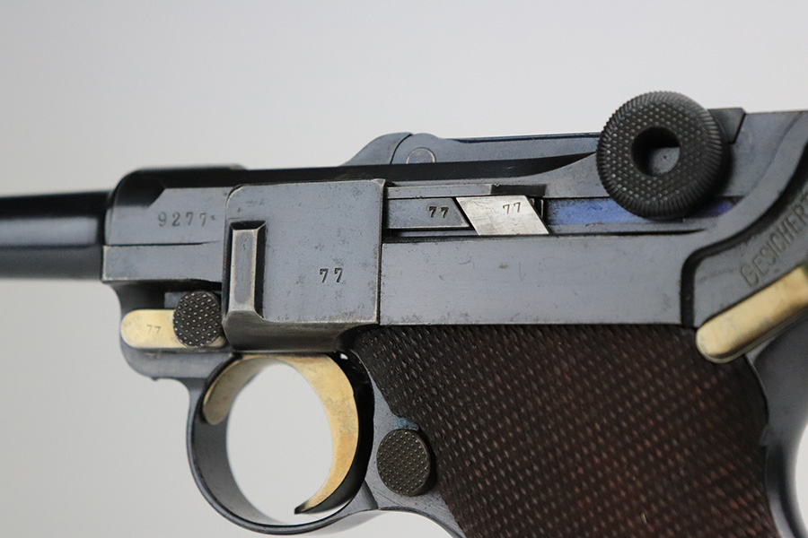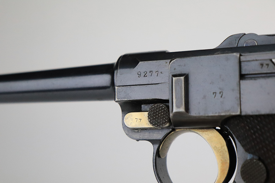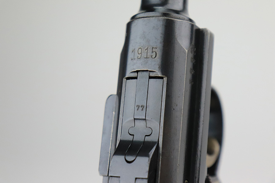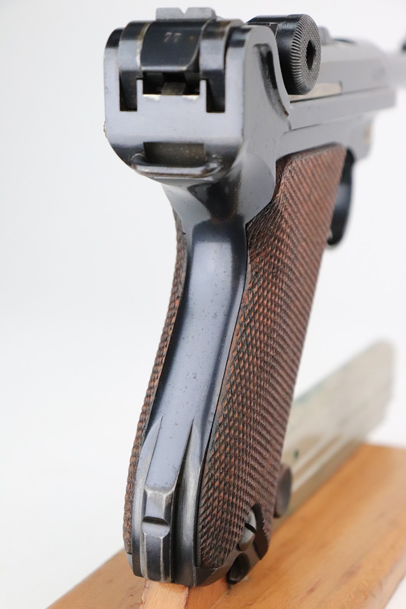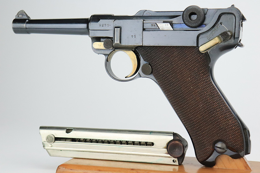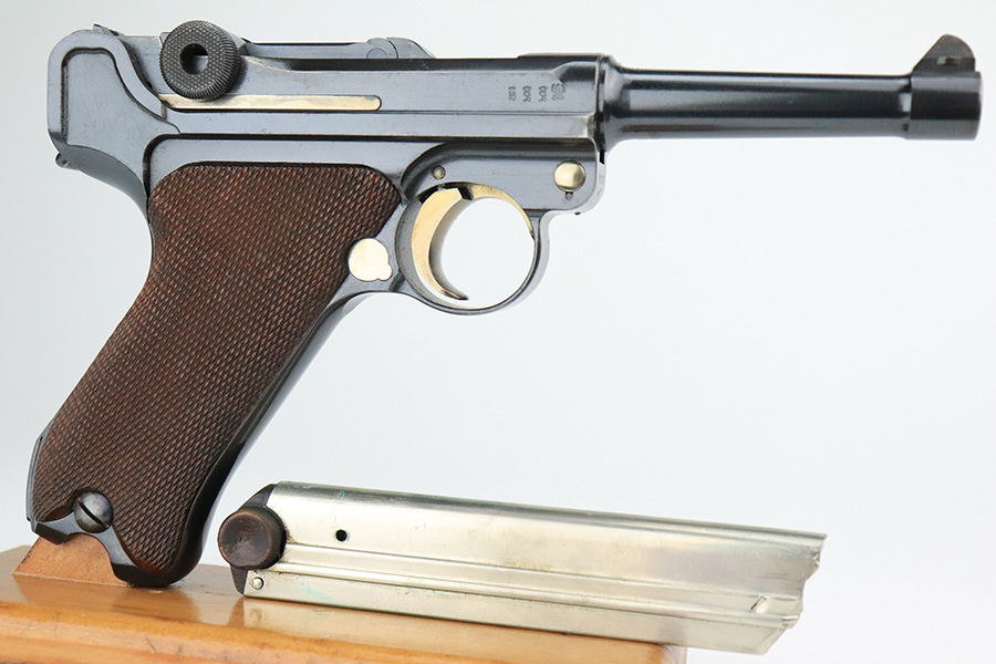 7/13/22 – This is a minty example of a DWM Luger issued to the Imperial German military in 1915. It is all matching and has the proper Imperial proofs. It has retained about 98% of its original bluing with very minor wear on the side plate, around the muzzle, and a couple of small spots on the front strap. Some tiny dots of oxidation here and there. Comes with minty matching-numbered wood grips. Also comes with a matching magazine, but it was force-matched. Excellent bore with strong rifling.