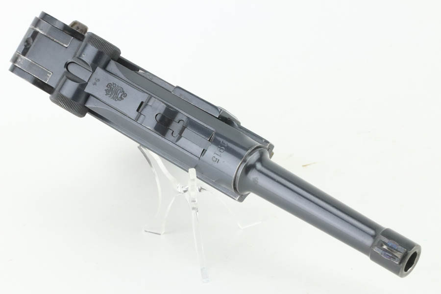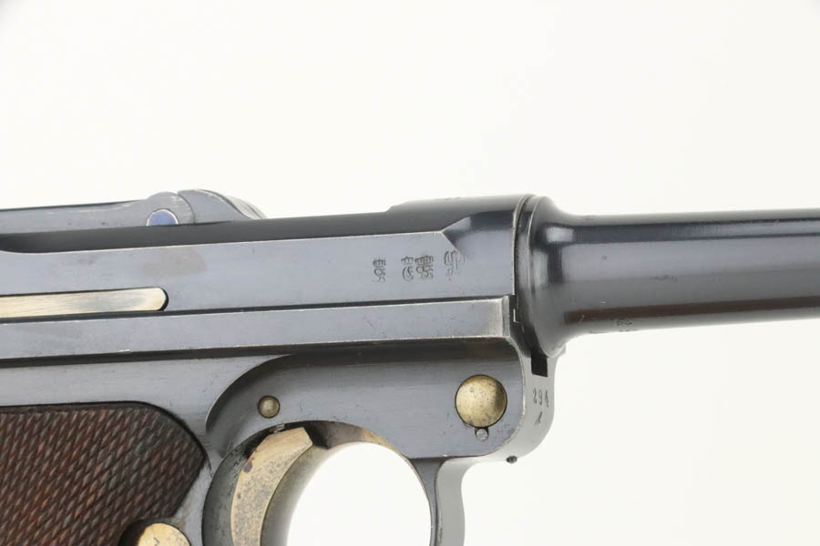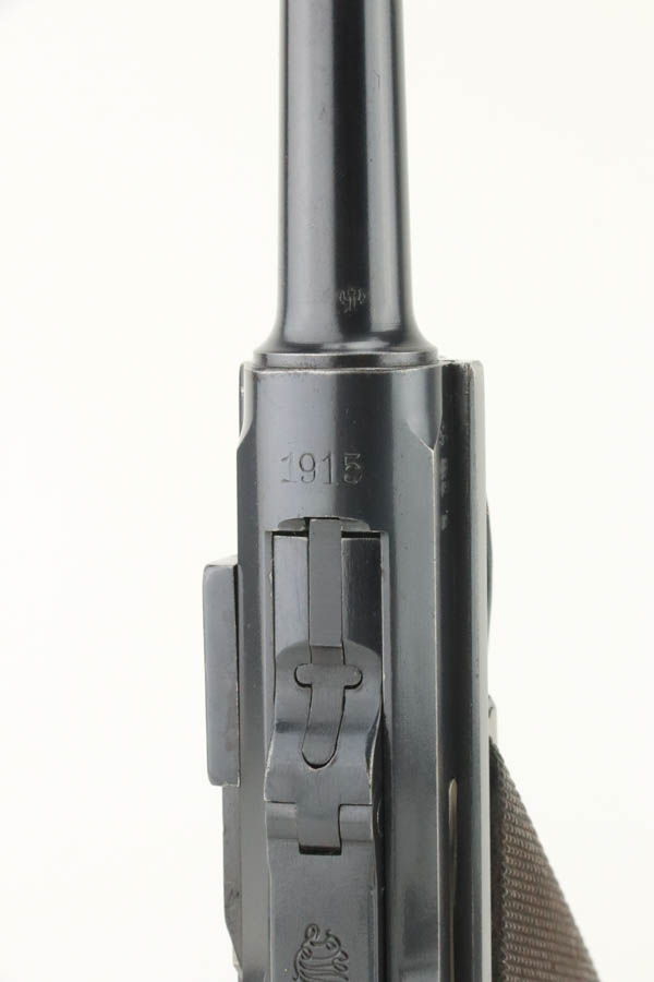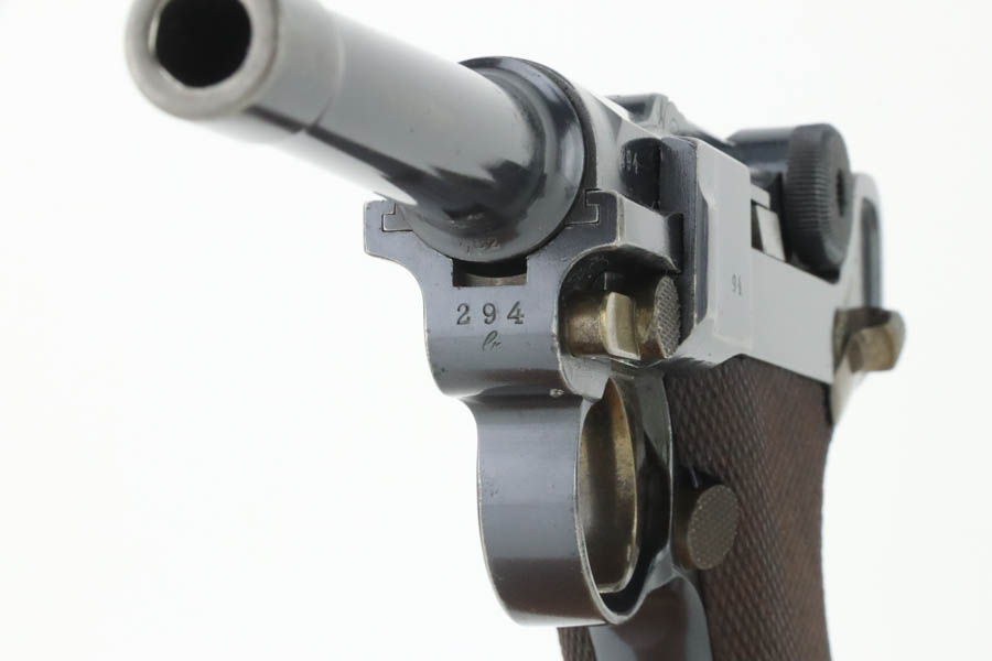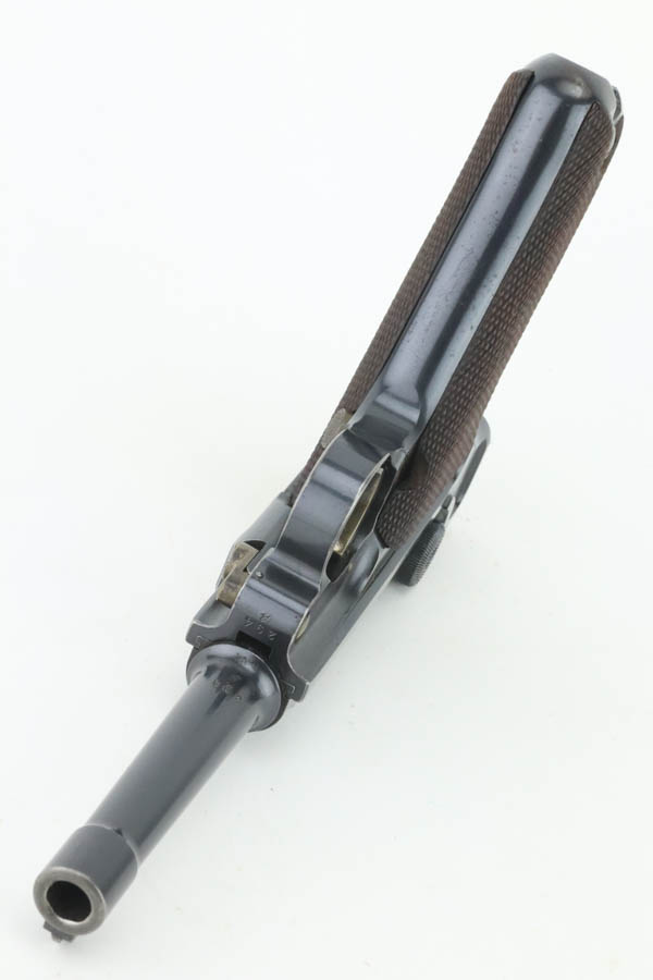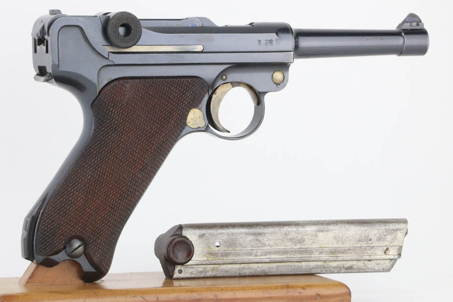 8/2/24 – This is a minty example of a DWM Luger issued to the Imperial German military in 1915. All matching with the proper Imperial military proofs. It comes with one original matching-numbered magazine – repaired crack in the base. The gun itself has retained about 97% of its original finish with just very minor high edge and muzzle wear. Fitted with minty un-numbered wood grips. The bore has pretty good rifling, but there is tiny pitting throughout.