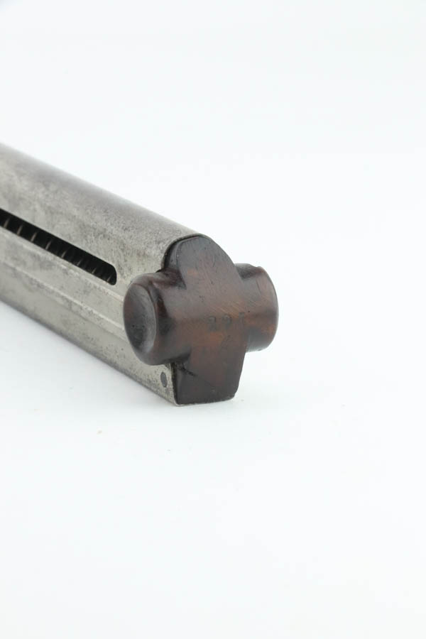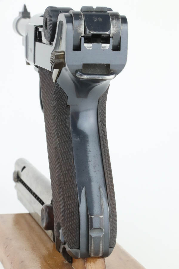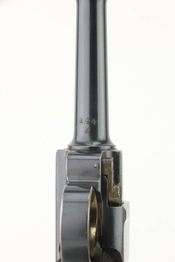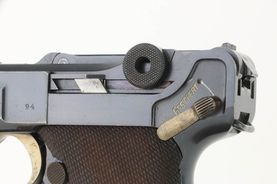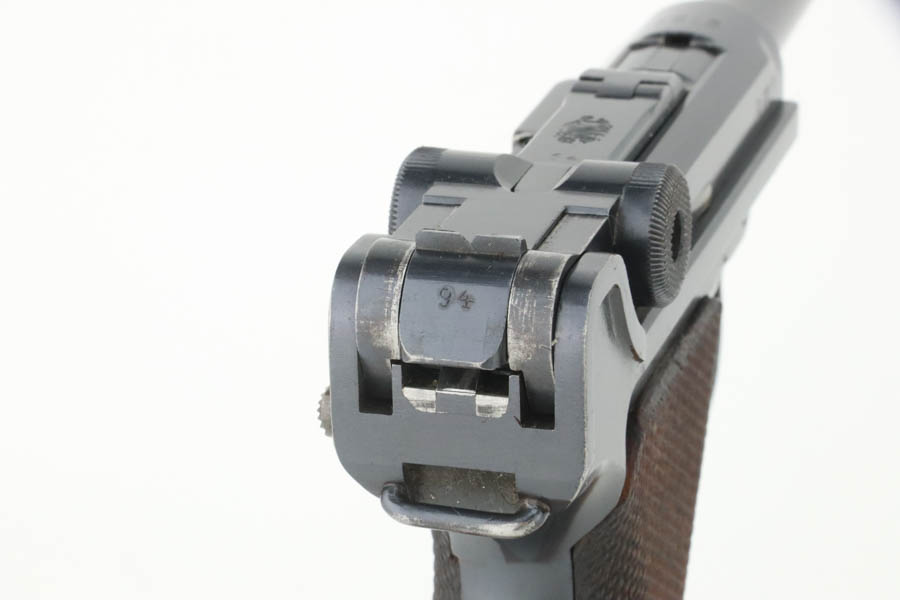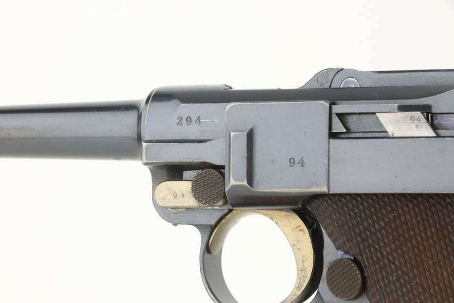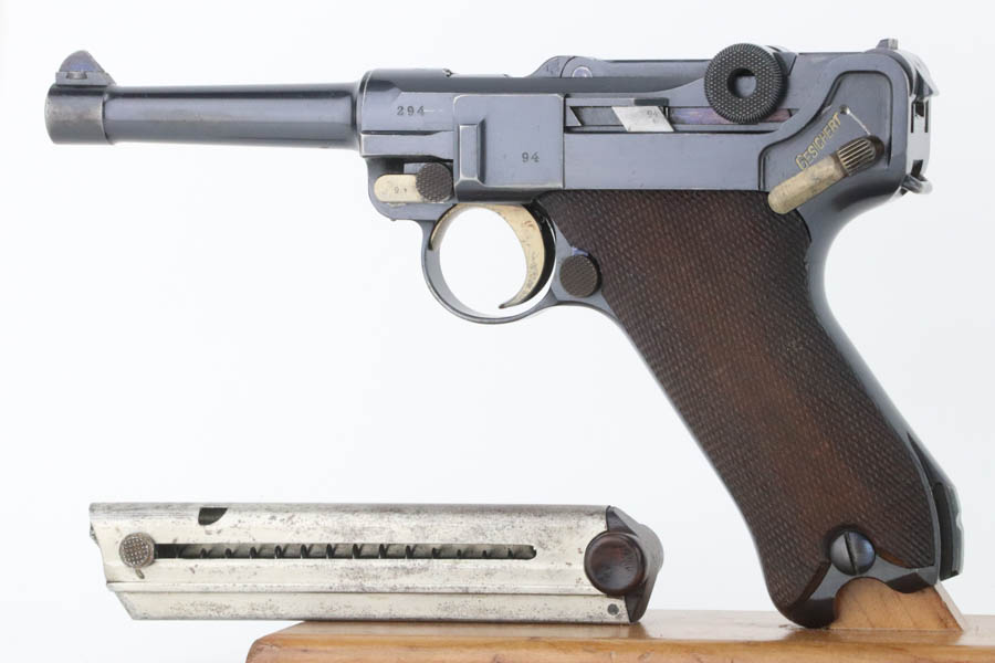 8/2/24 – This is a minty example of a DWM Luger issued to the Imperial German military in 1915. All matching with the proper Imperial military proofs. It comes with one original matching-numbered magazine – repaired crack in the base. The gun itself has retained about 97% of its original finish with just very minor high edge and muzzle wear. Fitted with minty un-numbered wood grips. The bore has pretty good rifling, but there is tiny pitting throughout.