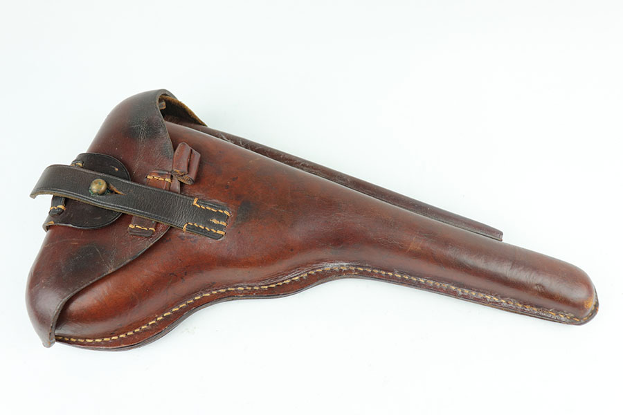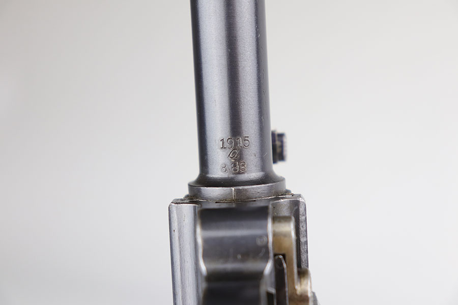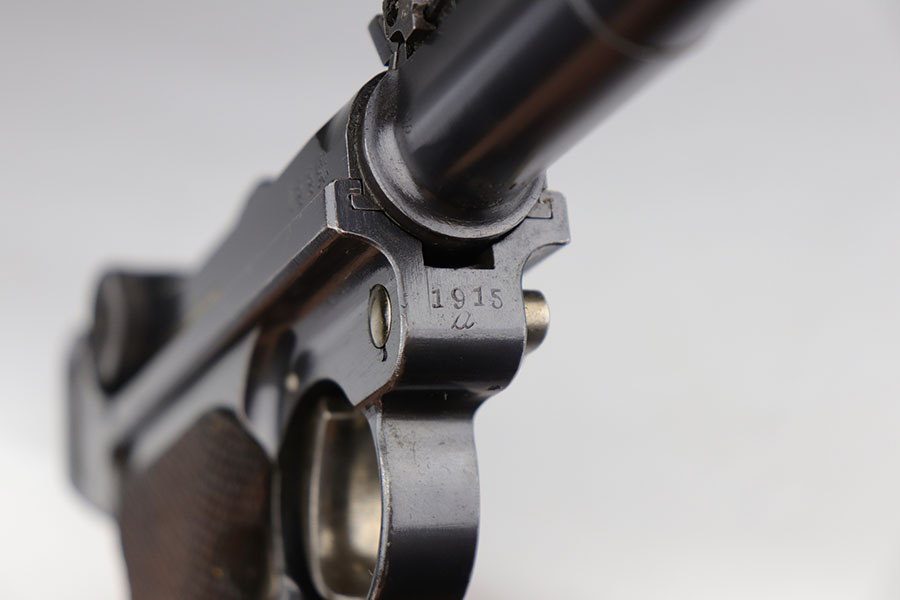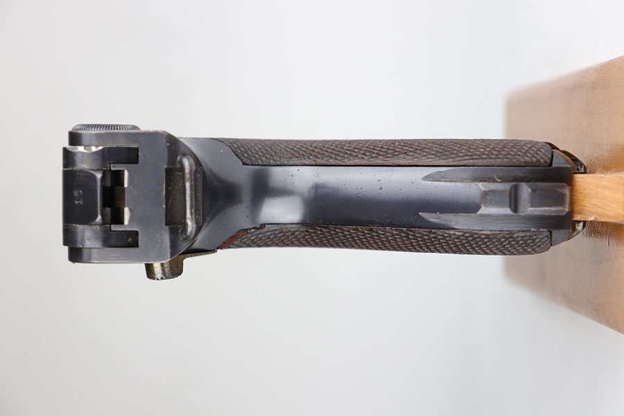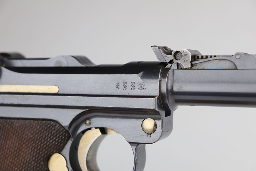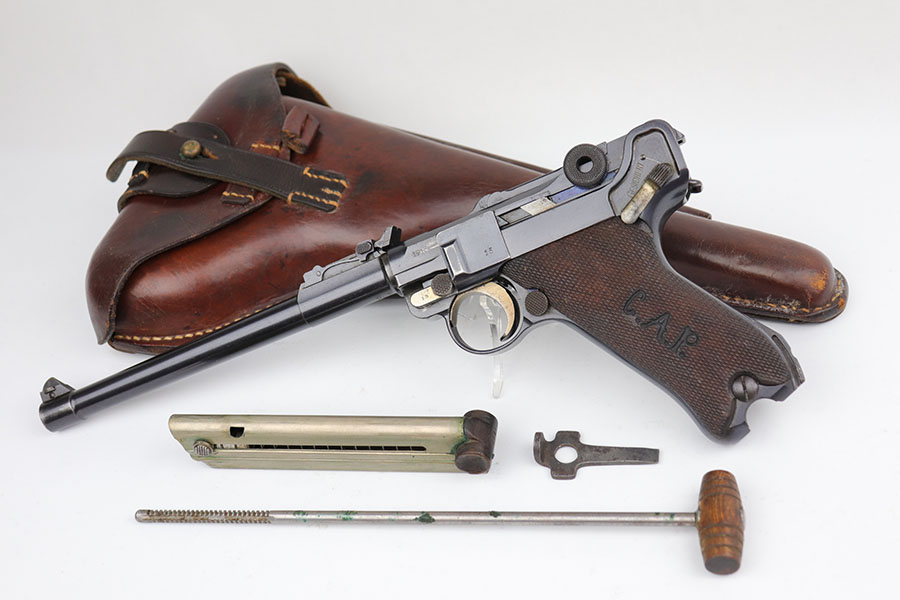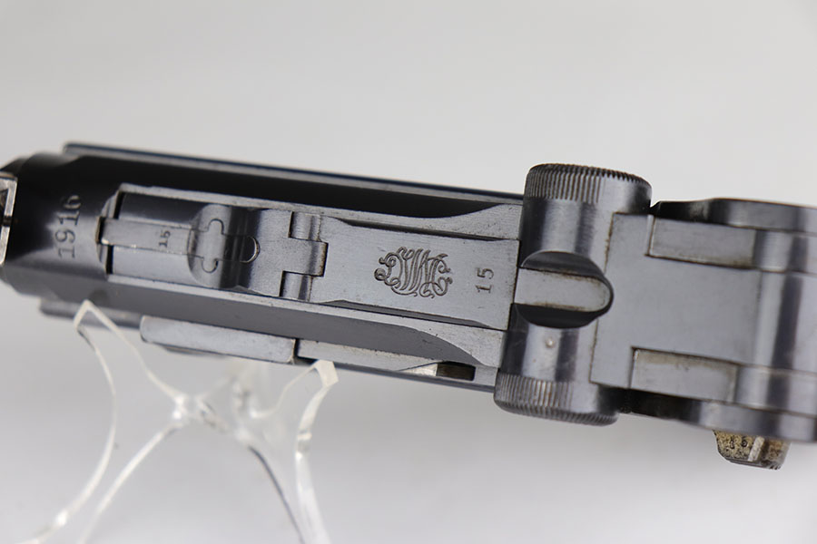 6/26/20 – This is a near-mint DWM Artillery Luger from 1916 with holster, tool and cleaning rod. The pistol is all matching and original with 98+% blue remaining. It’s got minor muzzle and sideplate wear but no other bluing loss. Original straw rates at about 95% with minor wear and patina on the safety. The original matching grips are present and in good condition aside from the chip under the safety lever. It also has the initials of the GI nicely marked into the left panel. The magazine is correct but mismatched. The holster has excellent leather but does have a replaced closure strap, and the leather/loops on the back are modified. The leather is also separating down near the toe. Original cleaning rod is present, and so is an original tool with imperial marking.