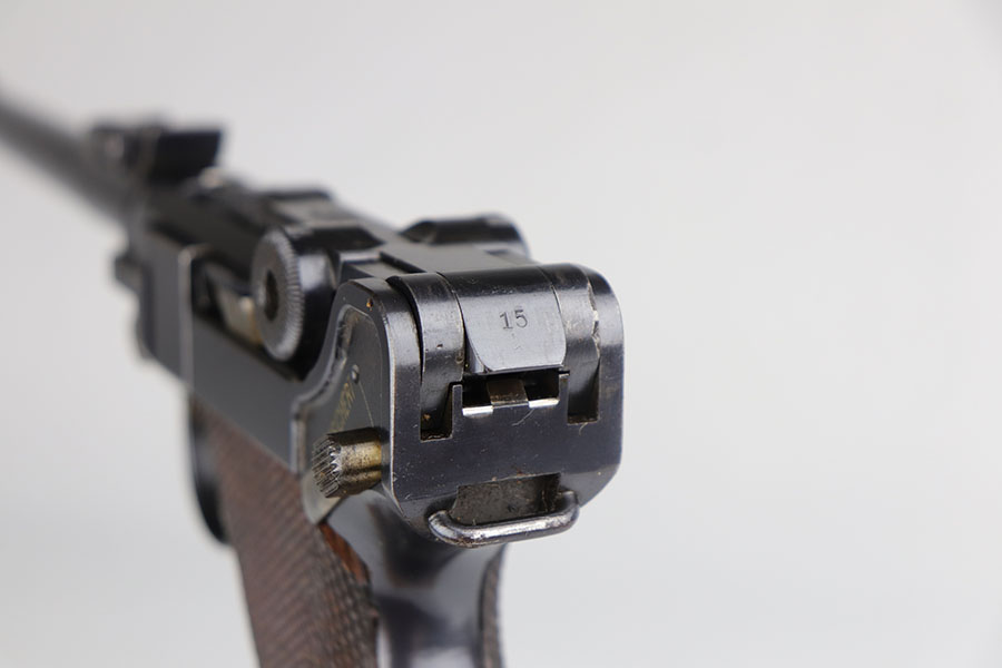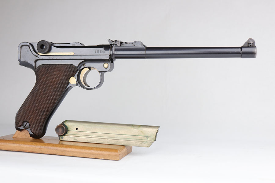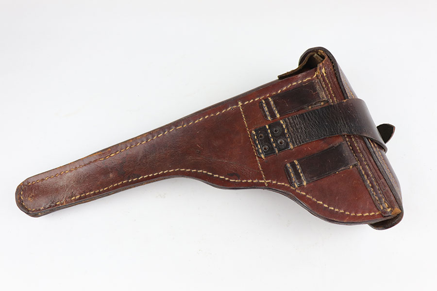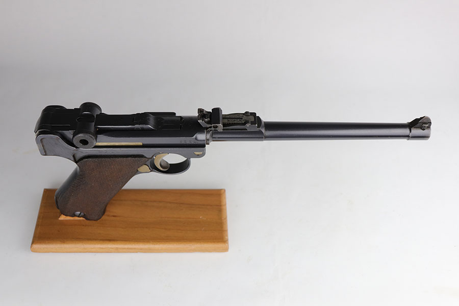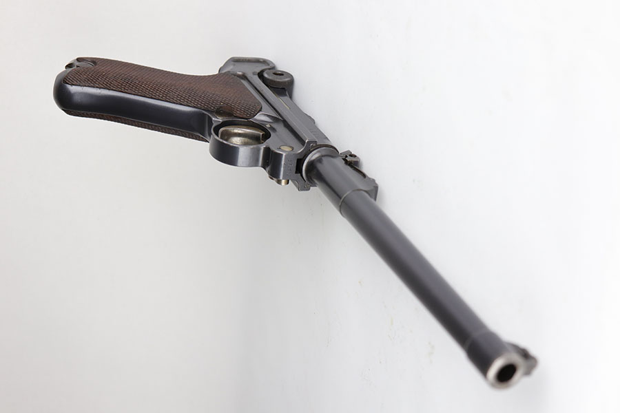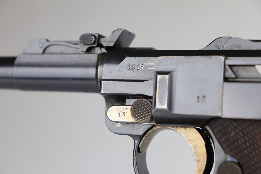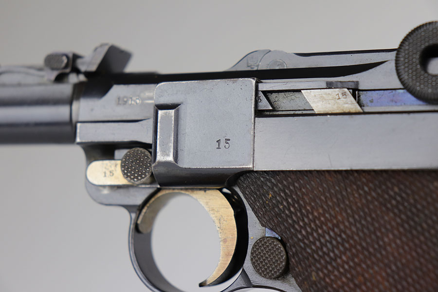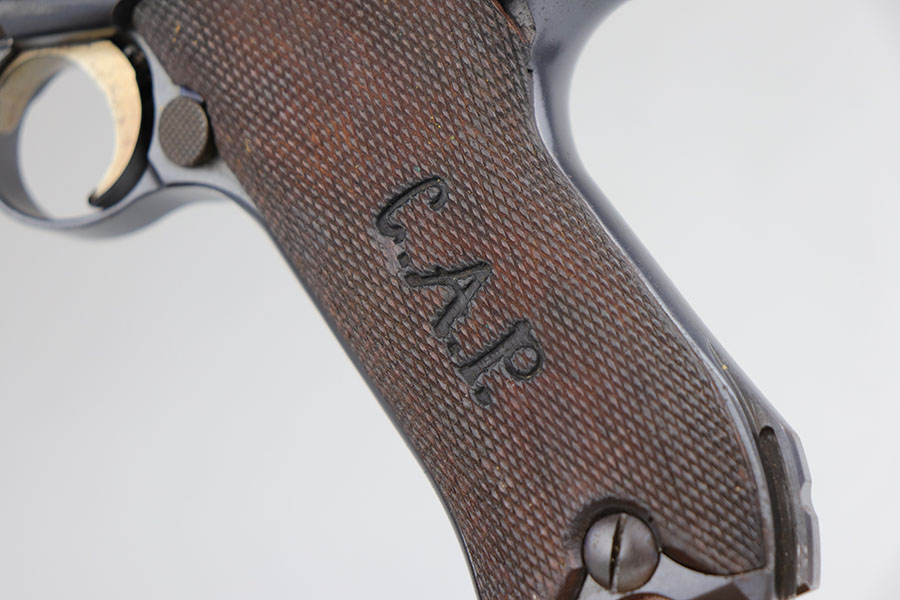 6/26/20 – This is a near-mint DWM Artillery Luger from 1916 with holster, tool and cleaning rod. The pistol is all matching and original with 98+% blue remaining. It’s got minor muzzle and sideplate wear but no other bluing loss. Original straw rates at about 95% with minor wear and patina on the safety. The original matching grips are present and in good condition aside from the chip under the safety lever. It also has the initials of the GI nicely marked into the left panel. The magazine is correct but mismatched. The holster has excellent leather but does have a replaced closure strap, and the leather/loops on the back are modified. The leather is also separating down near the toe. Original cleaning rod is present, and so is an original tool with imperial marking.