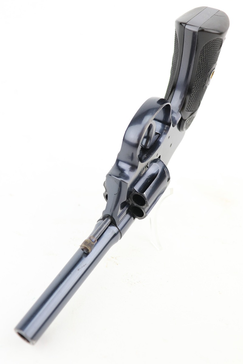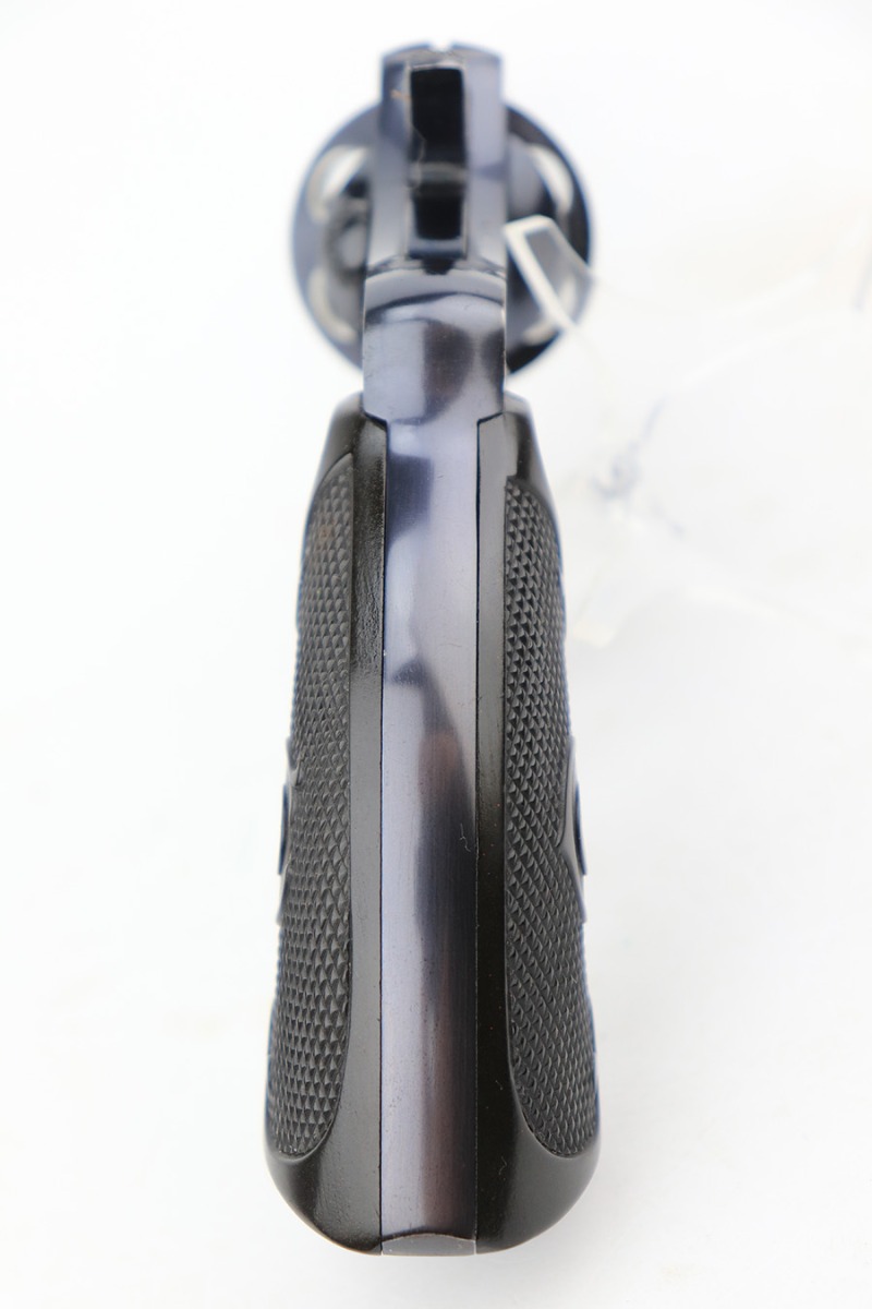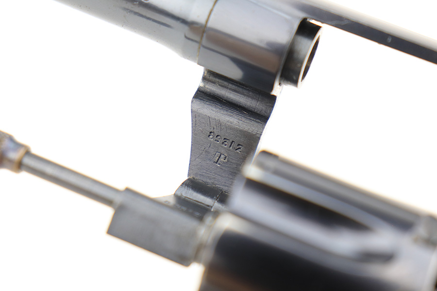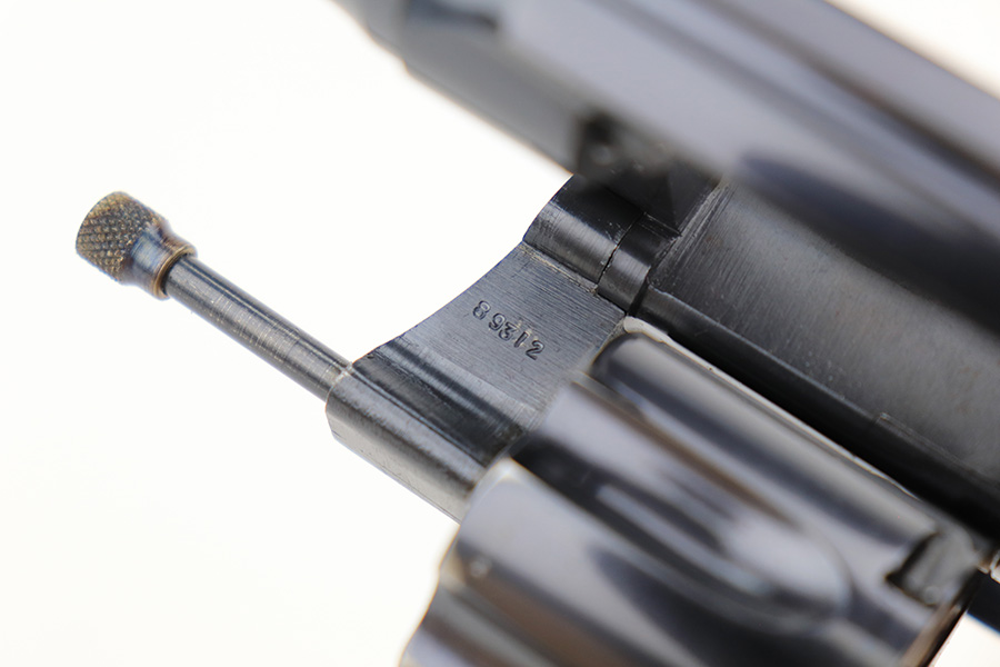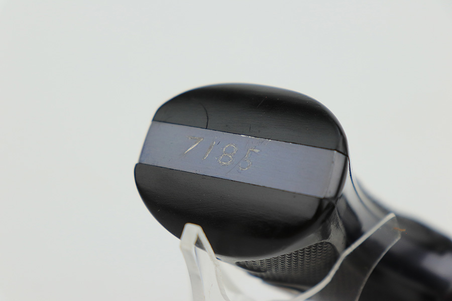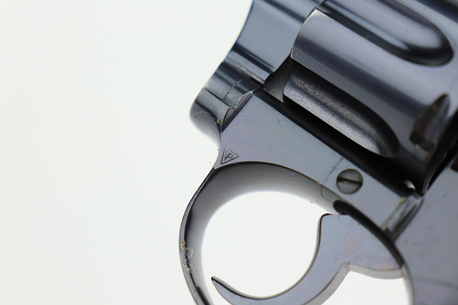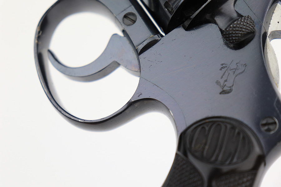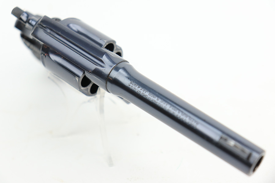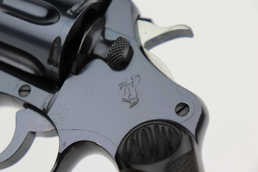 4/21/23 – This is a minty example of a Colt Police Positive revolver, manufactured in 1917 and chambered in .38 Caliber. 4″ barrel. All matching. It has retained nearly all of its original high polish Colt bluing with very minor wear around the muzzle and on the high edges of the cylinder. Extremely light roll mark on the cylinder. There is a number “7185” on the butt of the frame. Fitted with excellent hard black rubber Colt grips. Like-new bore. The cylinder is tight, and the action is smooth.