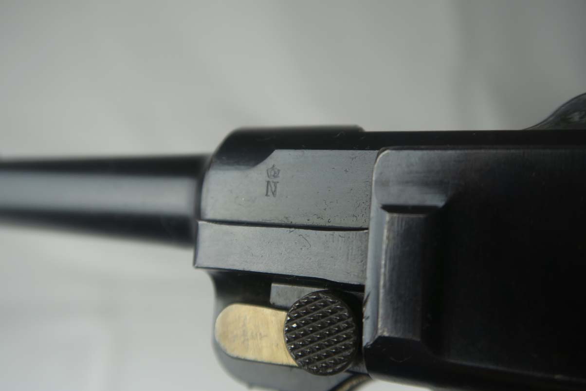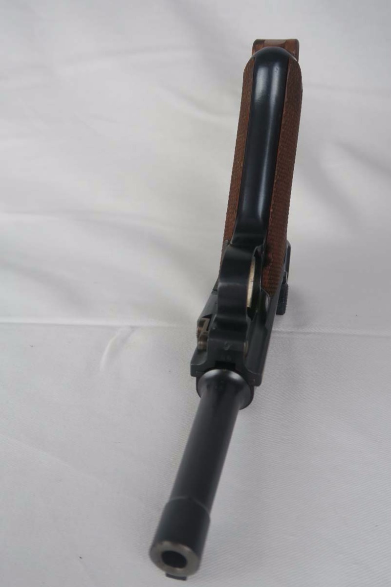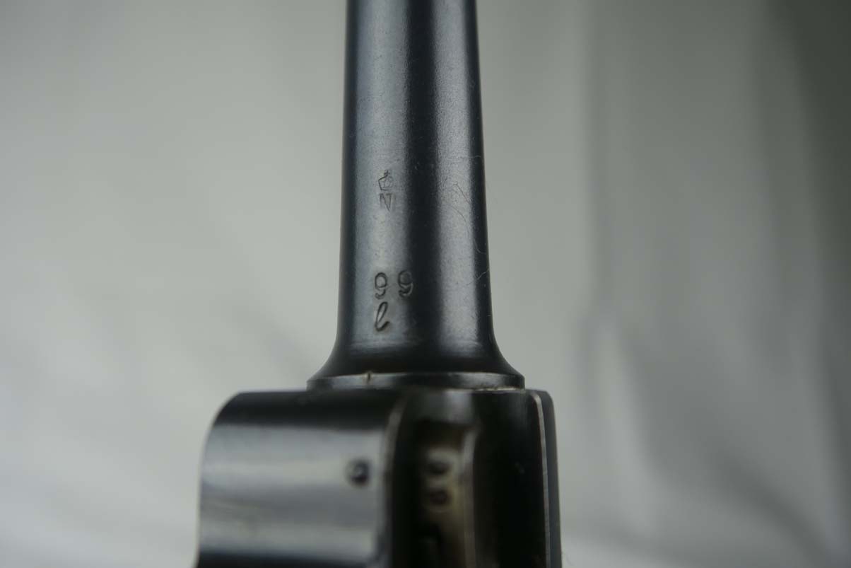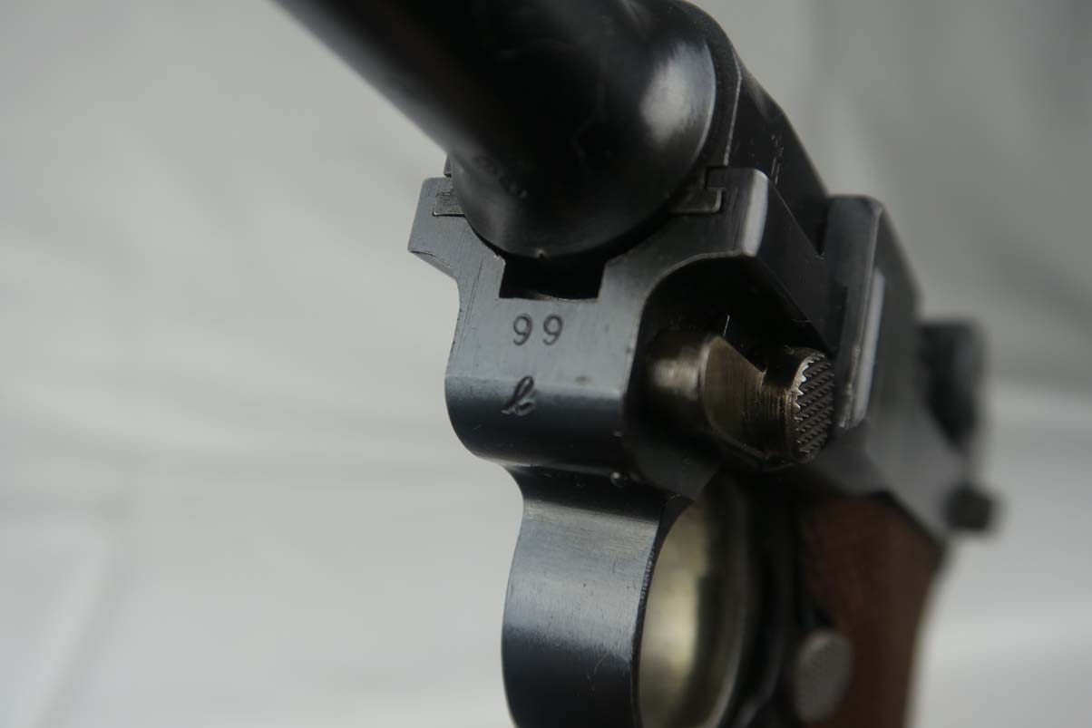 8/23/17 – This is an all original Commercial luger in pristine condition. The original finish is about 99%, with excellent straw color small parts and mint grips.  The gun comes in 30 caliber luger and has an excellent bore – barely shot.   On the commercial guns most of the small parts are not numbered, including the grips.  All parts that are numbered are matching and the serial is unique – #99!   The bottom of the magazine is GERMANY marked meaning this gun was most likely made for export to the US.   The tube of the mag is a bit corroded which does not match the condition of the gun, so I would conclude that the magazine was replaced at some point with another correct magazine.