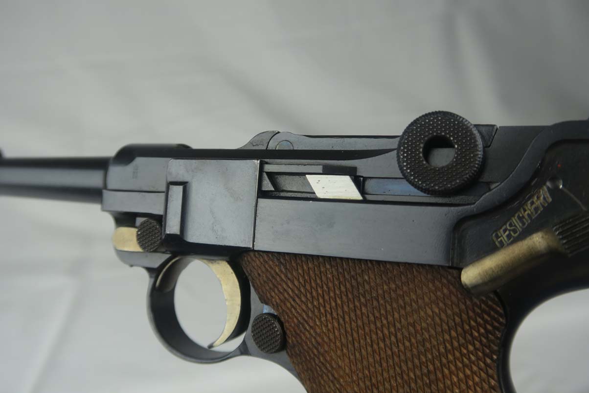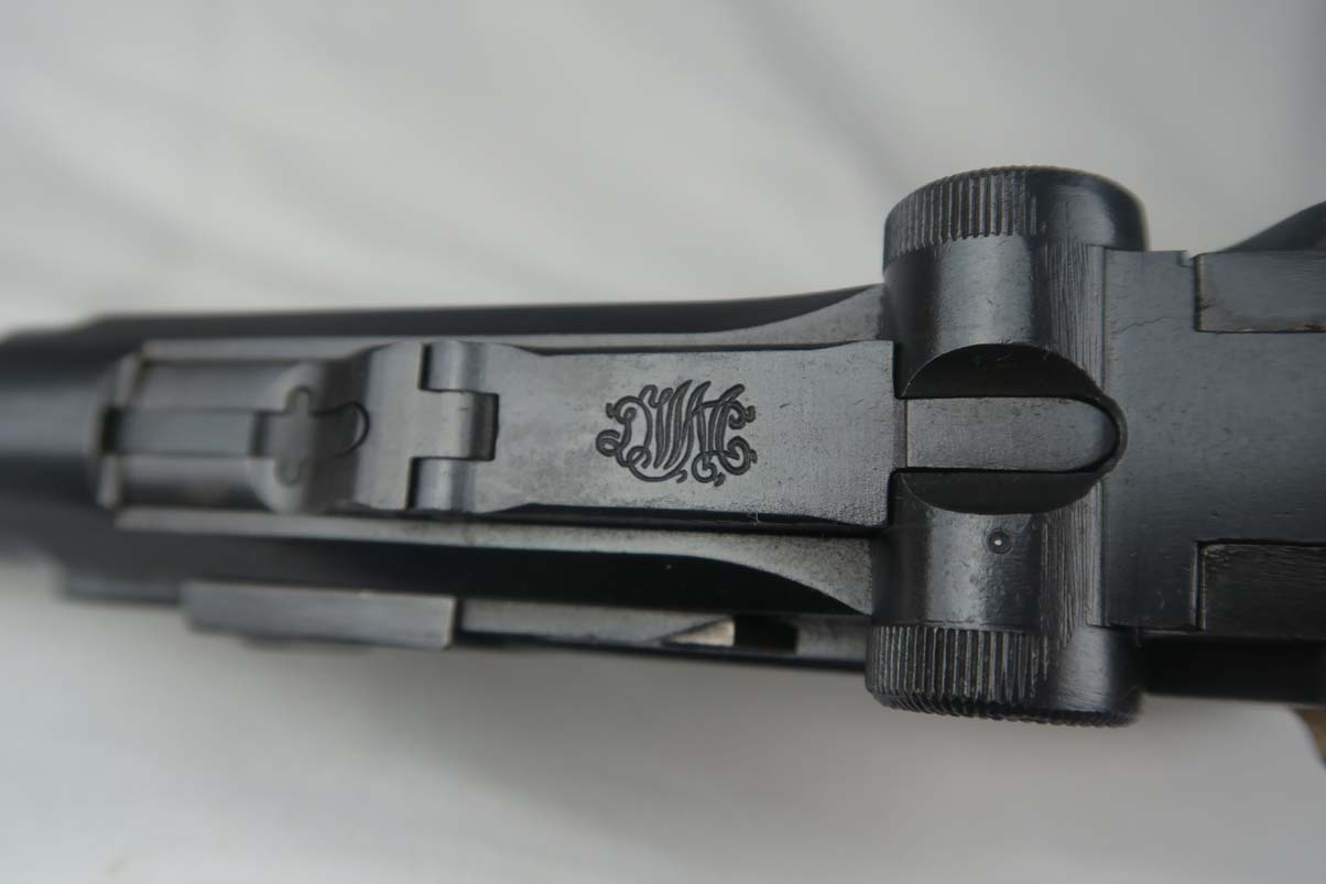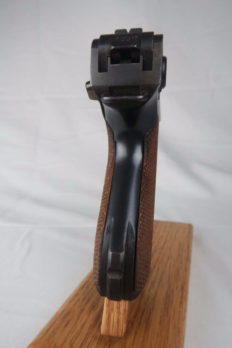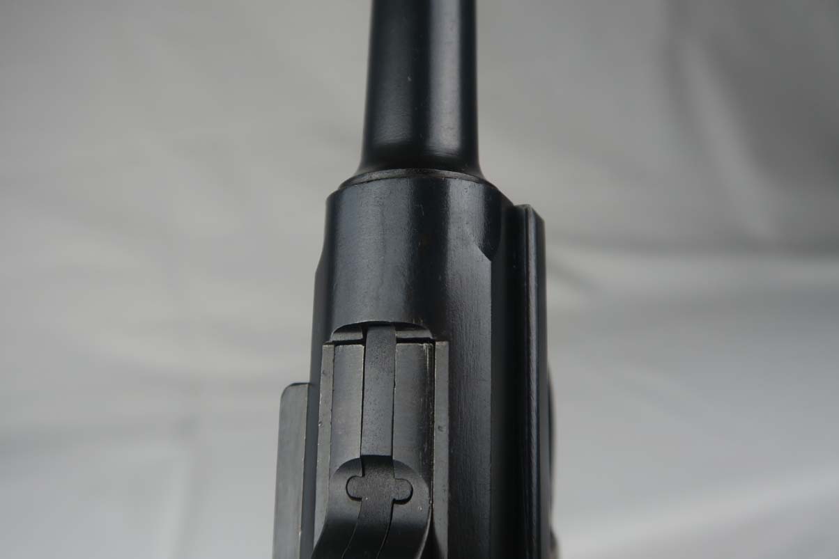 8/23/17 – This is an all original Commercial luger in pristine condition. The original finish is about 99%, with excellent straw color small parts and mint grips.  The gun comes in 30 caliber luger and has an excellent bore – barely shot.   On the commercial guns most of the small parts are not numbered, including the grips.  All parts that are numbered are matching and the serial is unique – #99!   The bottom of the magazine is GERMANY marked meaning this gun was most likely made for export to the US.   The tube of the mag is a bit corroded which does not match the condition of the gun, so I would conclude that the magazine was replaced at some point with another correct magazine.