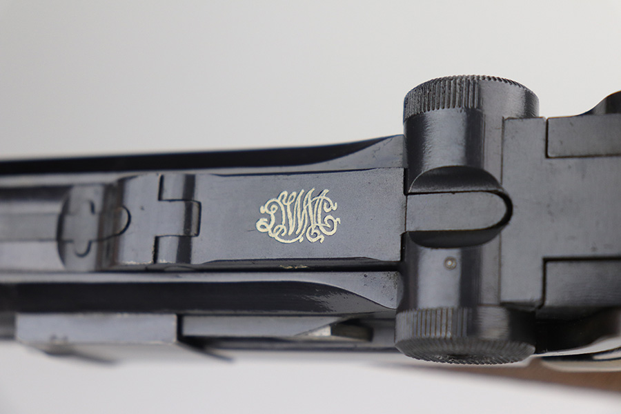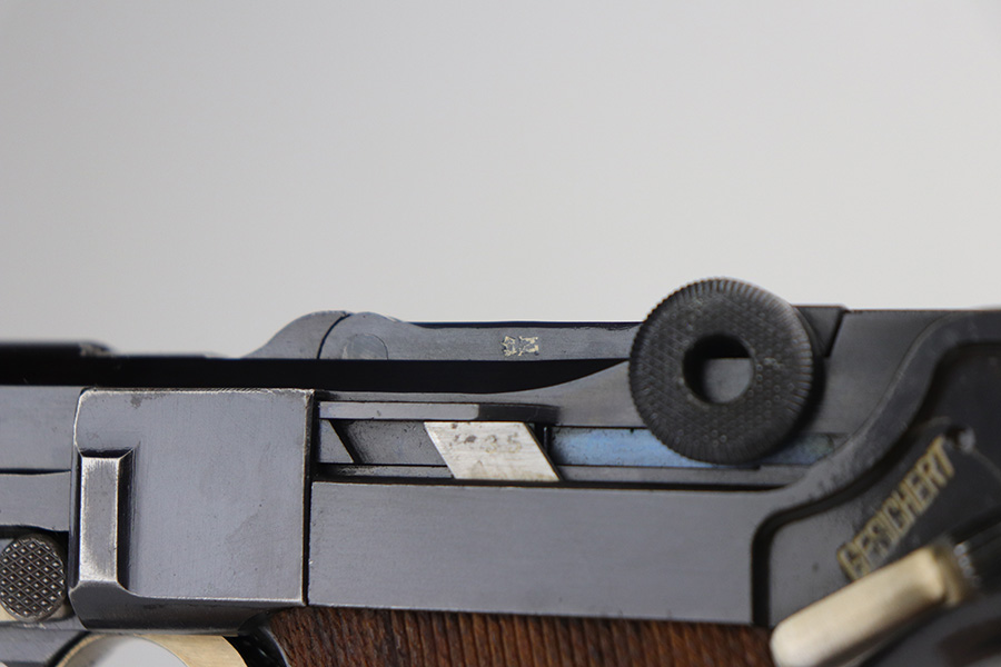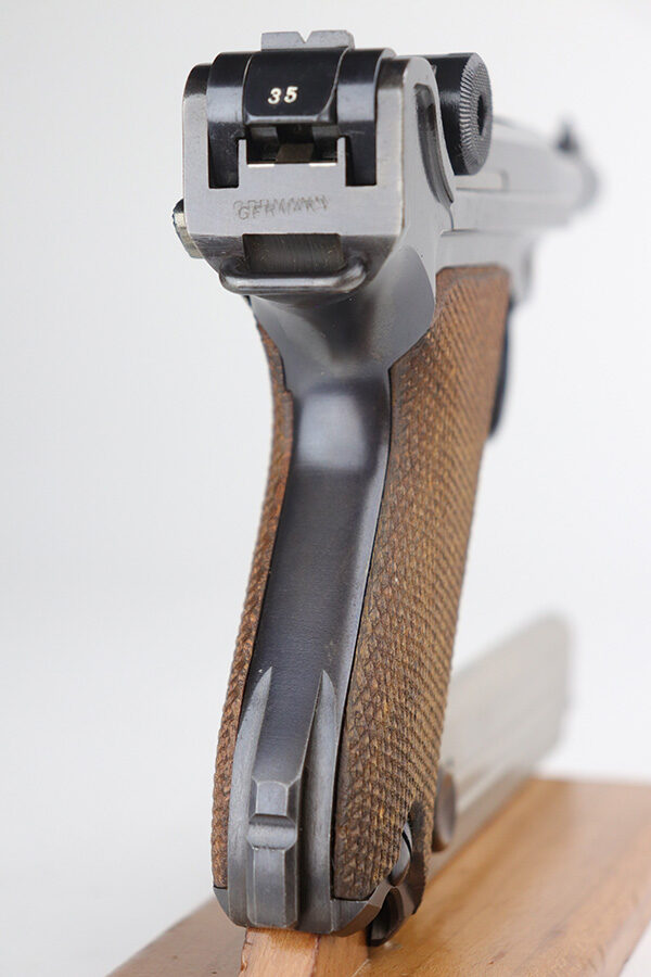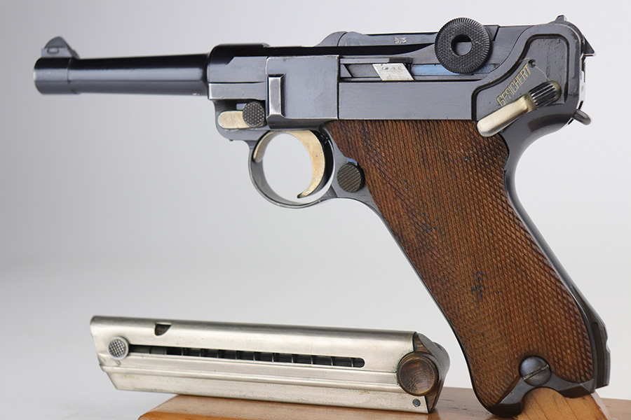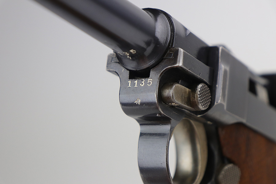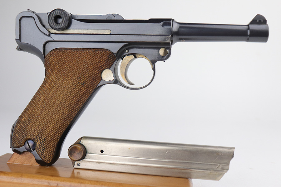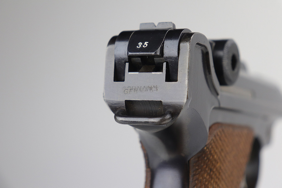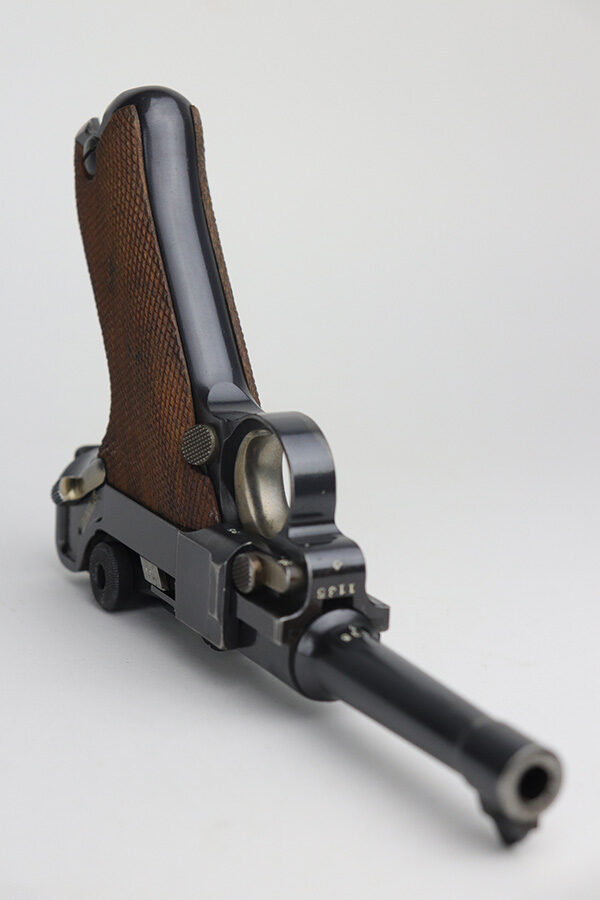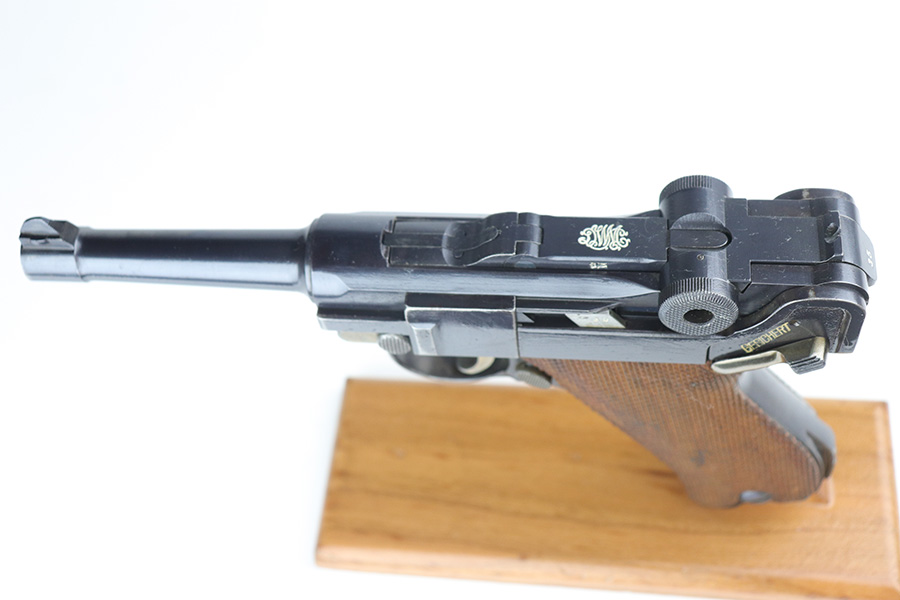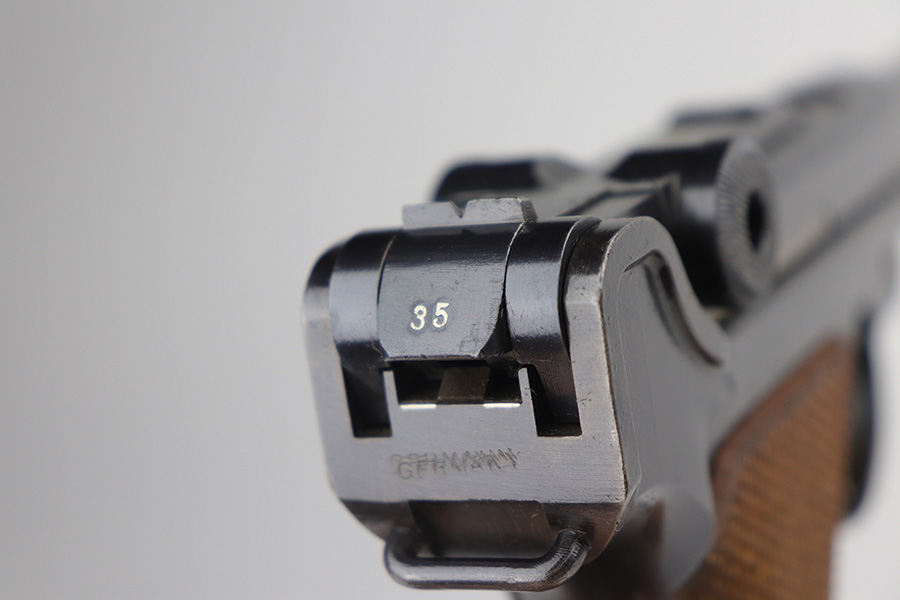 11/30/21 – This is a near-mint example of DWM Luger sold in the commercial market in the 1920’s. Chambered in .30 Luger. It is all matching, lacks a date on the chamber, and has the proper “Crown N” commercial proofs. There is a “Germany” export proof on the back of the frame, indicating it was intended for sale in the international commercial market. It has retained about 98% of its bluing with just hints of wear on the side plate and the very front edges of the side rails. Most of the straw finish is intact on the small parts. Comes with minty un-numbered wood grips and a properly un-numbered period-correct wood-bottom magazine. The bore is mint.