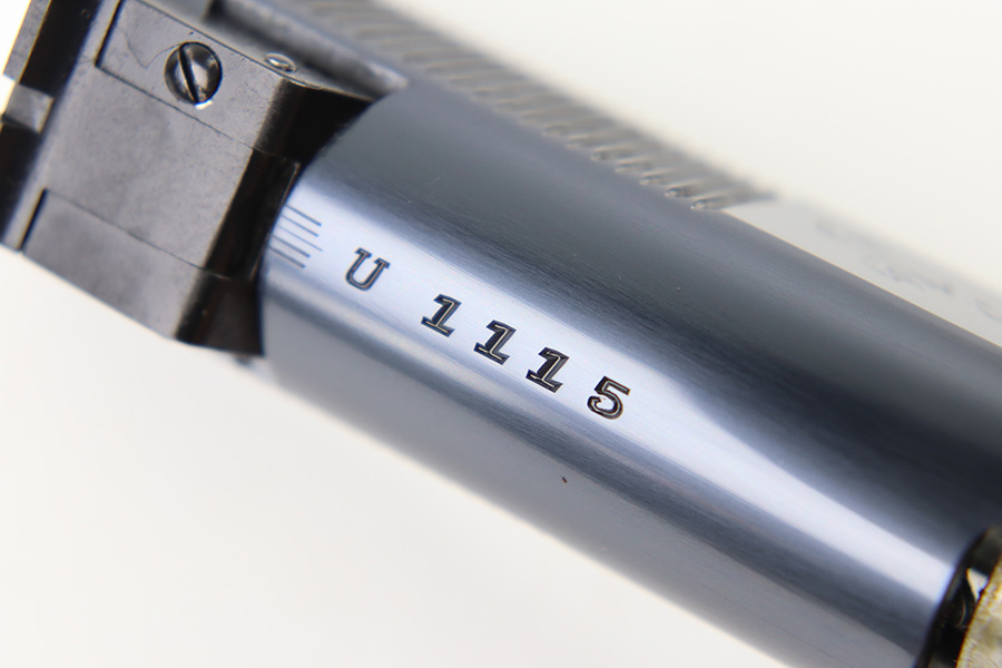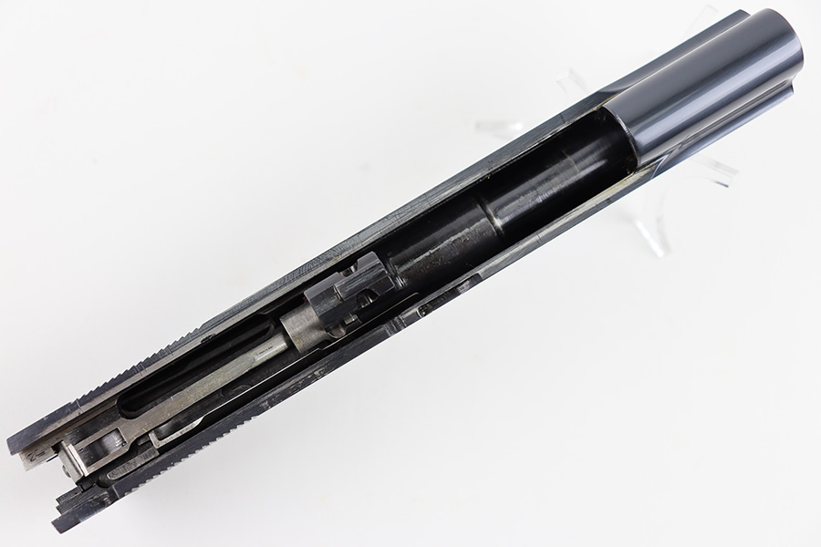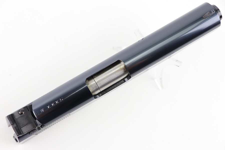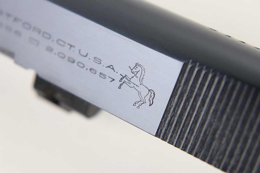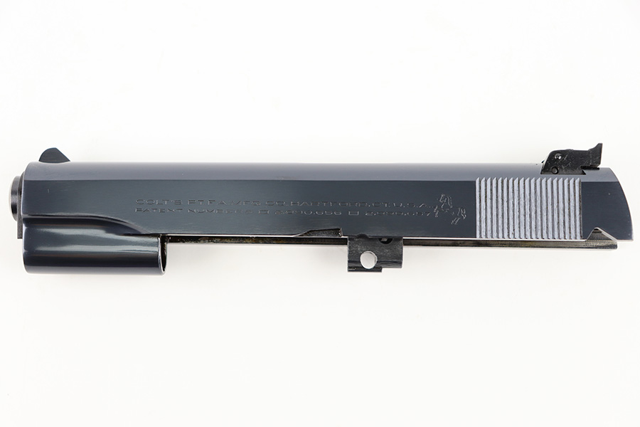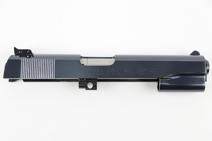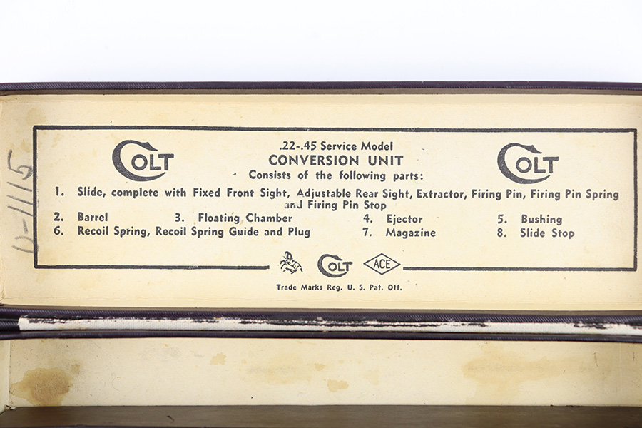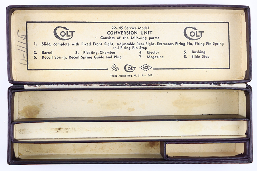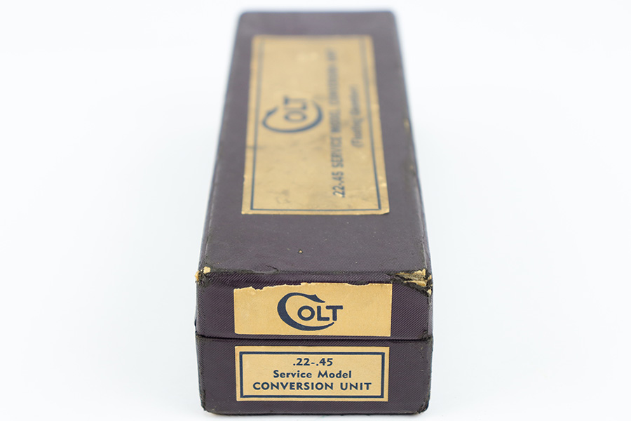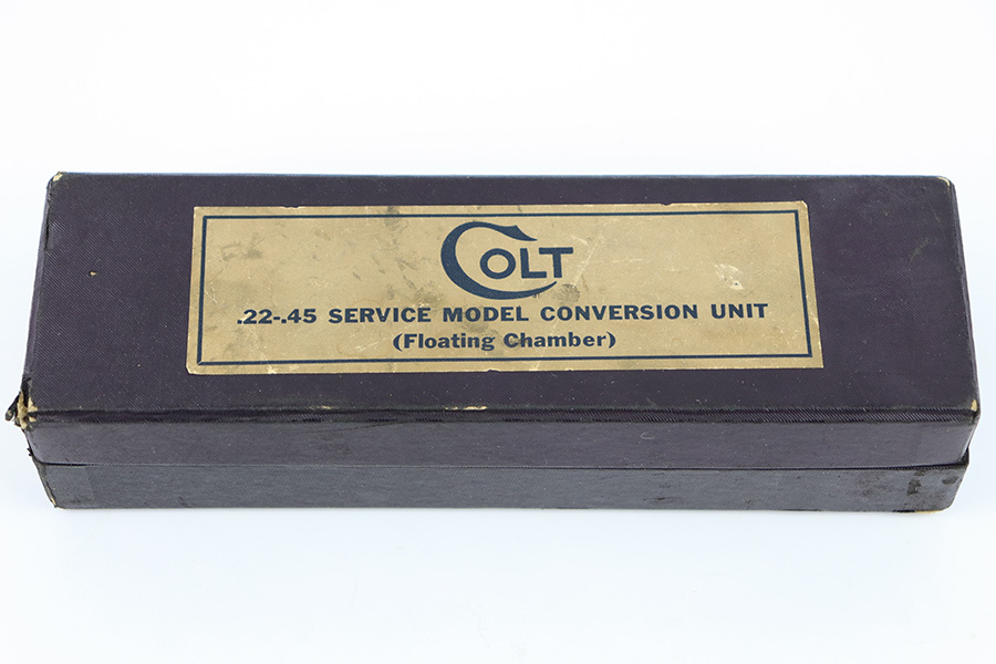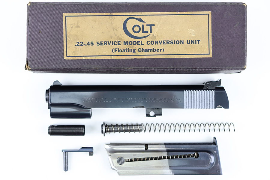 10/5/23 – This is an excellent, minty condition example of a rare pre WW2 production Colt Conversion Kit. The kit is complete with the original box, barrel, slide, recoil spring, barrel bushing, magazine, and wrapping paper. Everything shown in photos. The slide is complete with fixed front sight, adjustable rear sight, extractor, firing pin with spring, and features a floating chamber. The original finish is shiny and clean throughout the slide and blued portion of the magazine. The bore is equally mint with strong rifling throughout. A near-impossible to upgrade example.
