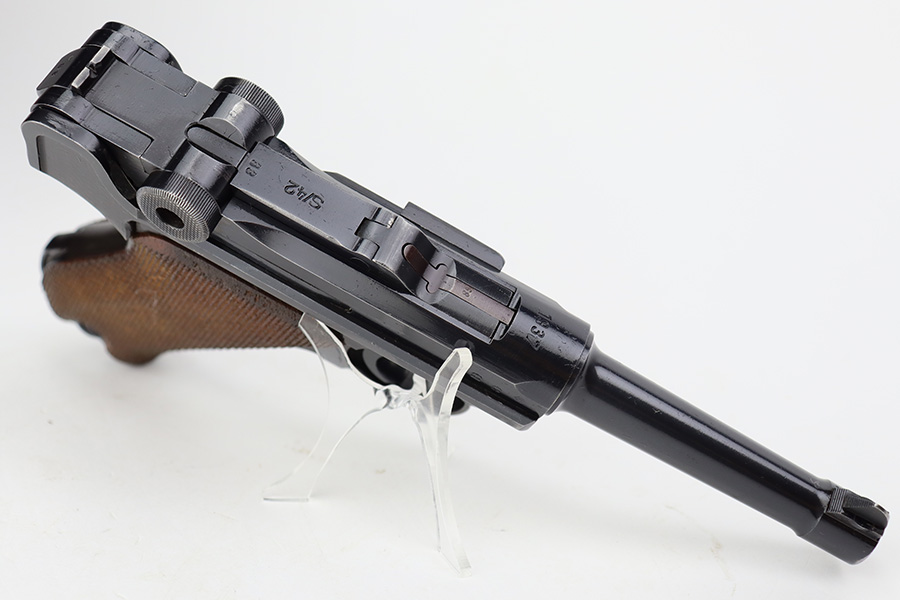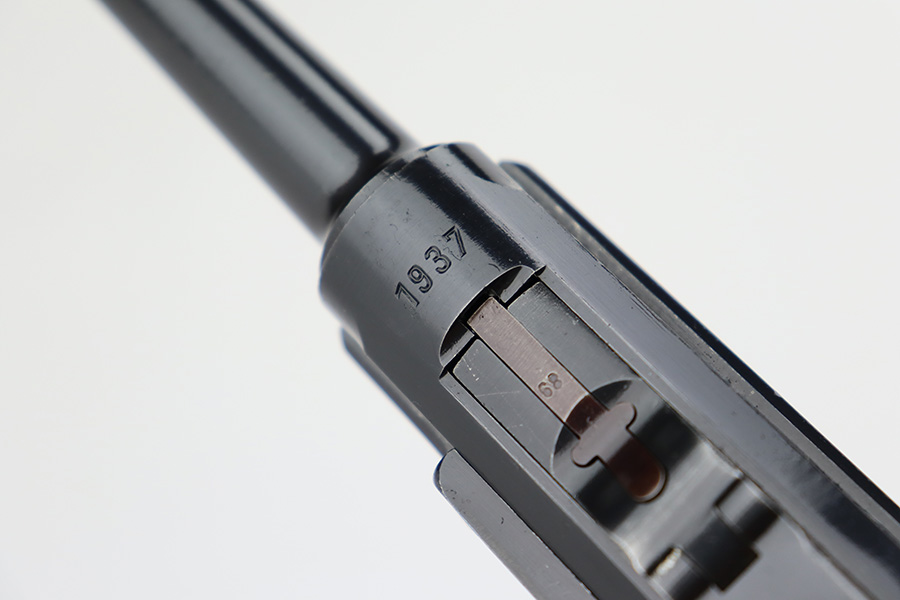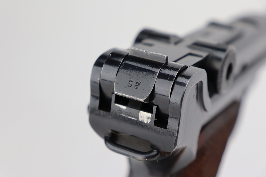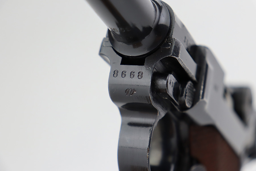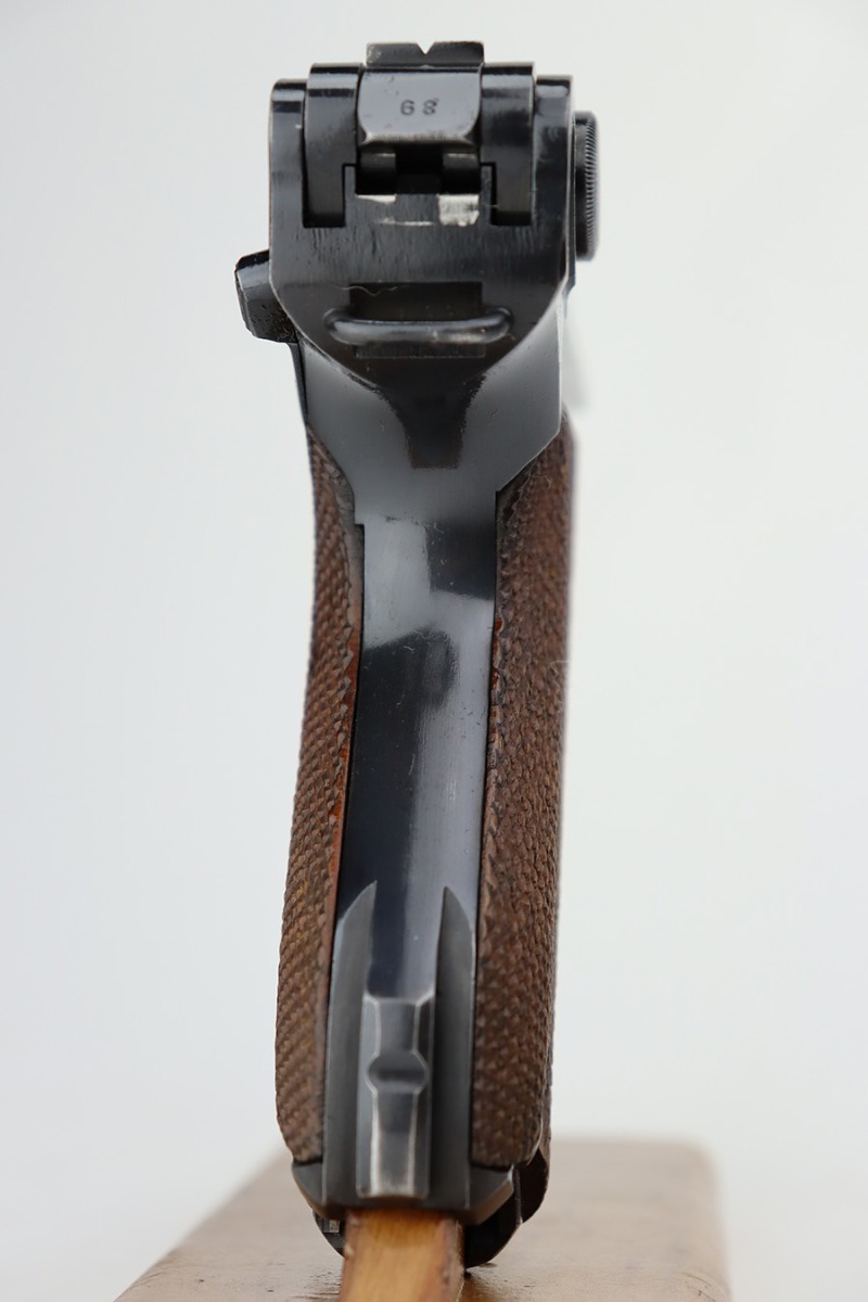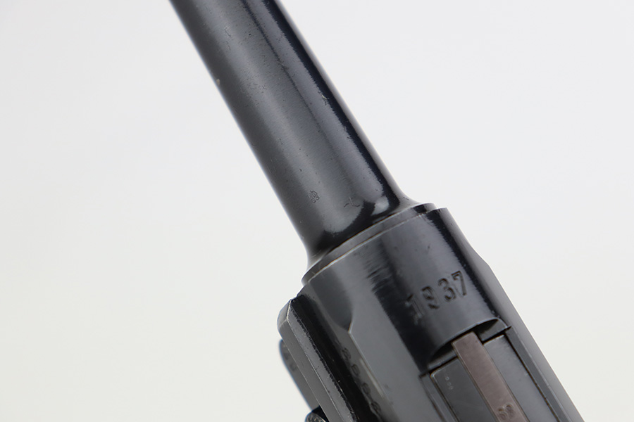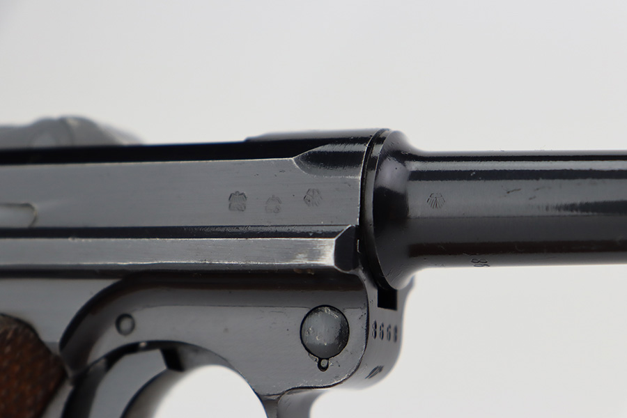 7/12/23 – This is a minty example of a Mauser Luger issued to the Nazi military in 1937. This is a second variation example with blued small parts. All matching with the proper “Eagle 63” military acceptance proofs. It has retained about 97% of its original bling with minor muzzle wear, hints of wear on some of the high edges, and one small spot of wear at the base of the front strap. Fitted with minty matching-numbered wood grips. Comes with a mismatched “Eagle 63” proofed magazine. The bore has great rifling with some light freckling in the grooves.