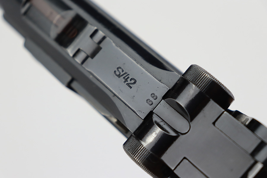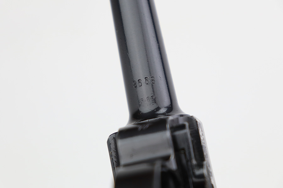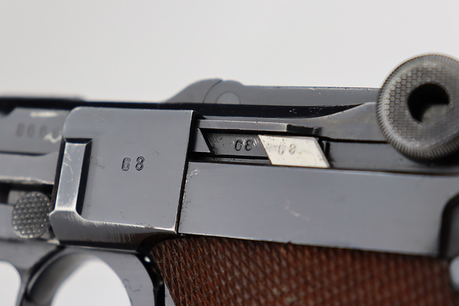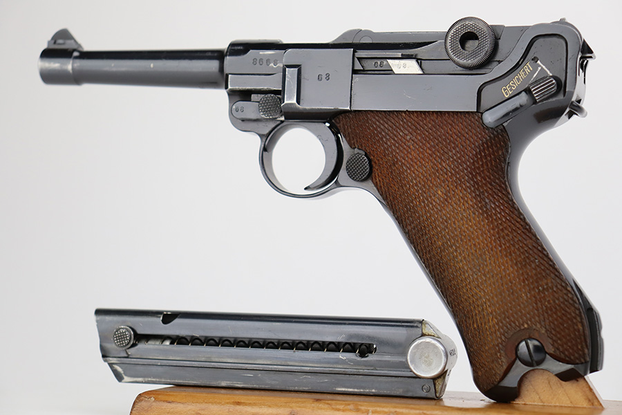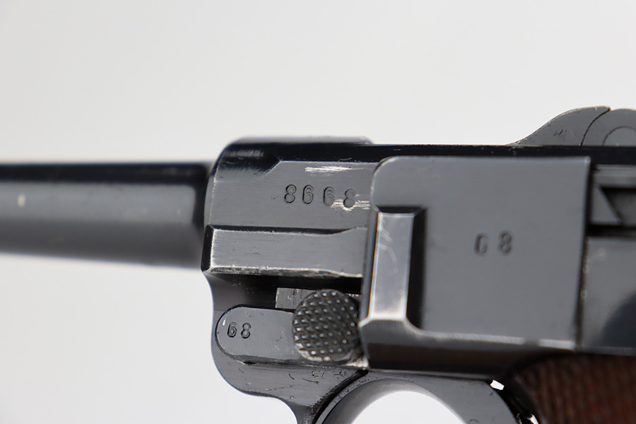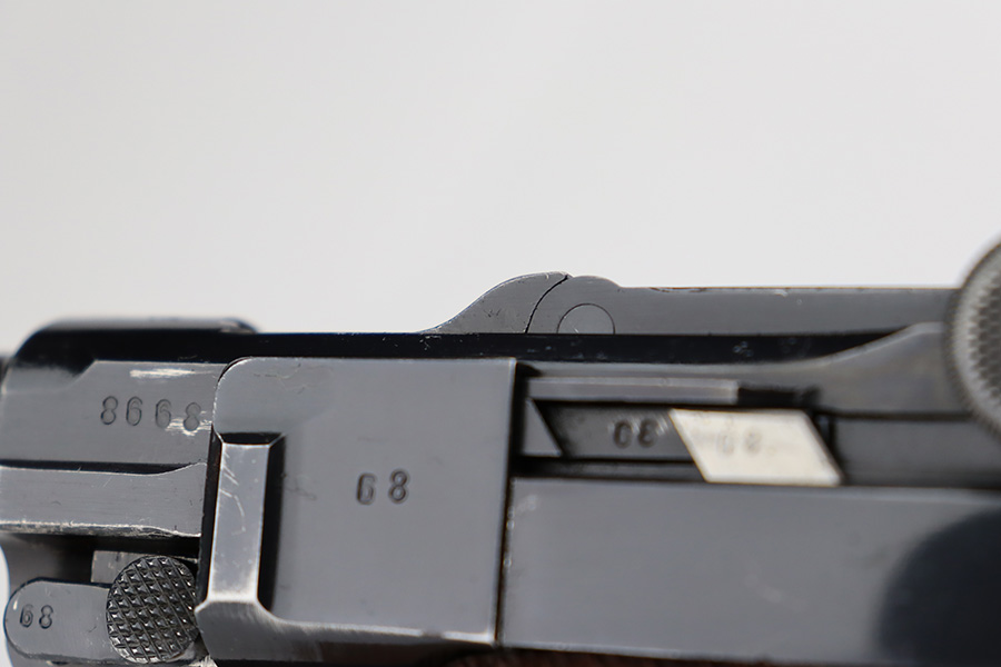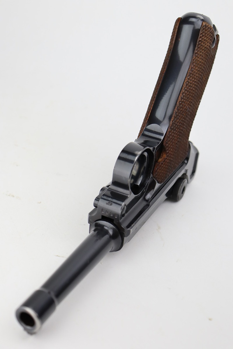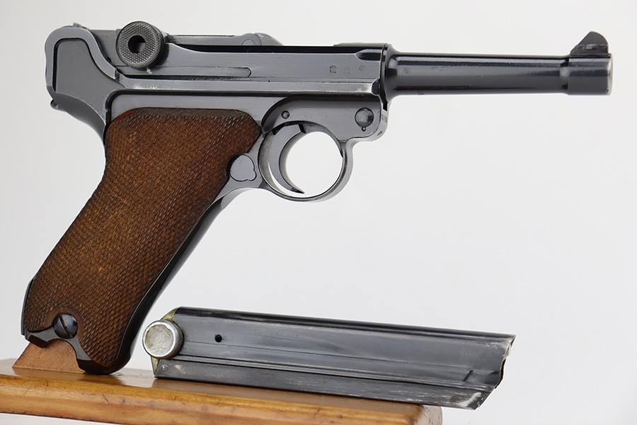 7/12/23 – This is a minty example of a Mauser Luger issued to the Nazi military in 1937. This is a second variation example with blued small parts. All matching with the proper “Eagle 63” military acceptance proofs. It has retained about 97% of its original bling with minor muzzle wear, hints of wear on some of the high edges, and one small spot of wear at the base of the front strap. Fitted with minty matching-numbered wood grips. Comes with a mismatched “Eagle 63” proofed magazine. The bore has great rifling with some light freckling in the grooves.