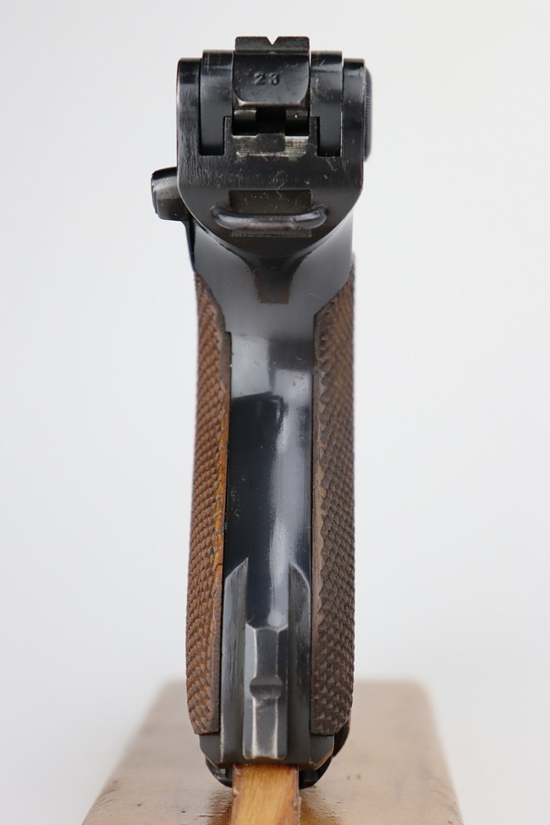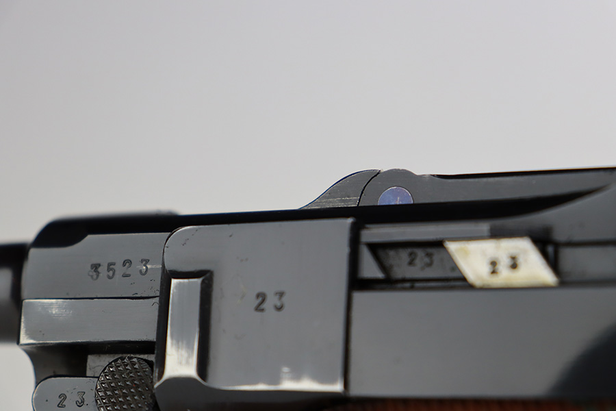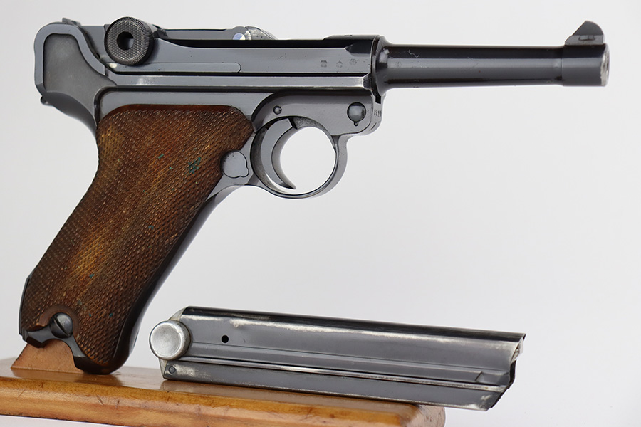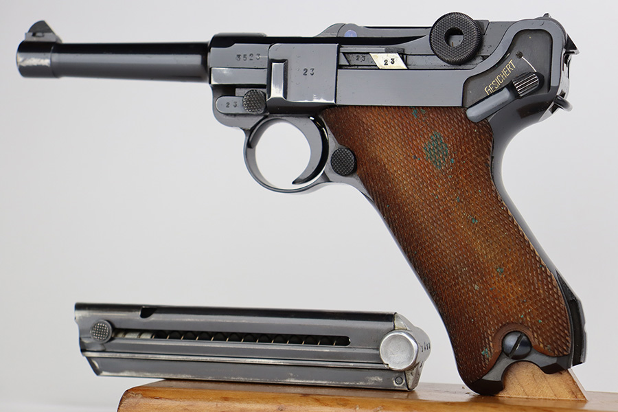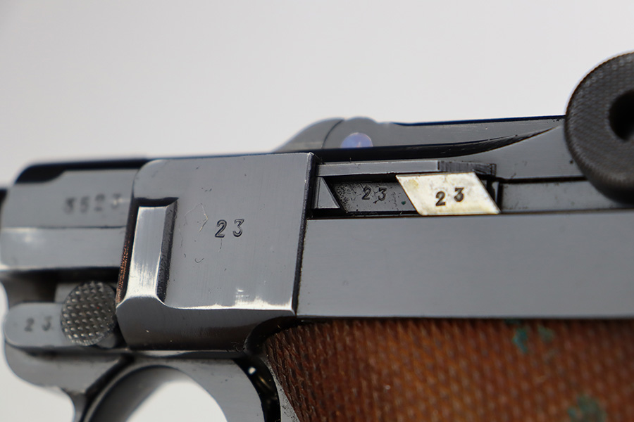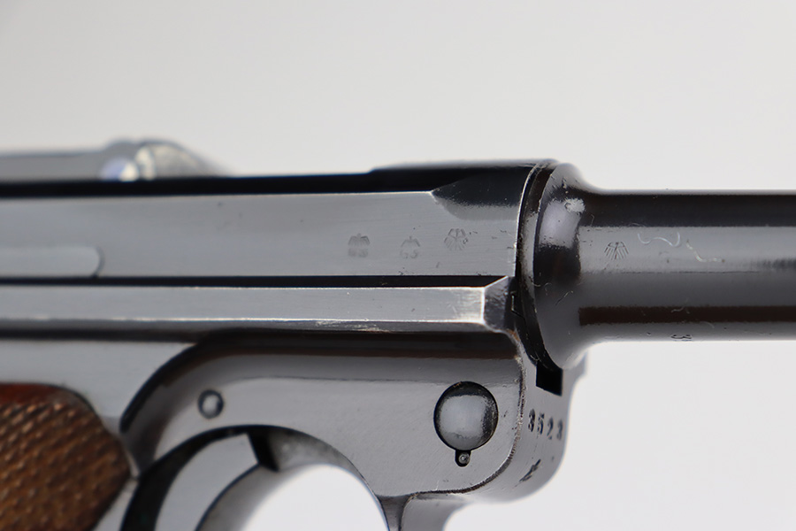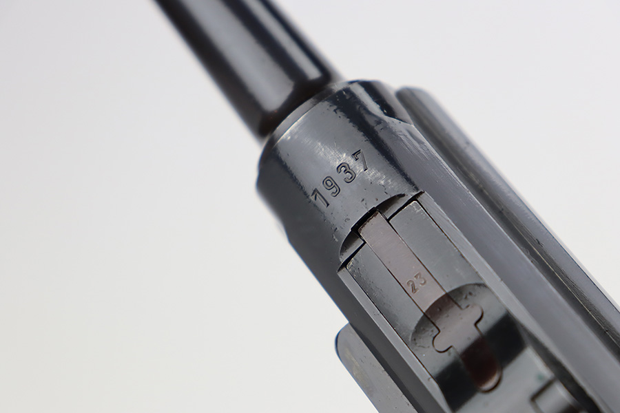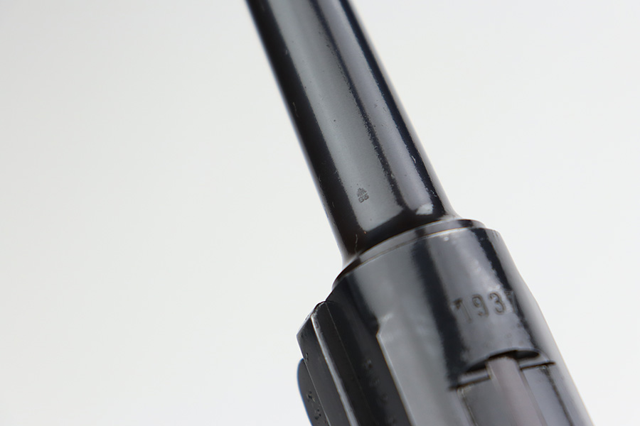 7/31/23 – This is a minty example of a Mauser Luger from 1937. Second variation example with blued small parts. All matching with the proper “Eagle 63” military acceptance proofs. About 97% of the blue remains, with very minor wear around the muzzle and on the side plate. Hints of freckling on the grip straps. Fitted with minty matching-numbered wood grips – some green verdigris here and there. Comes with a mismatched but period-correct “Eagle 63” marked magazine. The bore is shiny with strong rifling and just a few small spots of light freckling.