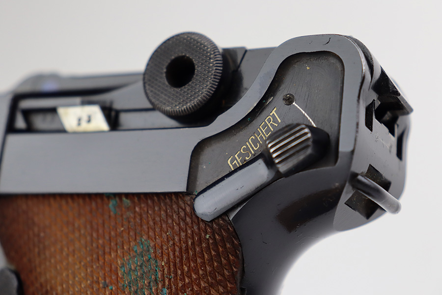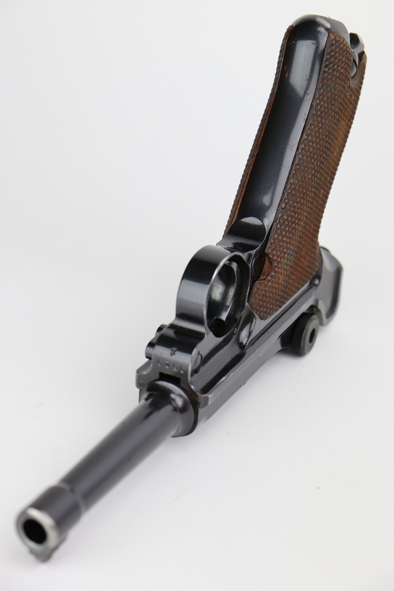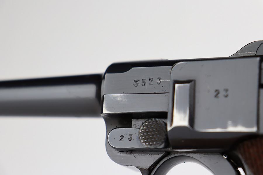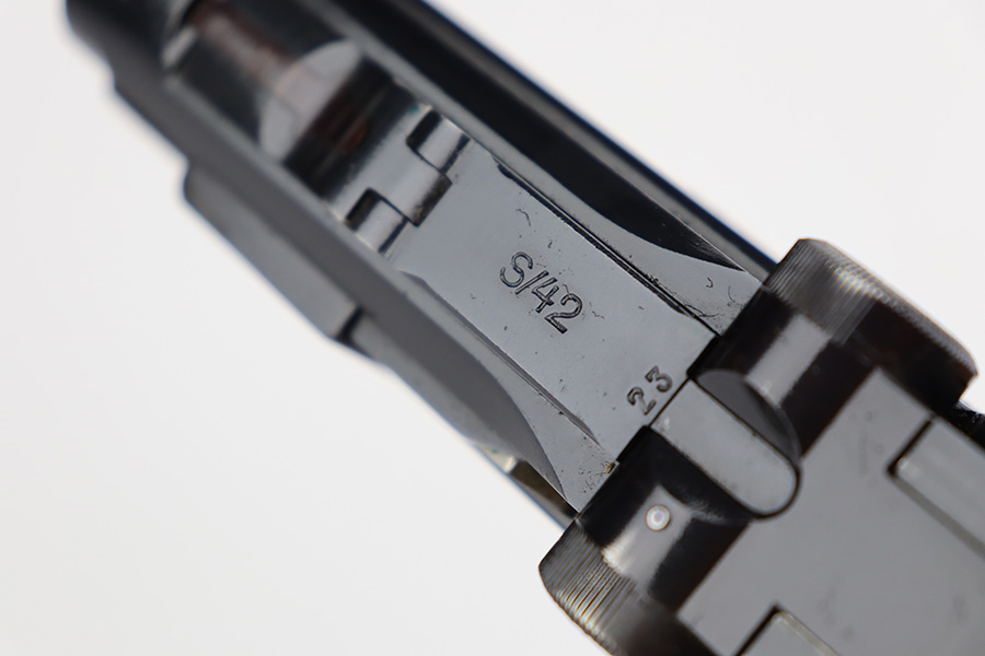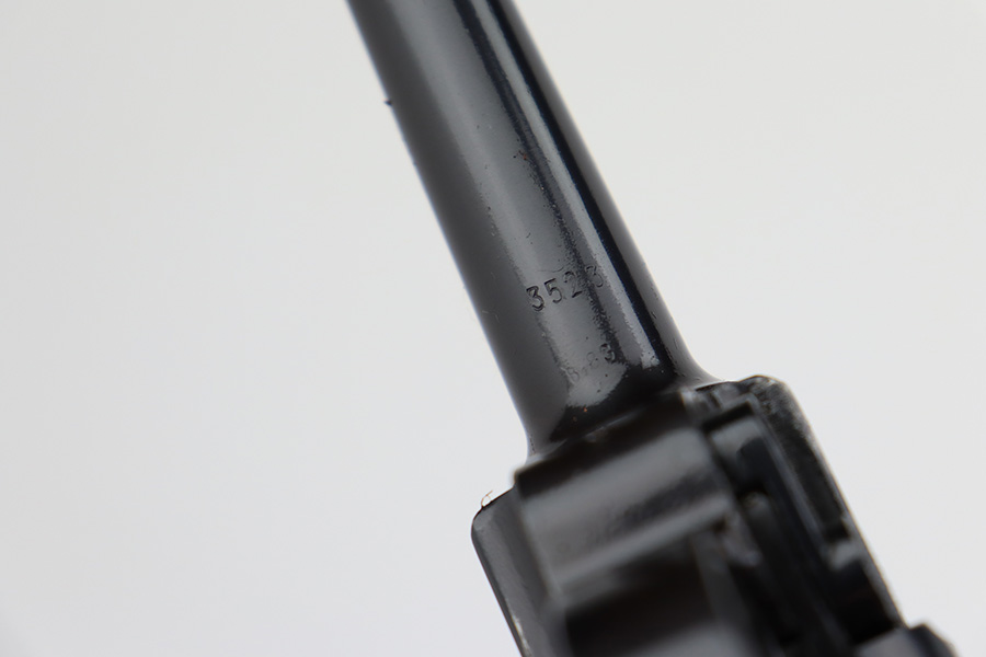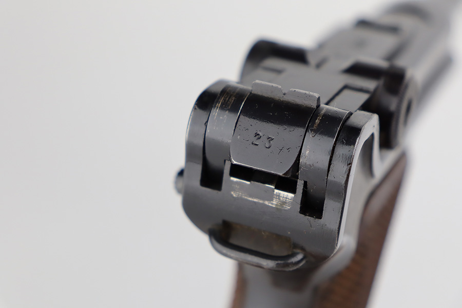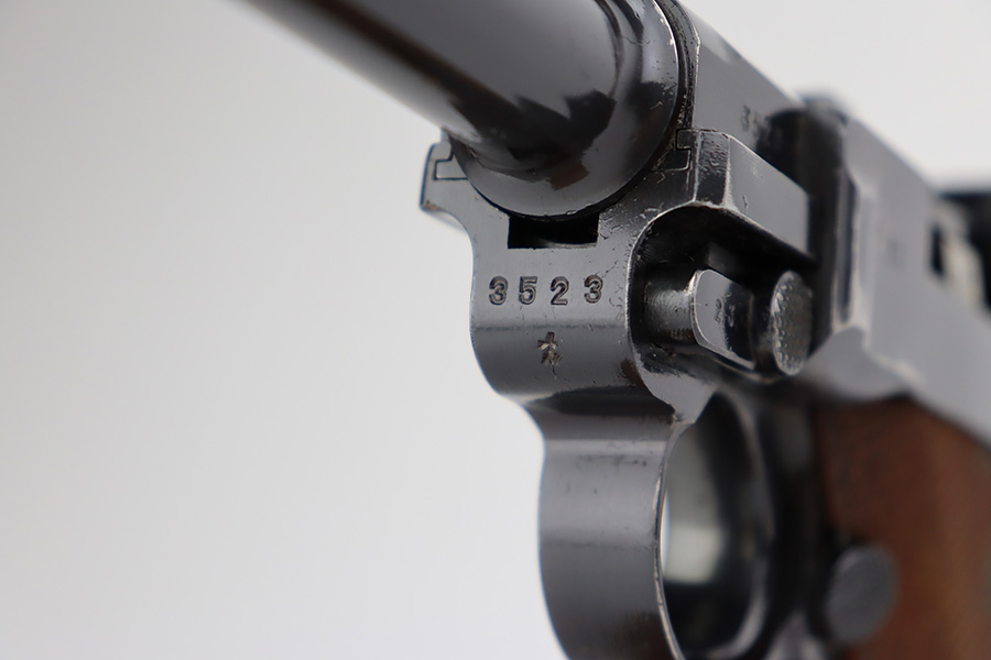 7/31/23 – This is a minty example of a Mauser Luger from 1937. Second variation example with blued small parts. All matching with the proper “Eagle 63” military acceptance proofs. About 97% of the blue remains, with very minor wear around the muzzle and on the side plate. Hints of freckling on the grip straps. Fitted with minty matching-numbered wood grips – some green verdigris here and there. Comes with a mismatched but period-correct “Eagle 63” marked magazine. The bore is shiny with strong rifling and just a few small spots of light freckling.
