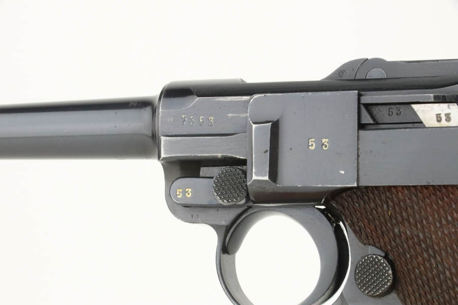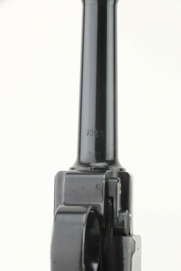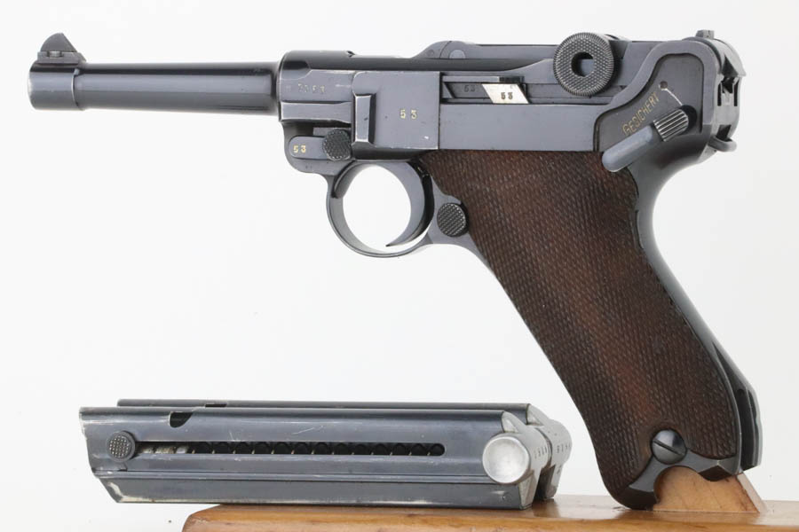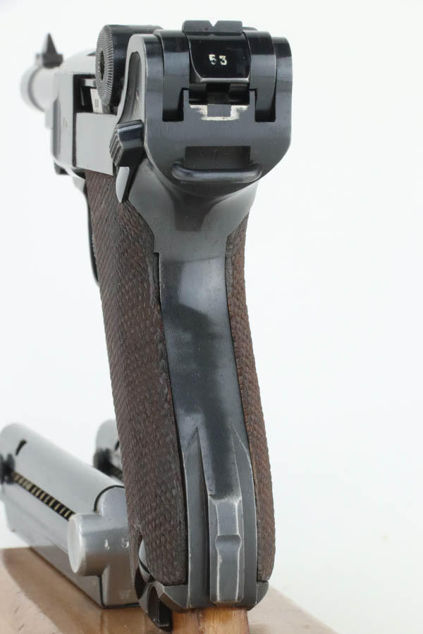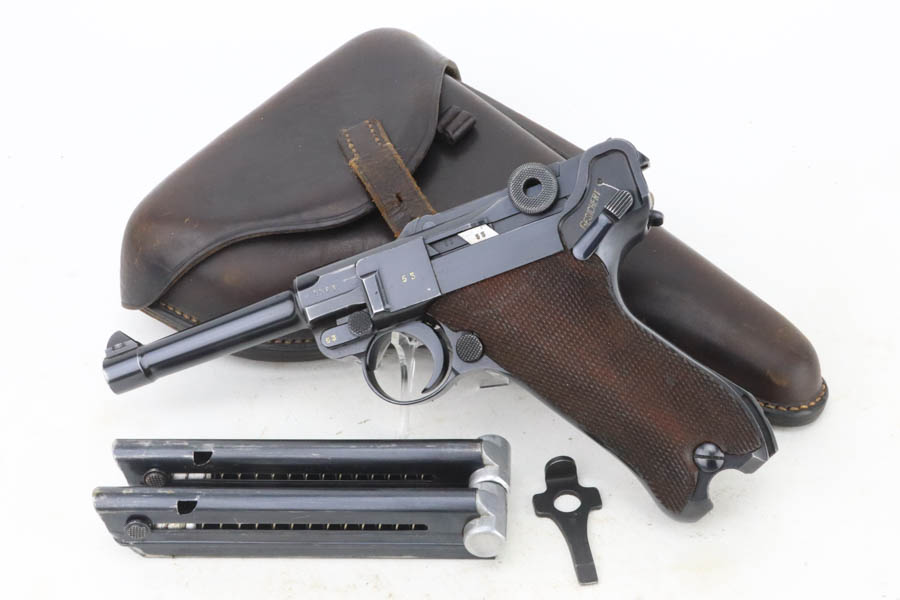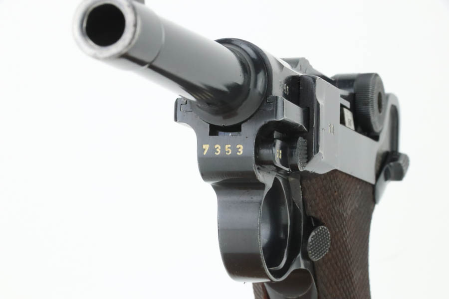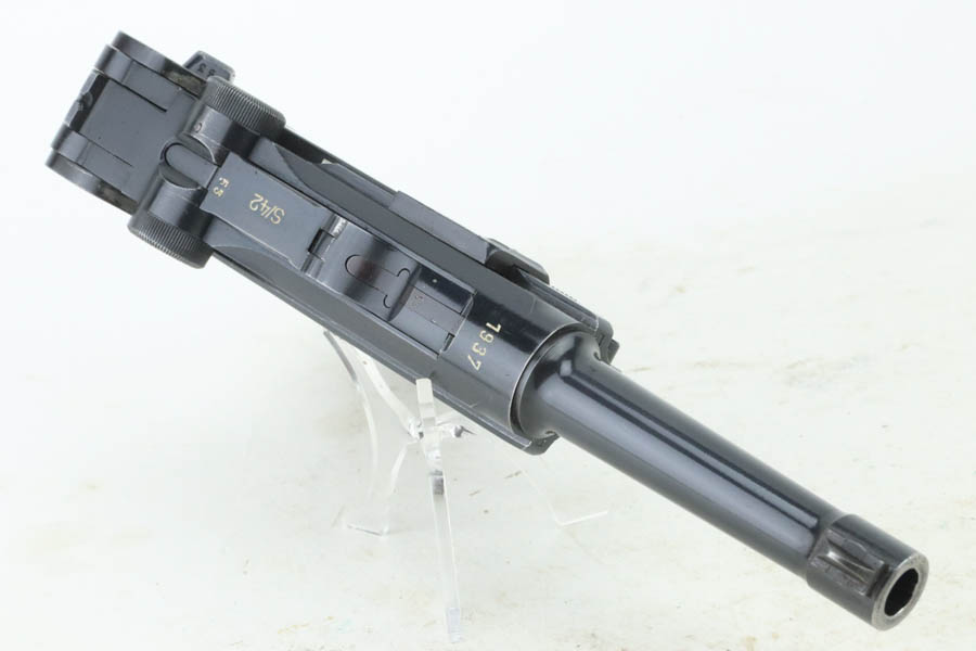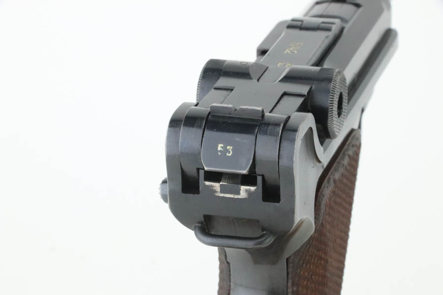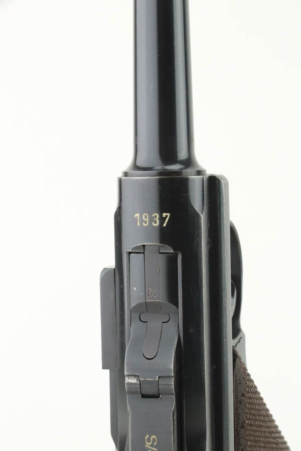 7/25/24 – This is a near-mint example of a Mauser Luger issued to the Nazi military in 1937. All matching with the proper “Eagle 63” military acceptance proofs. It comes as a rig with two mismatched but period-correct “Eagle 63” magazines, an “Eagle 63” tool, and an excellent 1937-dated holster. The gun itself has retained nearly all of its finish with just hints of wear around the muzzle and on some of the high edges. Fitted with mint matching-numbered wood grips. The bore is mostly shiny with great rifling, but there is light freckling throughout.
