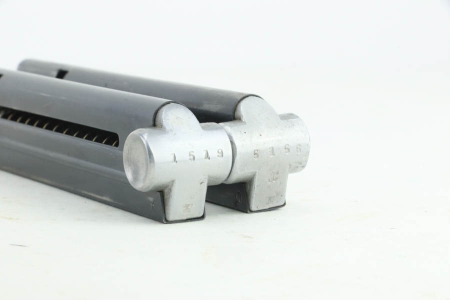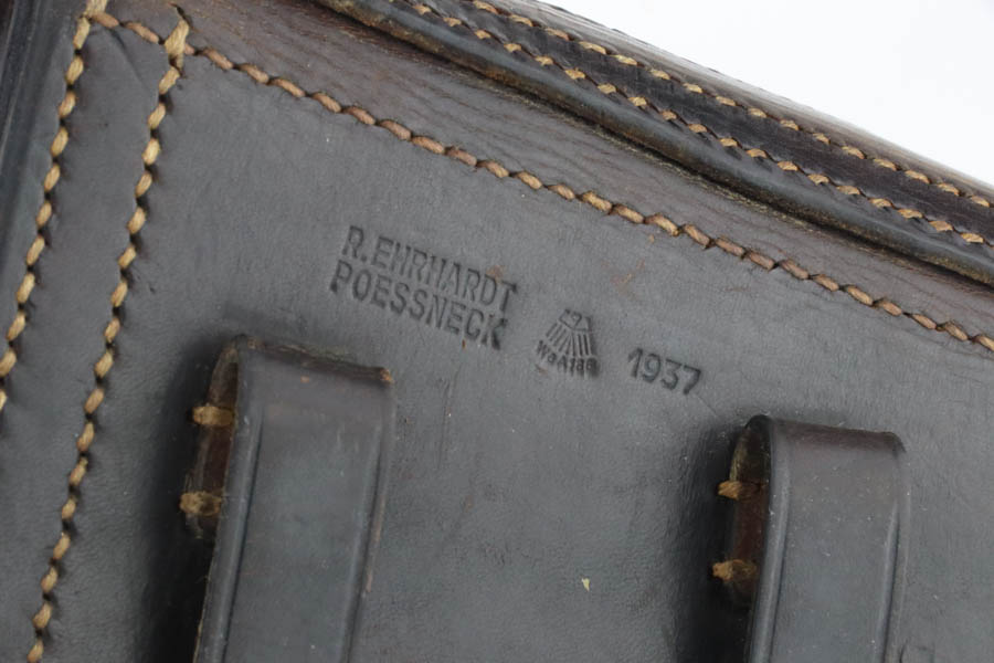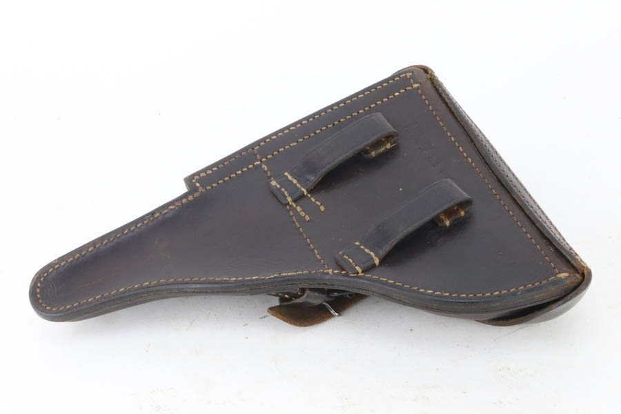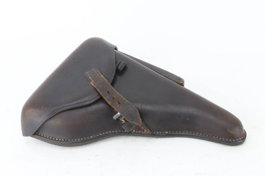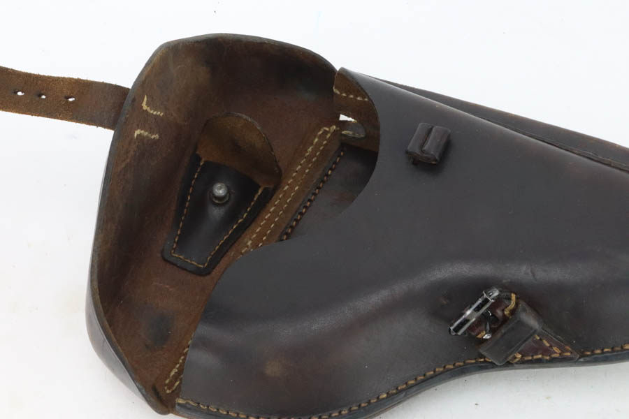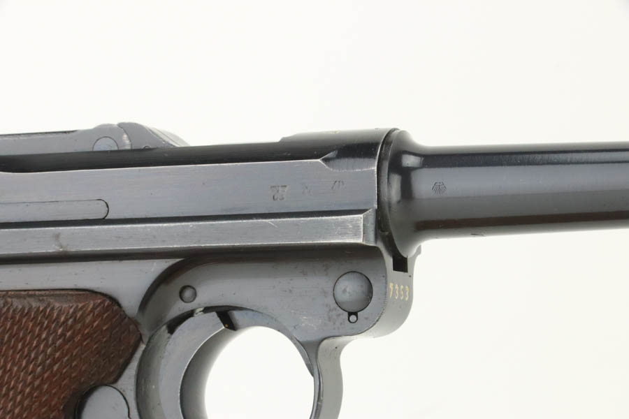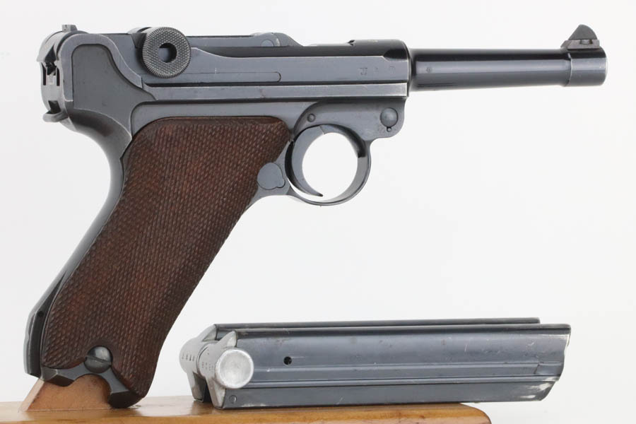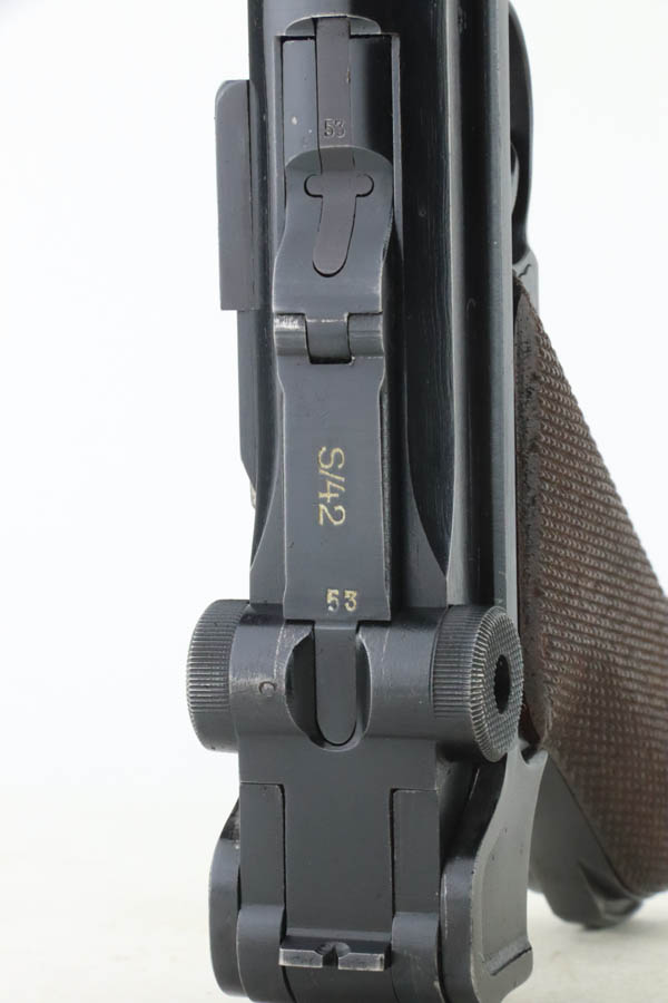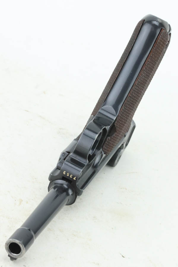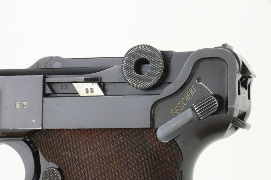 7/25/24 – This is a near-mint example of a Mauser Luger issued to the Nazi military in 1937. All matching with the proper “Eagle 63” military acceptance proofs. It comes as a rig with two mismatched but period-correct “Eagle 63” magazines, an “Eagle 63” tool, and an excellent 1937-dated holster. The gun itself has retained nearly all of its finish with just hints of wear around the muzzle and on some of the high edges. Fitted with mint matching-numbered wood grips. The bore is mostly shiny with great rifling, but there is light freckling throughout.
