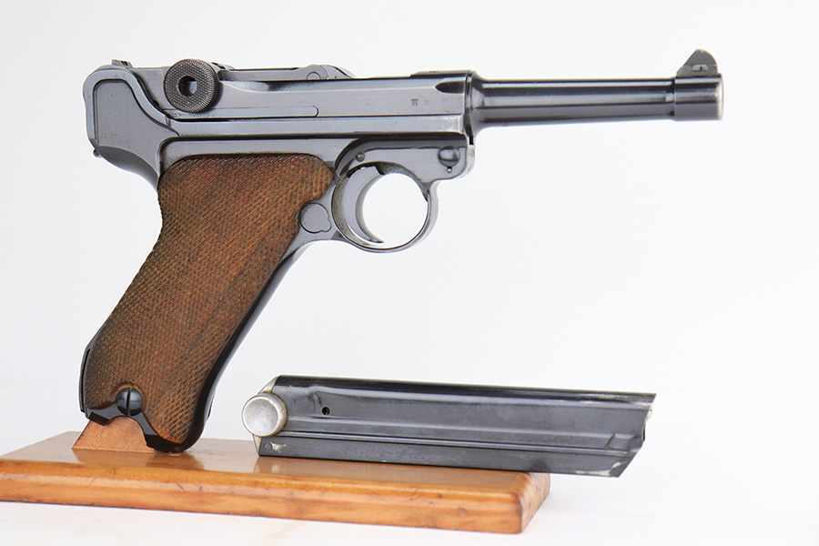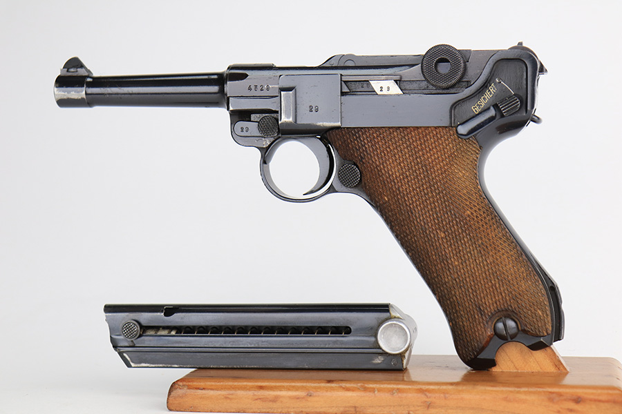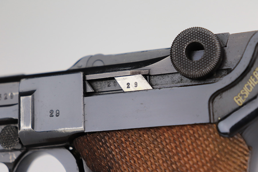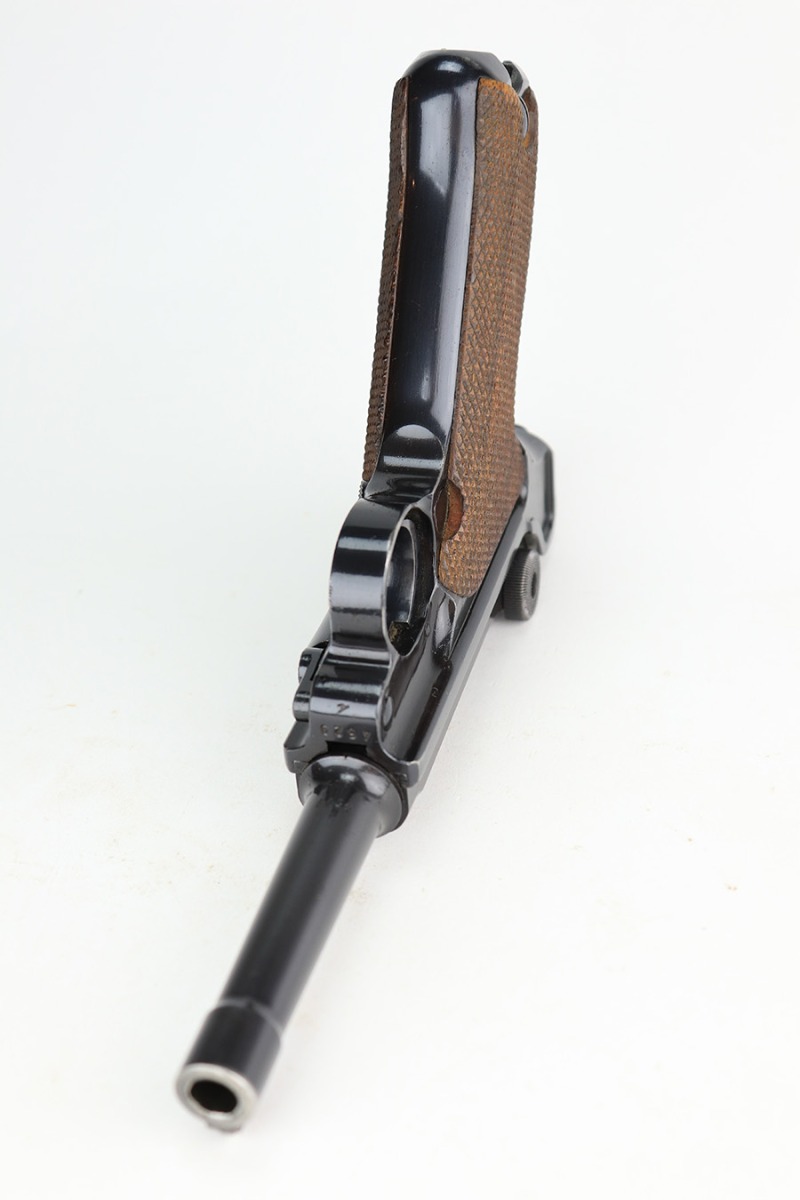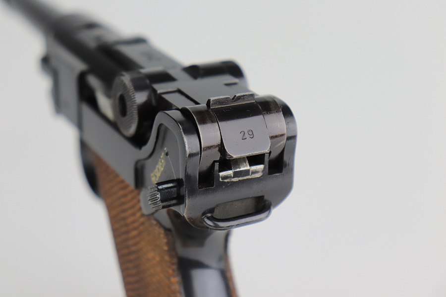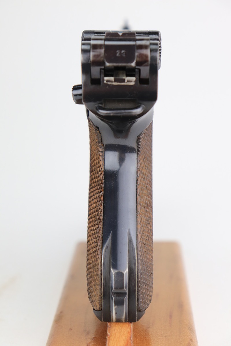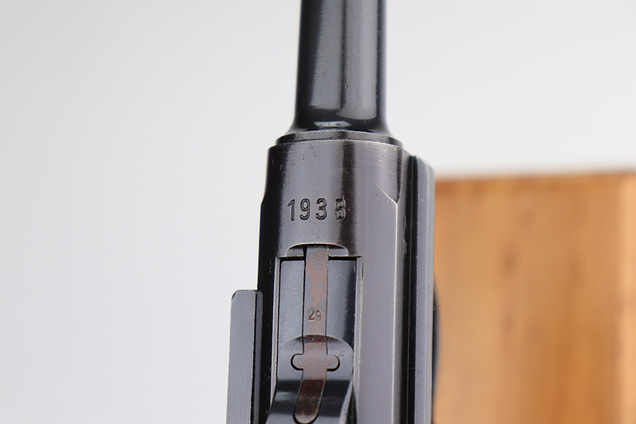 2/3/23 – This is a minty example of a Mauser Luger issued to the Nazi military in 1938. It is all matching and has the proper “Eagle 83” military acceptance proofs. It has retained about 97% of its original finish with just very minor wear around the muzzle and on the side plate. The left side of the barrel has a small area of speckling wear as well. Fitted with minty wood grips and comes with a mismatched, but desirable 3-digit “Eagle 83” proofed magazine. The bore has great rifling, but there is very minor frosting and patina throughout.