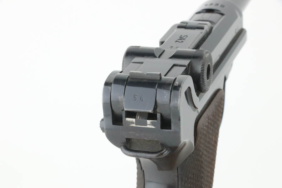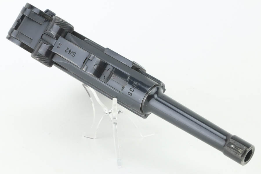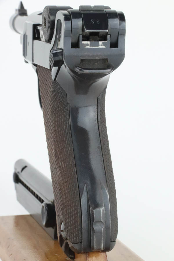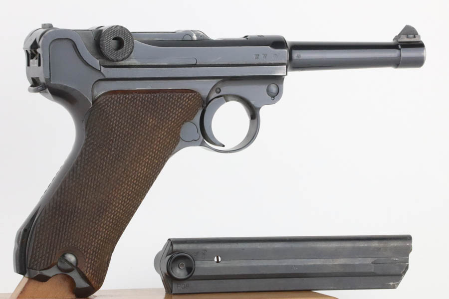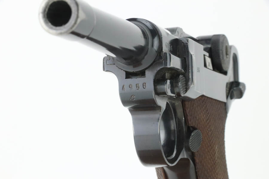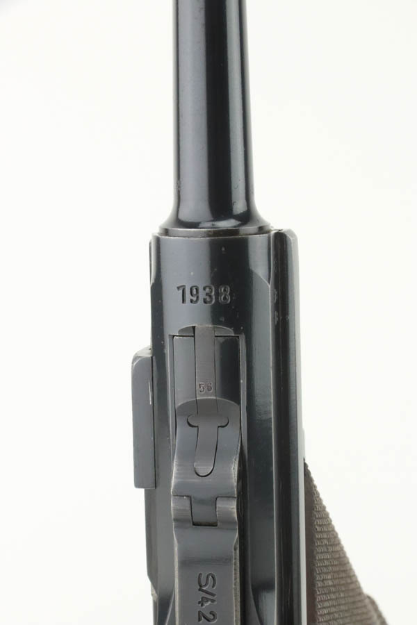8/6/24 – This is a minty example of a Mauser Luger issued to the Nazi military in 1938. All matching with the proper “Eagle 83” military acceptance proofs. It has retained about 97% of its original bluing with just very minor high edge and muzzle wear. Fitted with minty matching-numbered wood grips and comes with an original “black widow” magazine. Very nice bore with good rifling and just some minor frosting in the grooves.