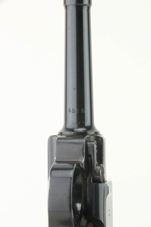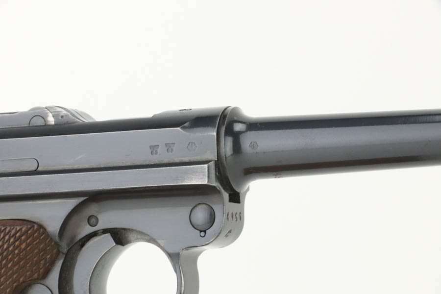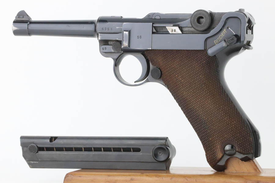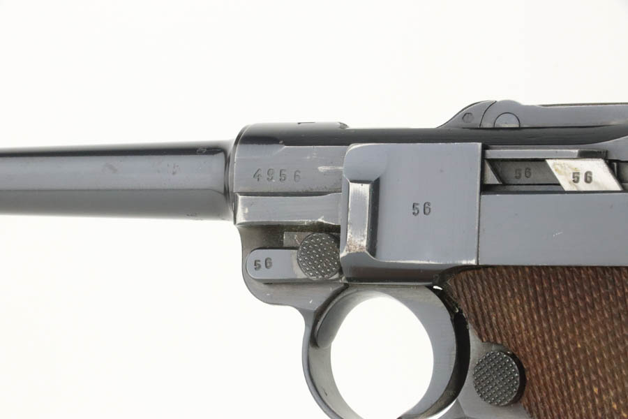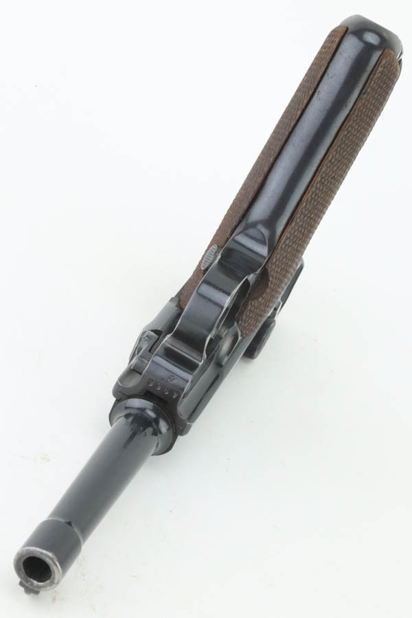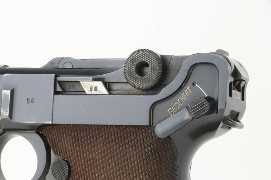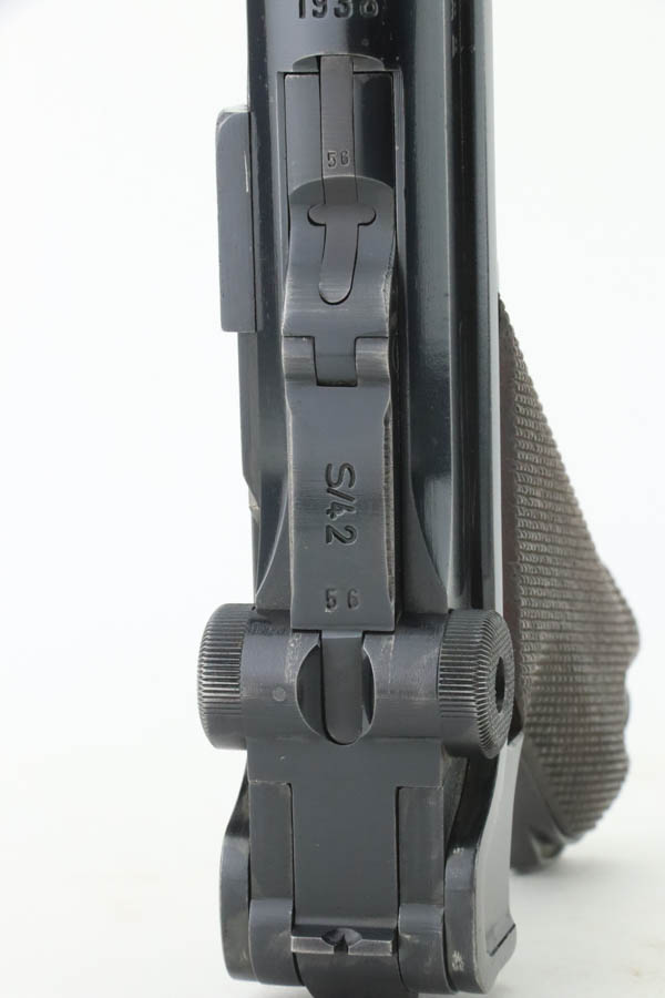 8/6/24 – This is a minty example of a Mauser Luger issued to the Nazi military in 1938. All matching with the proper “Eagle 83” military acceptance proofs. It has retained about 97% of its original bluing with just very minor high edge and muzzle wear. Fitted with minty matching-numbered wood grips and comes with an original “black widow” magazine. Very nice bore with good rifling and just some minor frosting in the grooves.