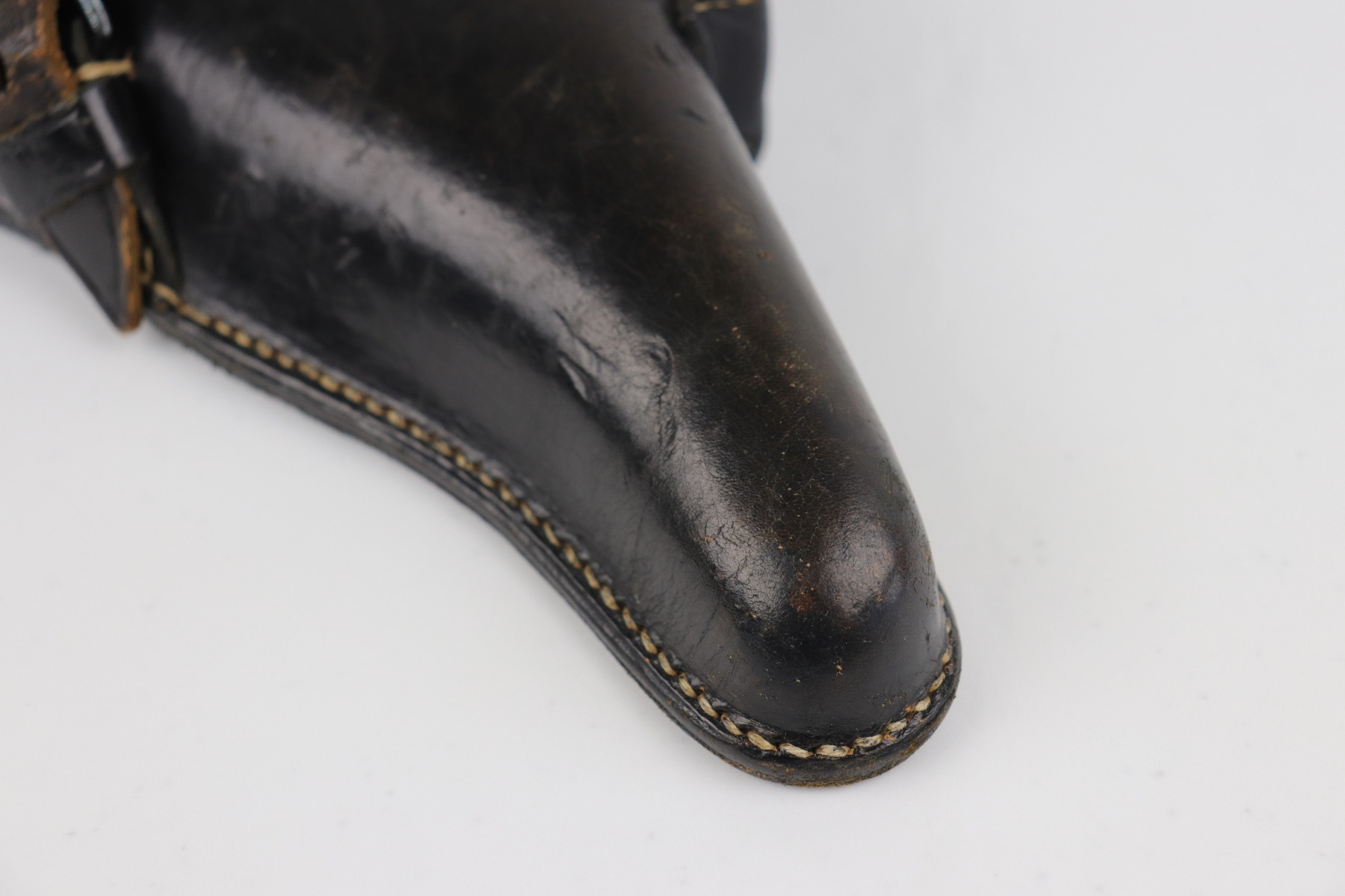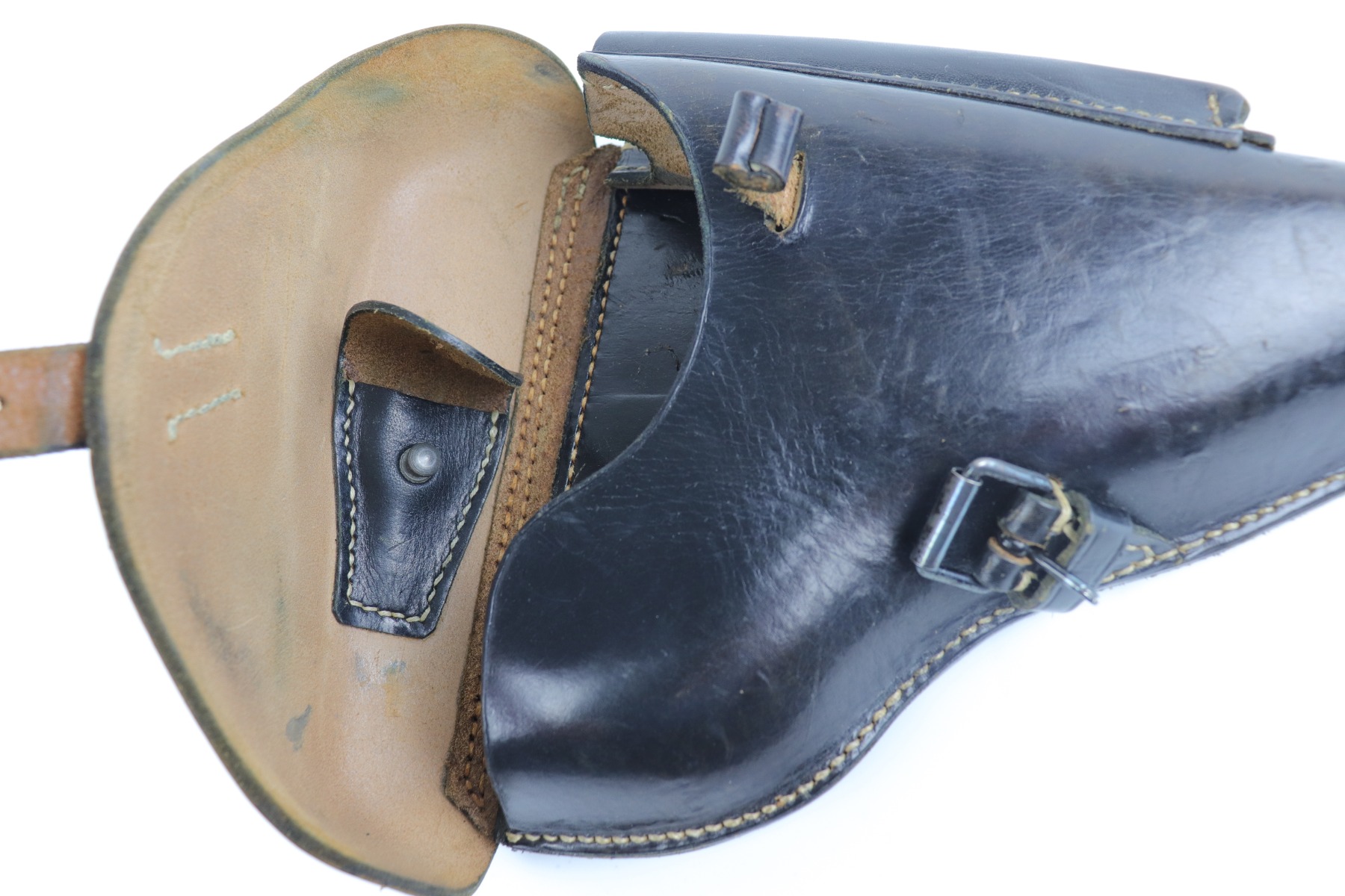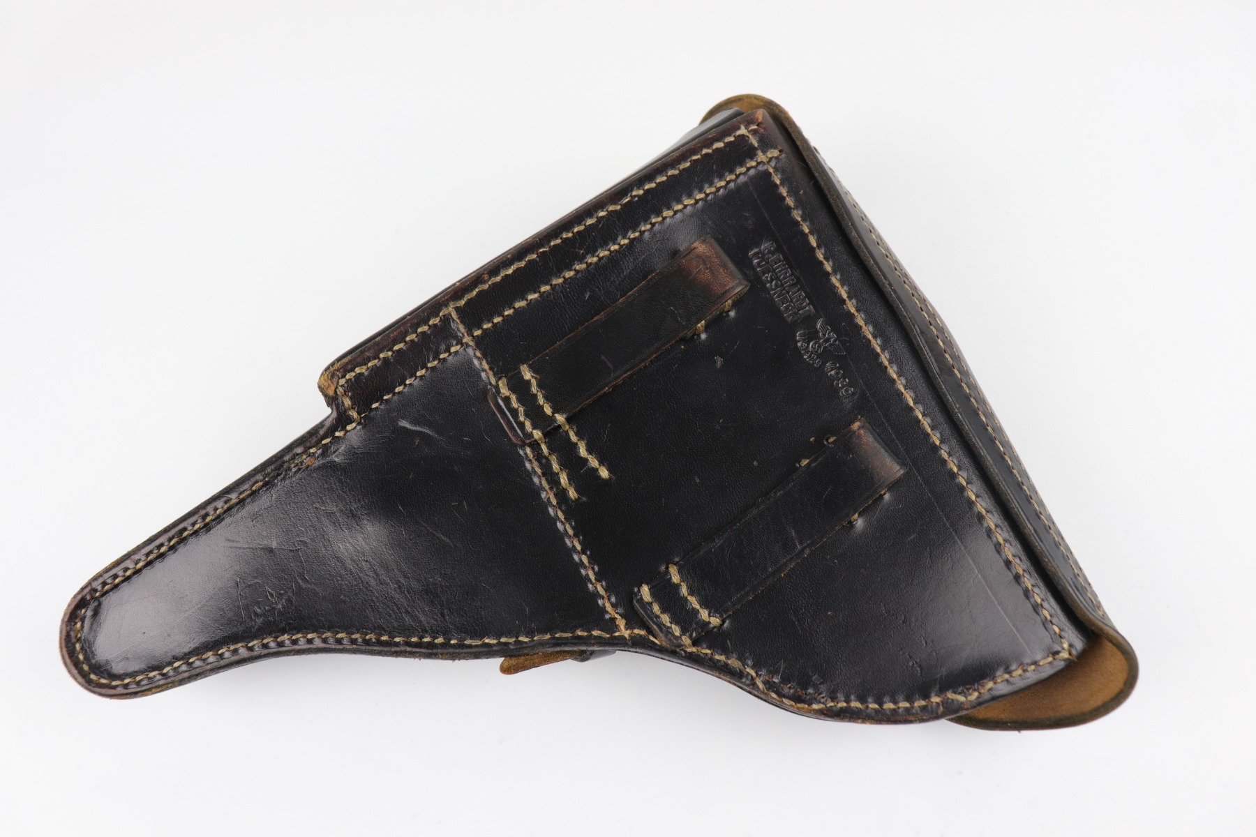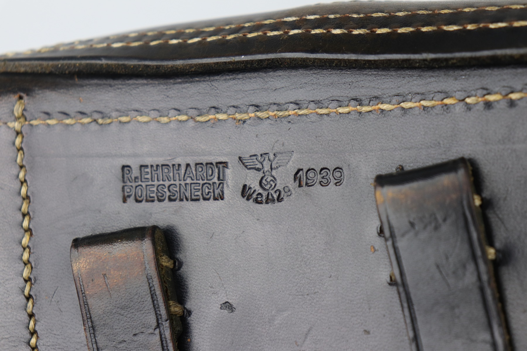 6/26/20 – This is a minty black leather Luger holster, made in 1939. It is makers-marked “R. Ehrhardt Poessneck”. It is waffenamt “Waffen Eagle 29”. The markings are extremely crisp and visible. This holster is in like-new, unissued condition. The only sign of wear is a few very light surface marks here and there. The stitching is original and excellent.