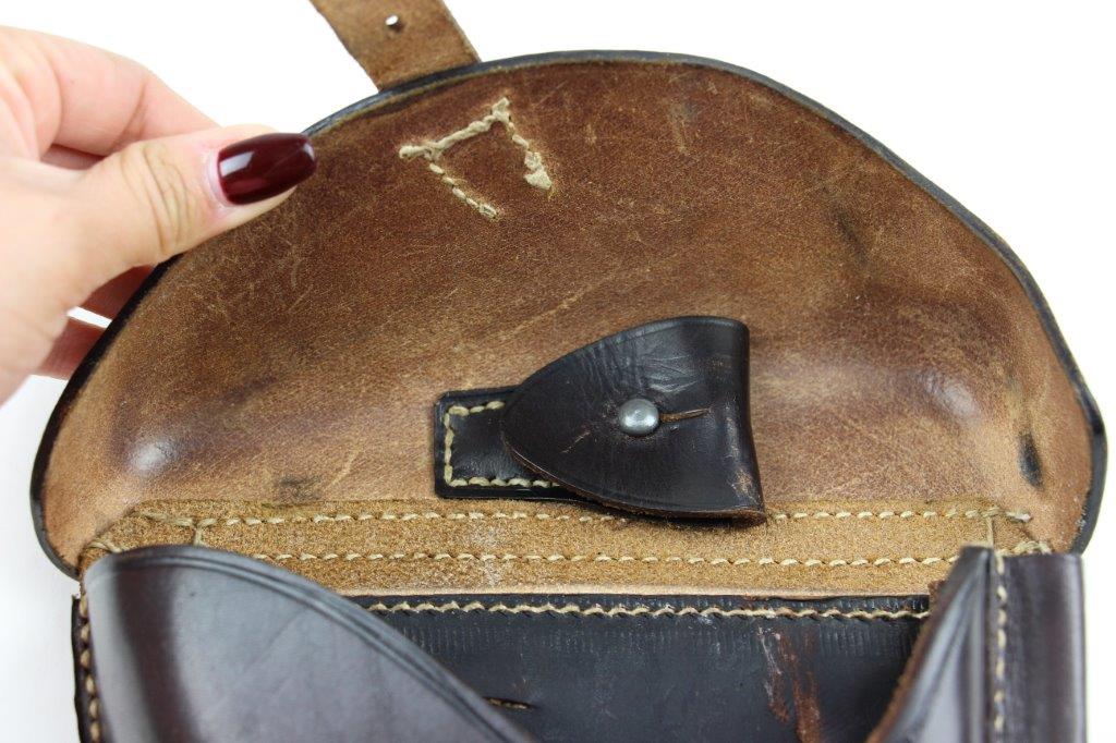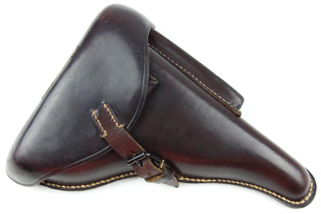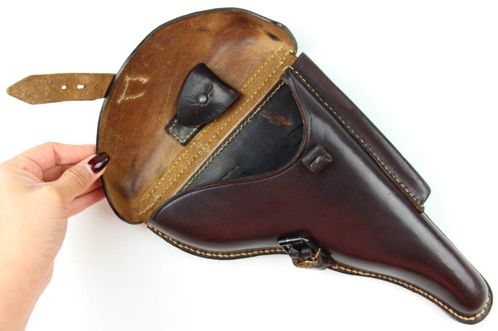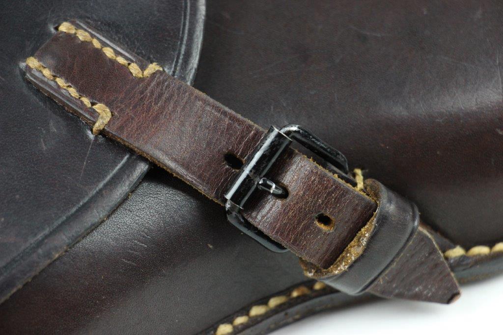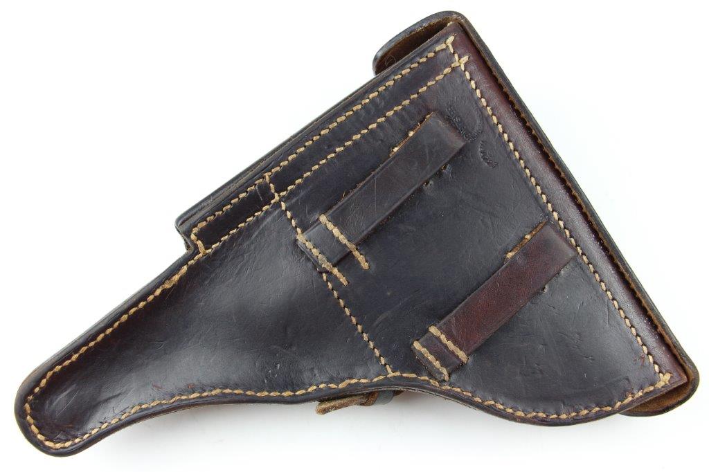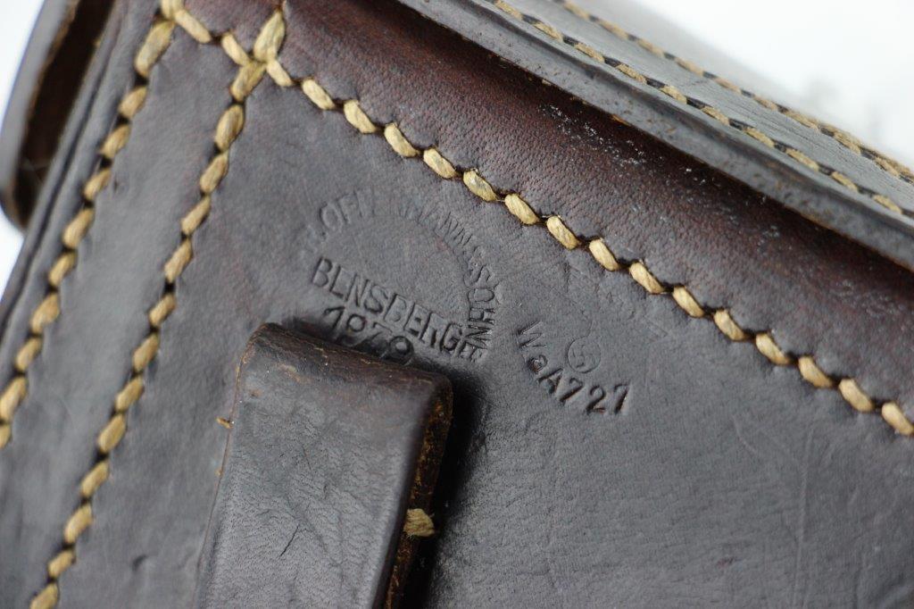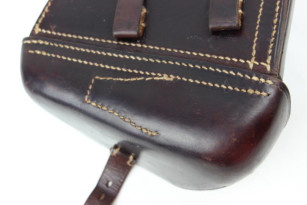3/26/24 – This is a high-end, minty condition 1939 dated Luger holster from WW2. The holster has crisp, clean leather that’s strong with minimal pliability throughout. There’s some minimal surface scratches and minor imperfections from age on the exterior leather. Very clean, crisp interior leather. The stitching is all tight and original. Nice straw color and clean throughout. The back leather is maker stamped with a fairly uncommon maker, “FR. Offermann & Sohne”. There’s also a 1939 date stamp and waffen military proof stamp on the back leather, as shown. A nearly impossible to upgrade example!