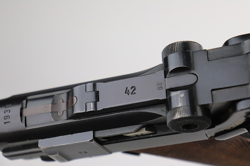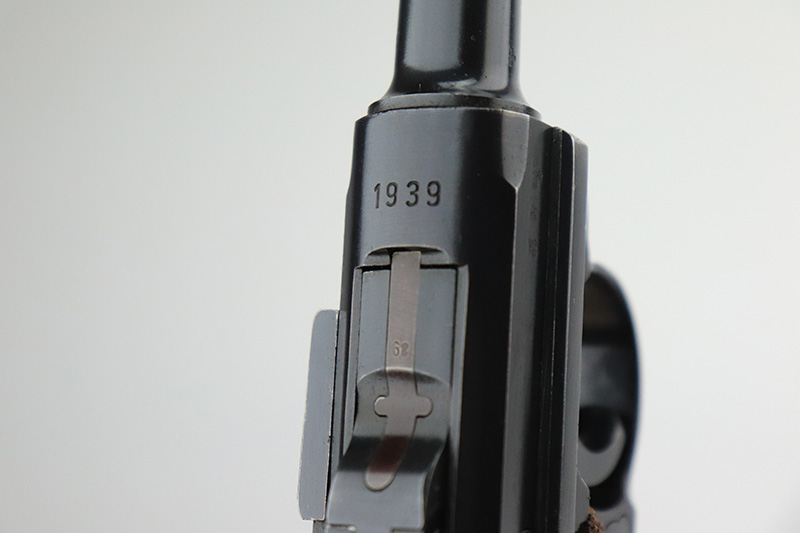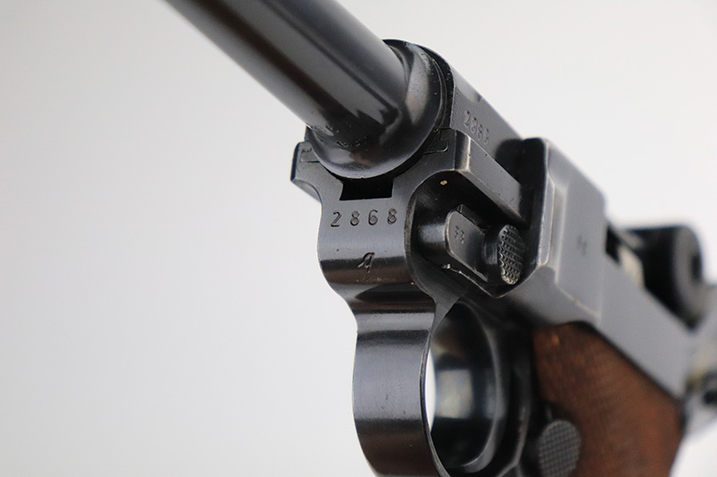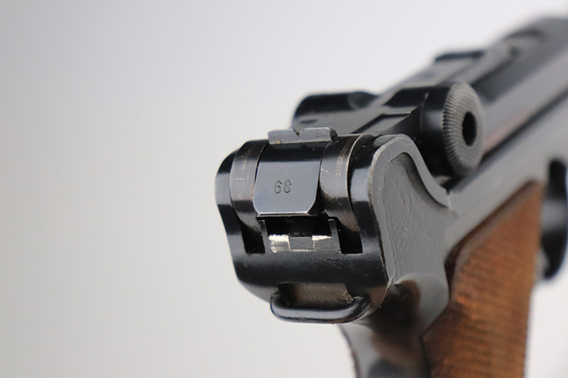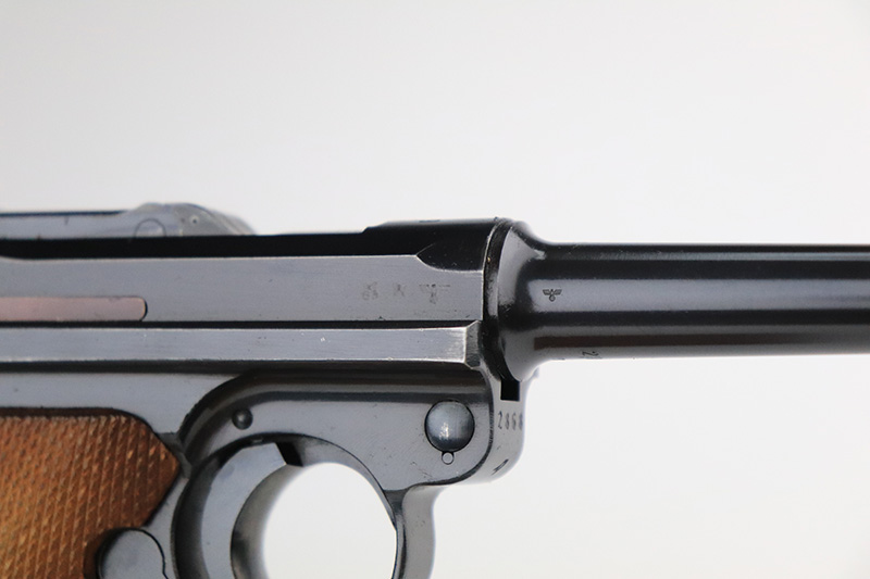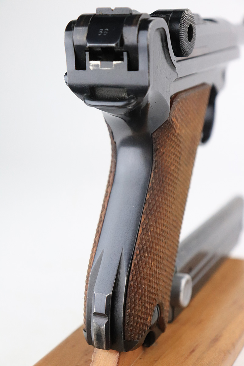 12/2/22 – This is a near-mint Nazi Mauser Luger from 1939. It is all matching and has the proper “Eagle 63” military proofs with 98+% blue remaining. It has a spot of finish loss on the bottom of the front strap, and very minor high point wear. The grips are sharp, beautiful and unnumbered. Bore is shiny with strong rifling but does have minor frost throughout.