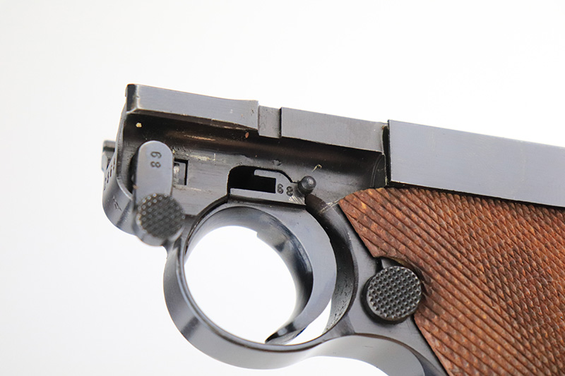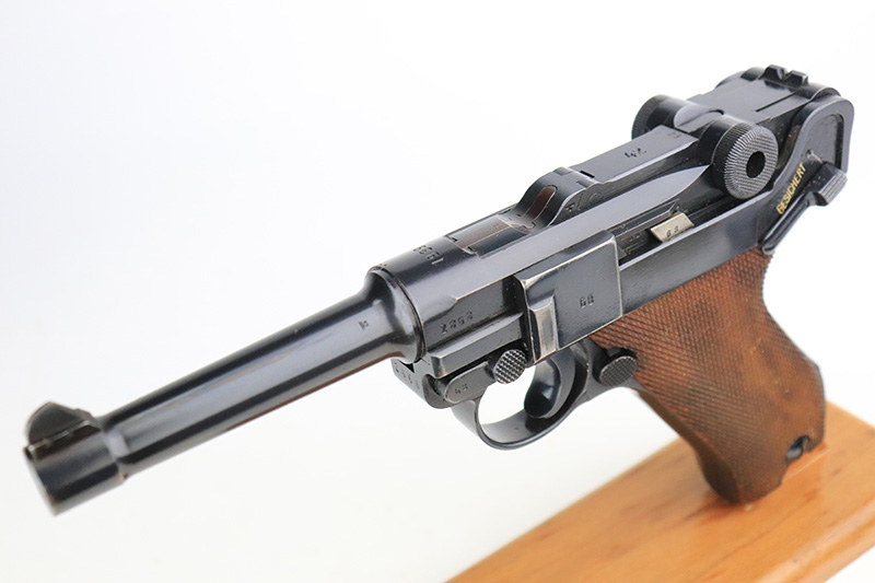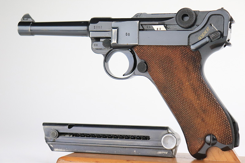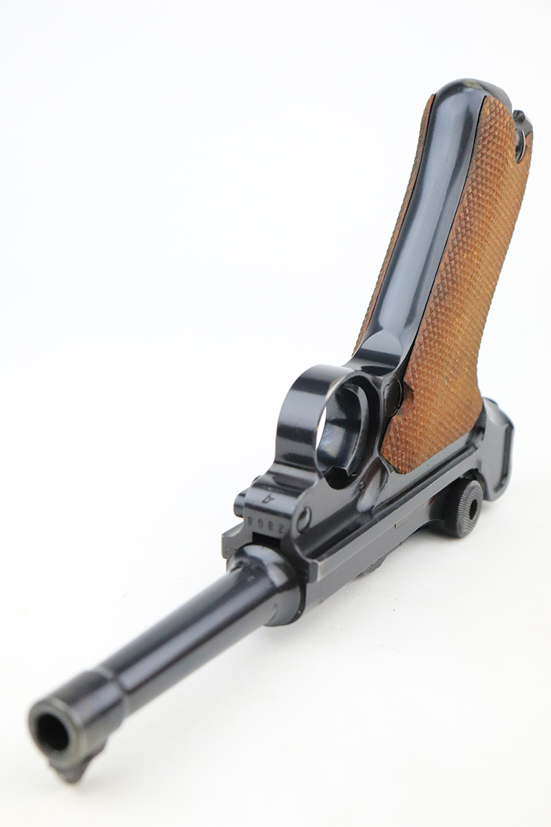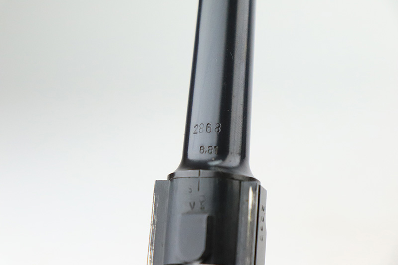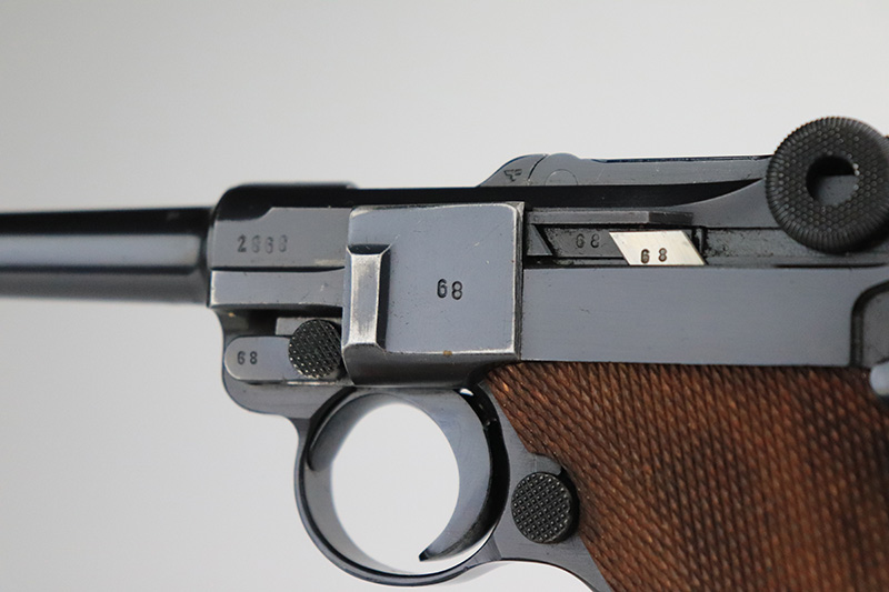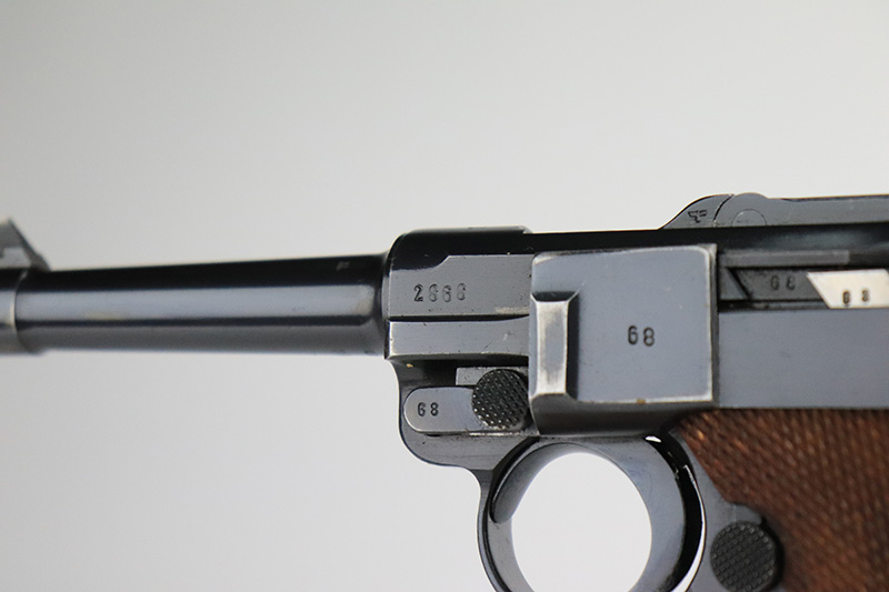 12/2/22 – This is a near-mint Nazi Mauser Luger from 1939. It is all matching and has the proper “Eagle 63” military proofs with 98+% blue remaining. It has a spot of finish loss on the bottom of the front strap, and very minor high point wear. The grips are sharp, beautiful and unnumbered. Bore is shiny with strong rifling but does have minor frost throughout.
