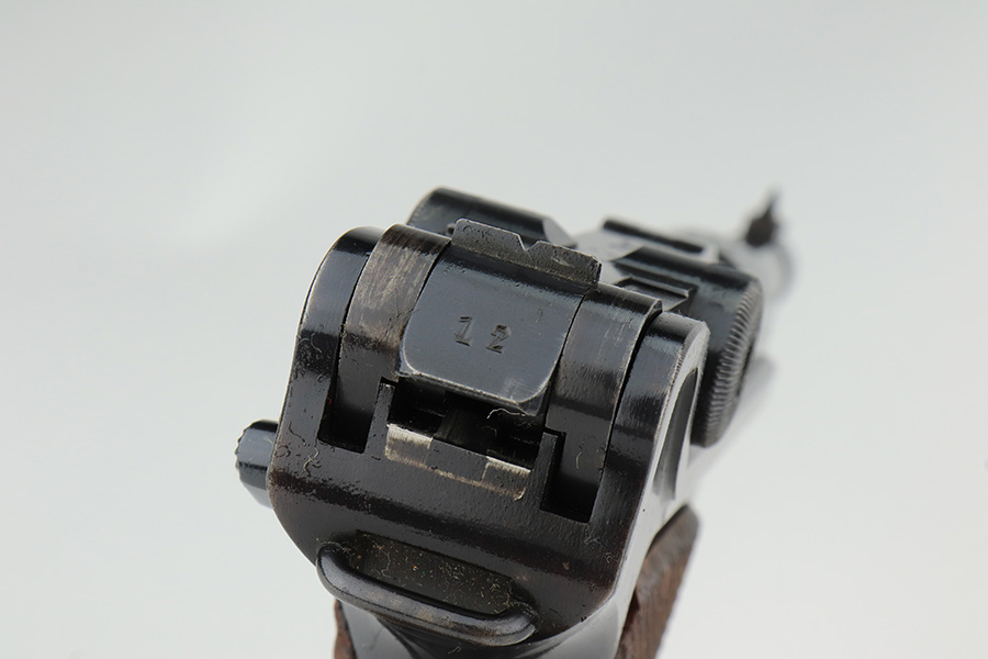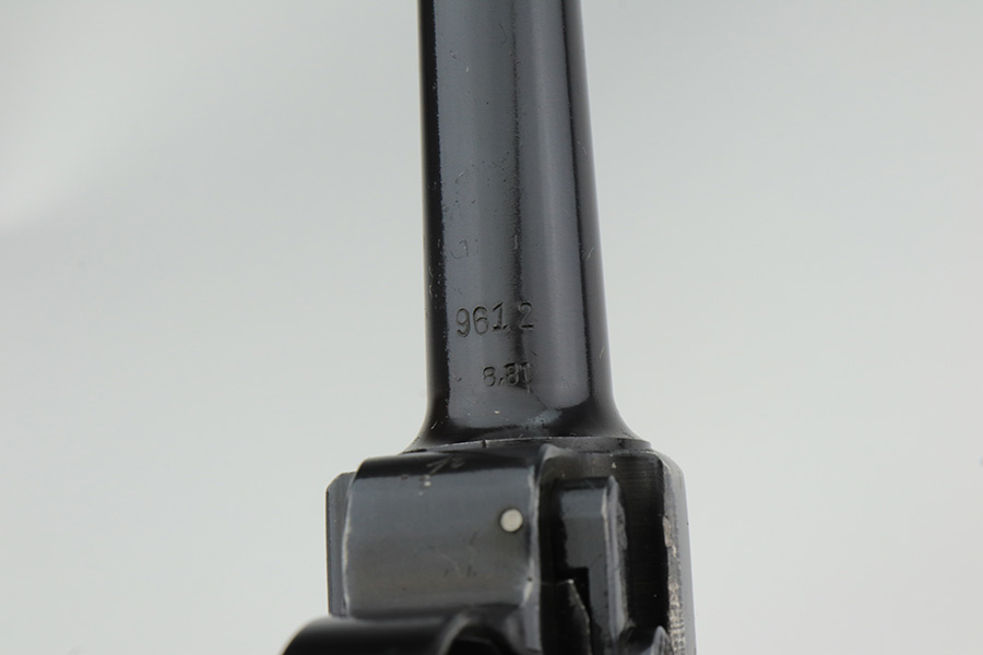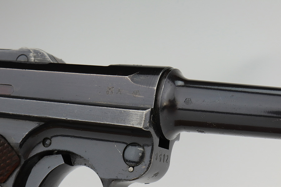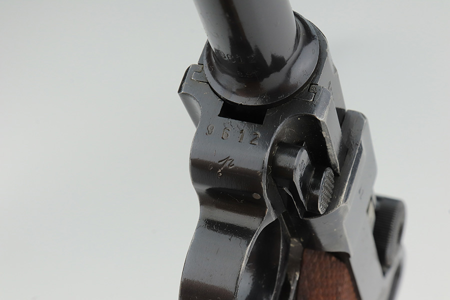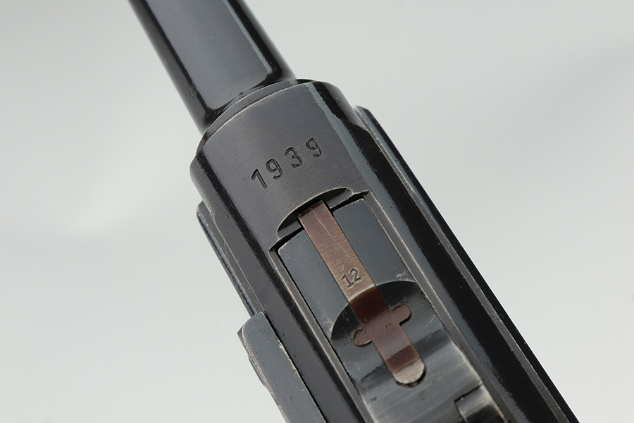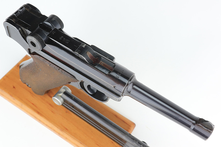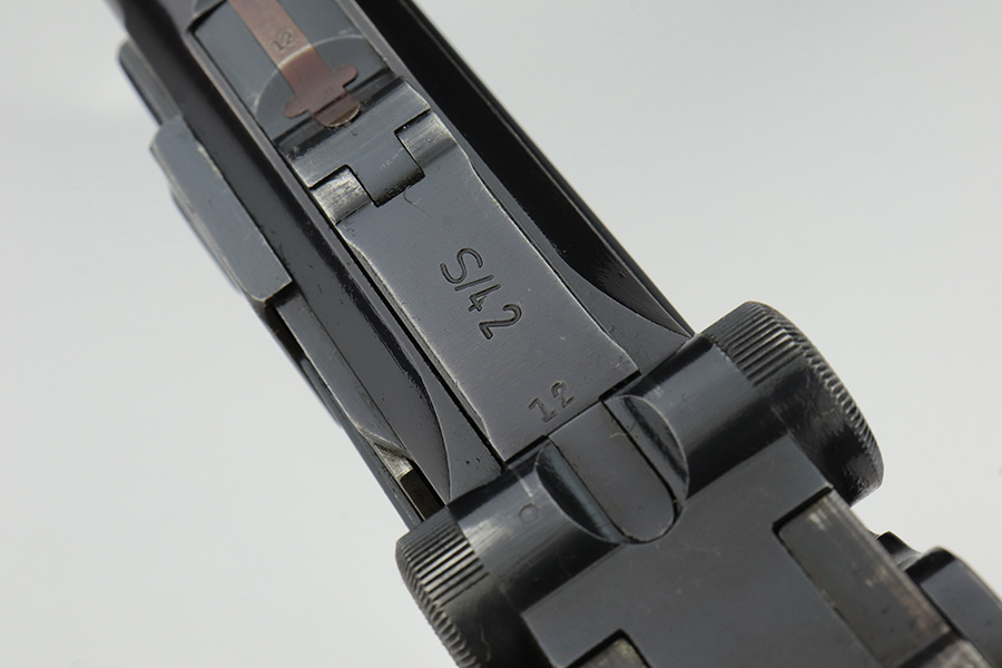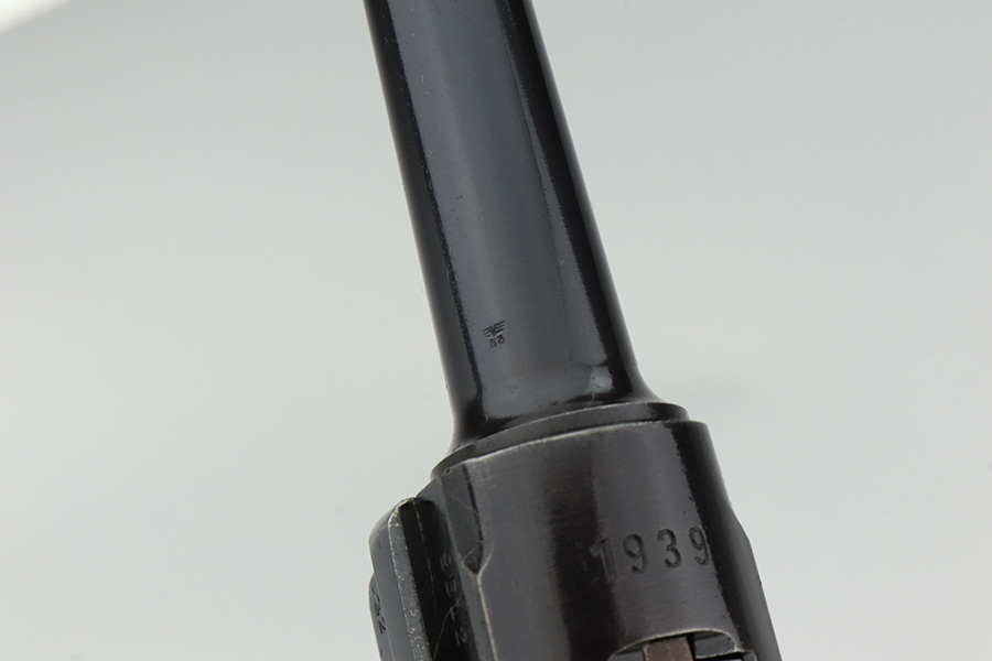 1/18/23 – This is a minty example of an S/42 Mauser Luger issued to the Nazi military in 1939. It is all matching and has the proper “Eagle 63” military acceptance proofs. It has retained about 98% of its original finish. There is just very minor wear on the side plate and hints of wear around the muzzle and on the very front edges of the side rails. One tiny spot of wear at the base of the front strap and some very light freckling on the back strap. Fitted with a minty set of un-numbered wood grips. Comes with a mismatched “Eagle 83” proofed magazine. Mint bore.