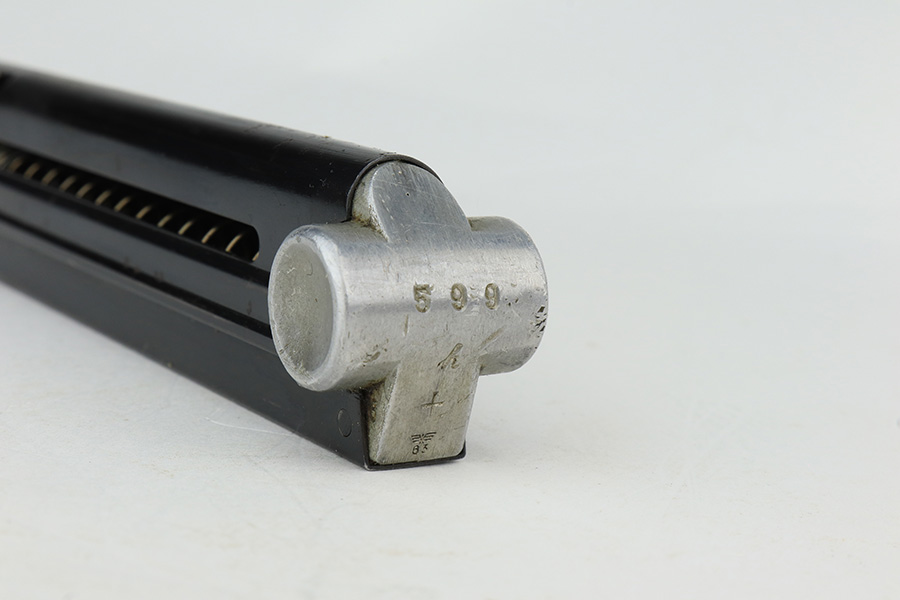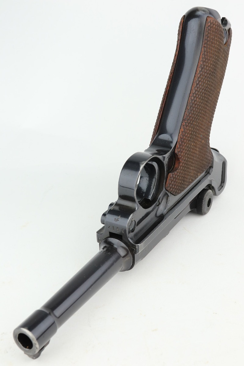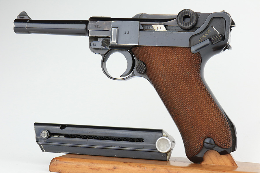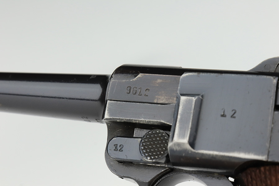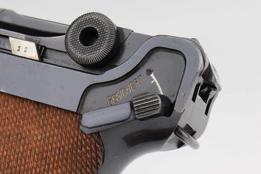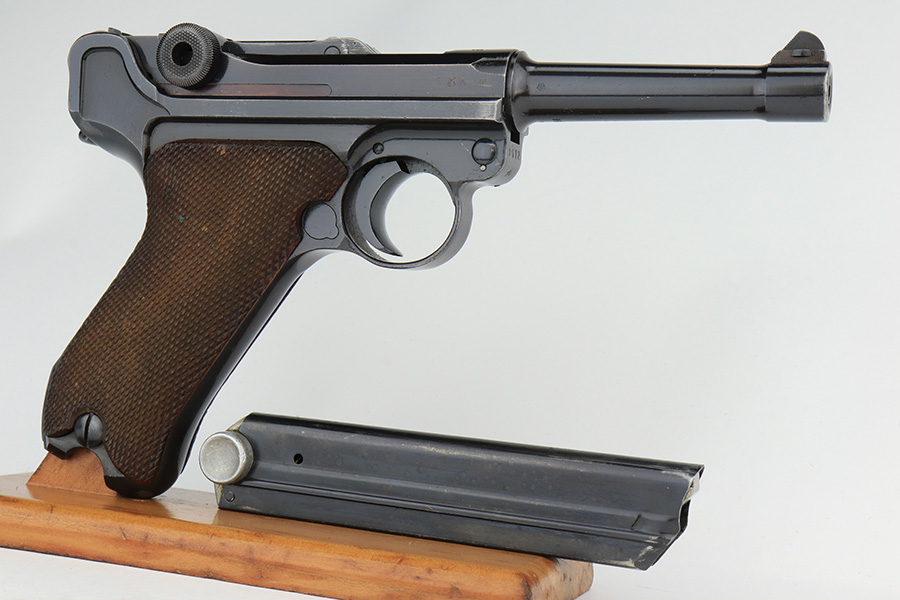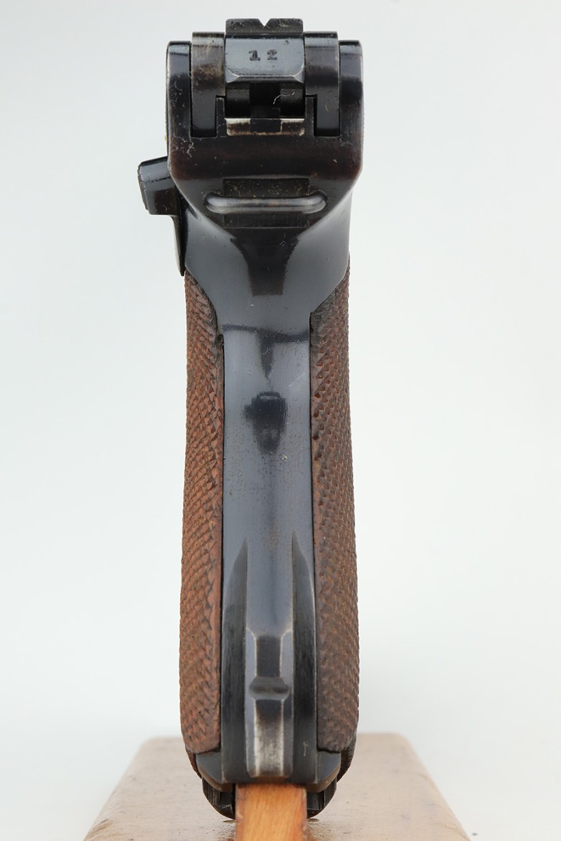 1/18/23 – This is a minty example of an S/42 Mauser Luger issued to the Nazi military in 1939. It is all matching and has the proper “Eagle 63” military acceptance proofs. It has retained about 98% of its original finish. There is just very minor wear on the side plate and hints of wear around the muzzle and on the very front edges of the side rails. One tiny spot of wear at the base of the front strap and some very light freckling on the back strap. Fitted with a minty set of un-numbered wood grips. Comes with a mismatched “Eagle 83” proofed magazine. Mint bore.
