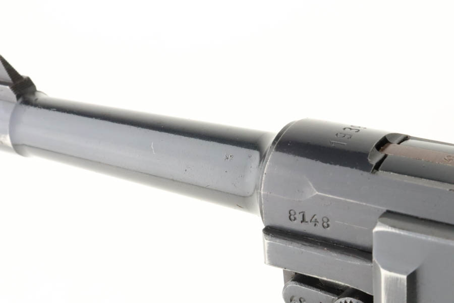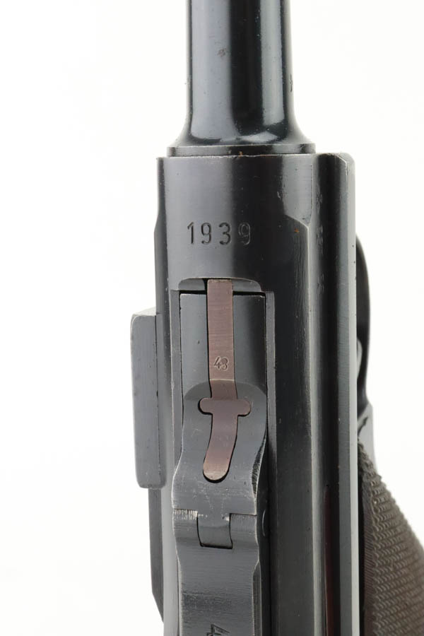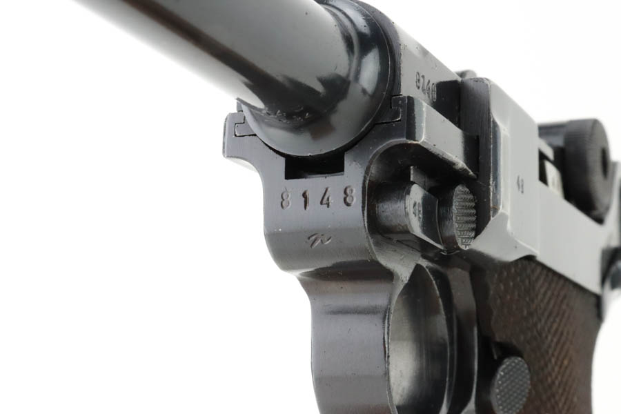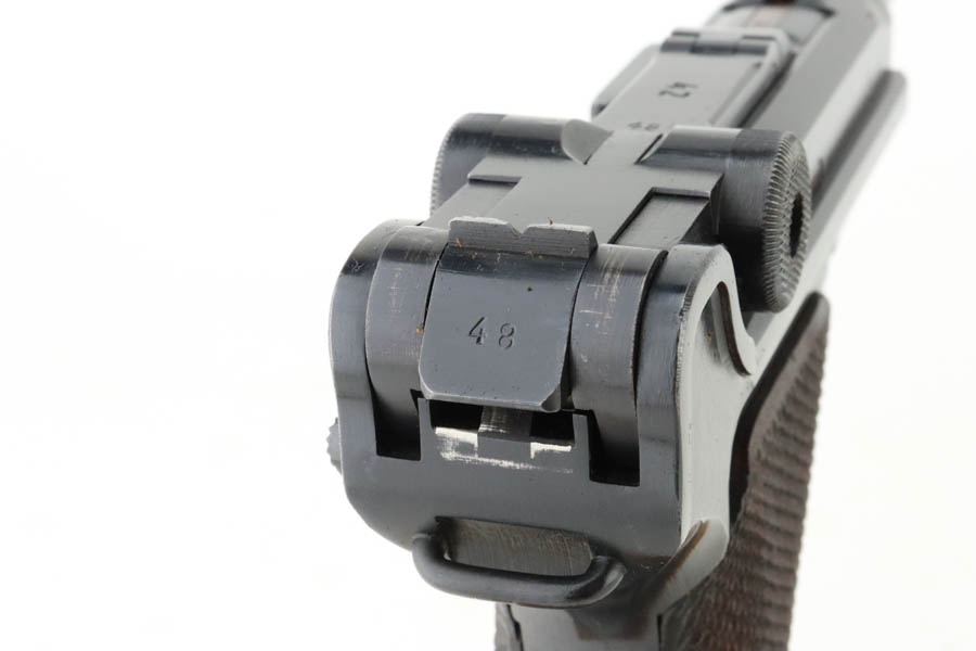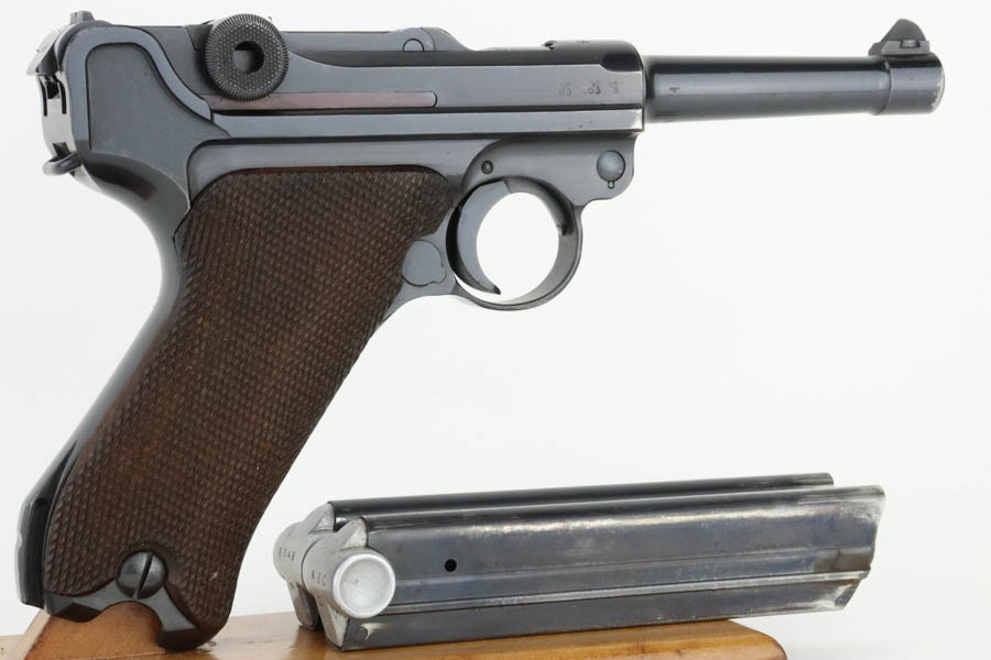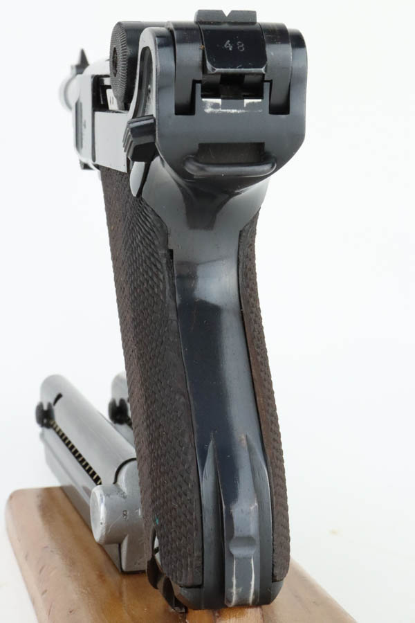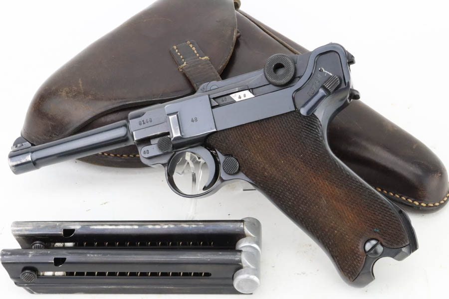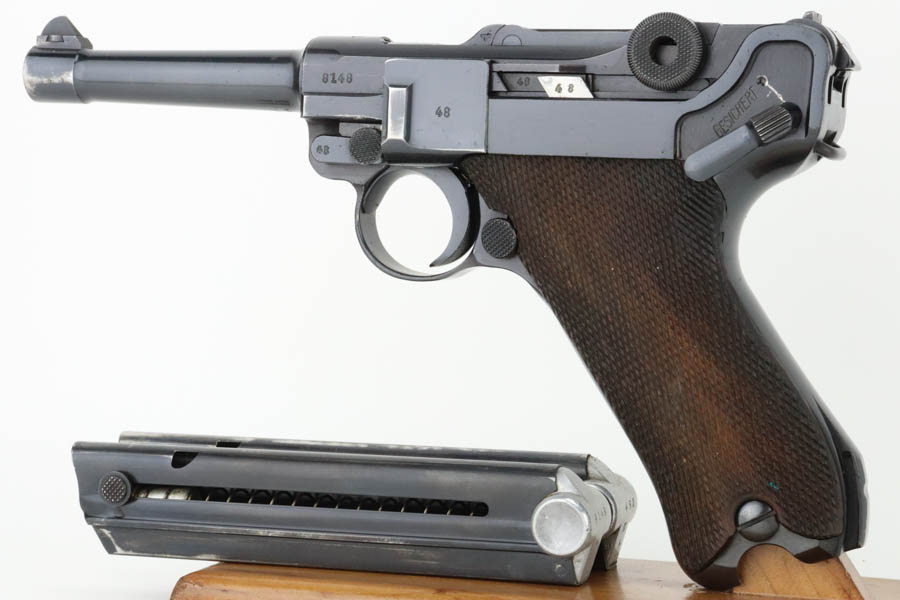 6/26/24 – This is a minty example of a Mauser Luger issued to the Nazi military in 1939. All matching with the proper “Eagle 63” military acceptance proofs. It comes as a rig with one original matching-numbered magazine, one mismatched “Eagle 83” marked magazine, an “Eagle 63” tool, and a very nice 1939-dated holster. The gun itself has retained about 97% of its original finish with very minor wear around the muzzle and side plate. Fitted with mint matching-numbered wood grips. Minty bore.