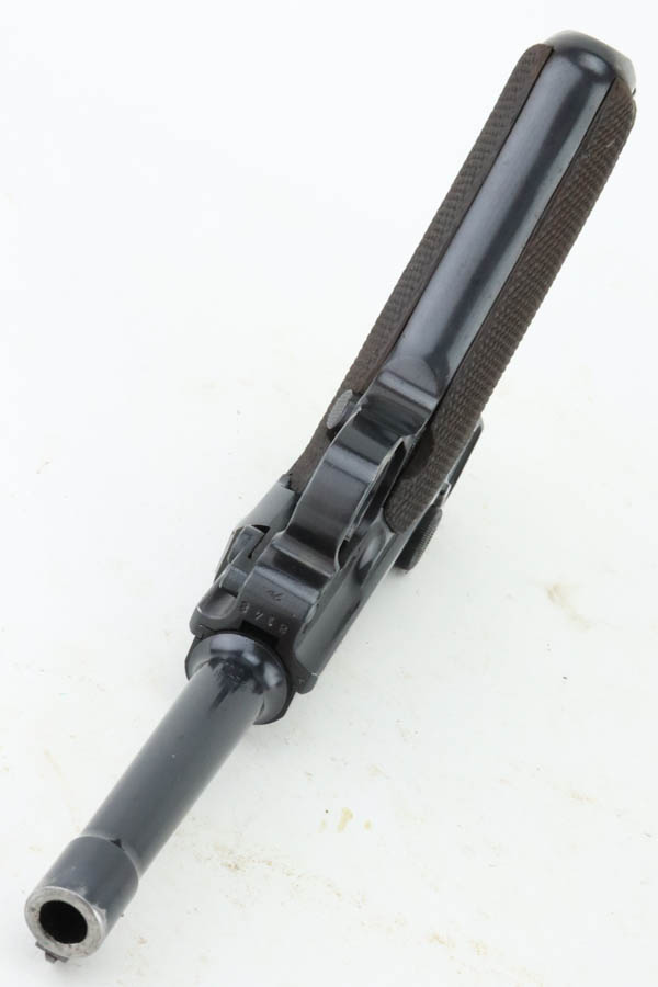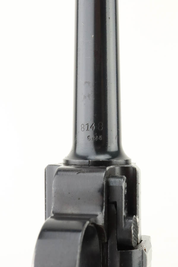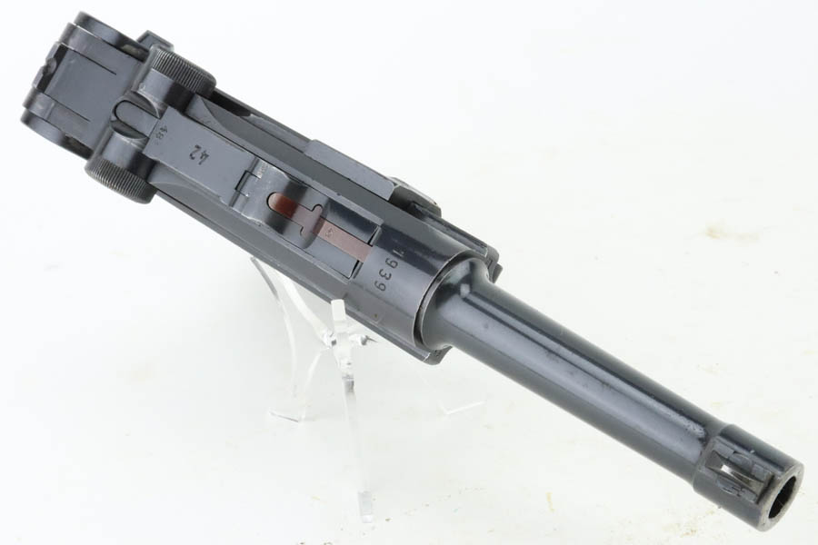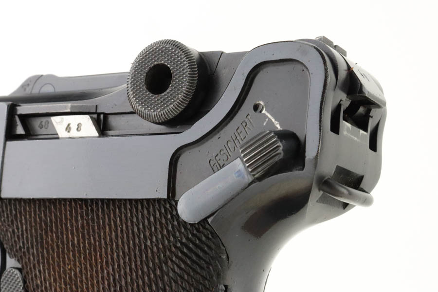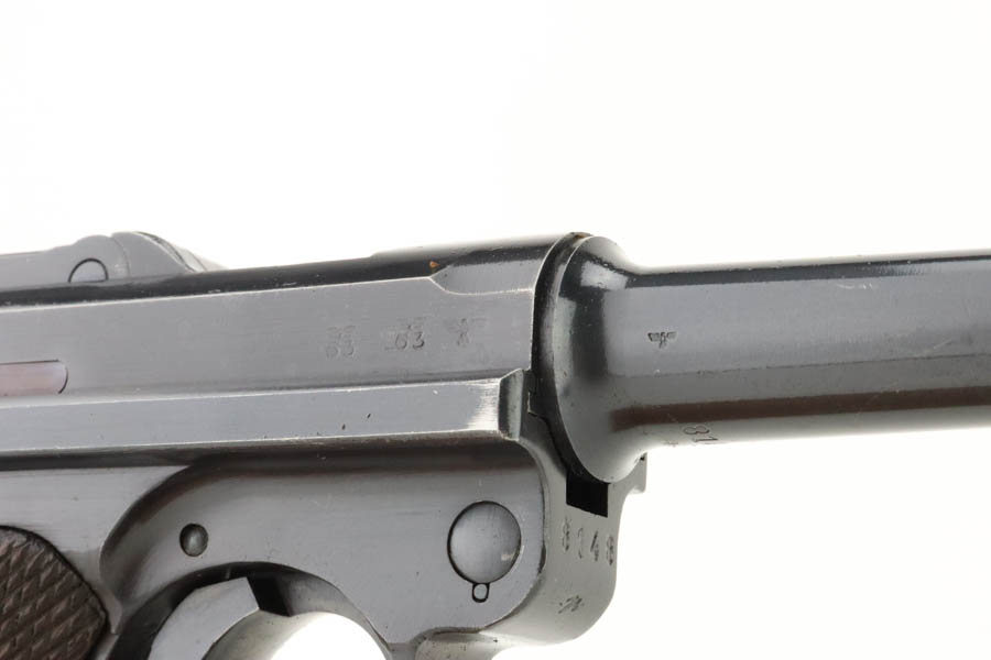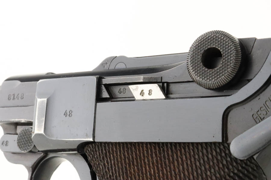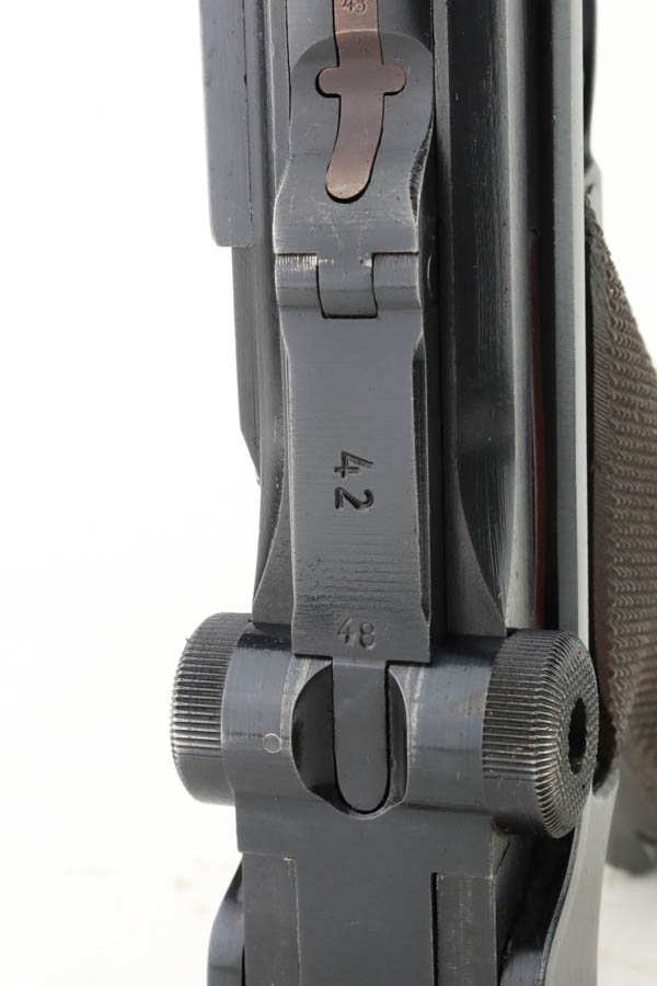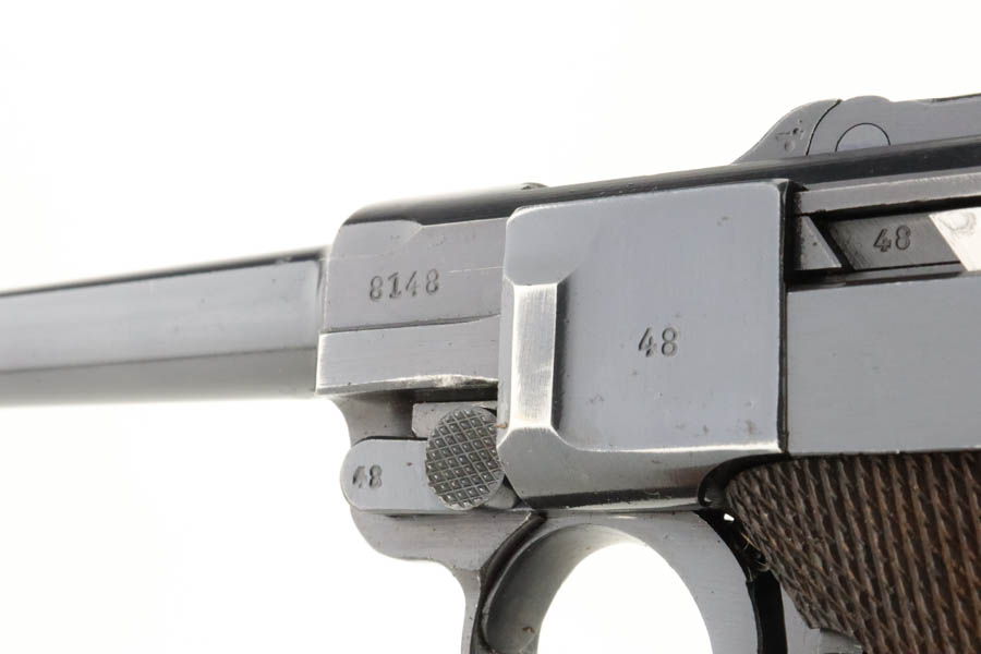 6/26/24 – This is a minty example of a Mauser Luger issued to the Nazi military in 1939. All matching with the proper “Eagle 63” military acceptance proofs. It comes as a rig with one original matching-numbered magazine, one mismatched “Eagle 83” marked magazine, an “Eagle 63” tool, and a very nice 1939-dated holster. The gun itself has retained about 97% of its original finish with very minor wear around the muzzle and side plate. Fitted with mint matching-numbered wood grips. Minty bore.