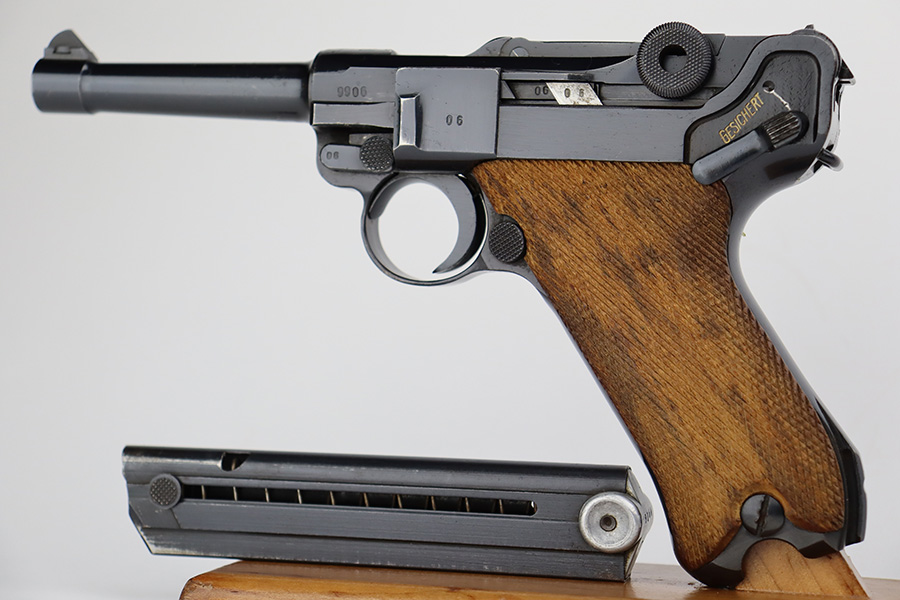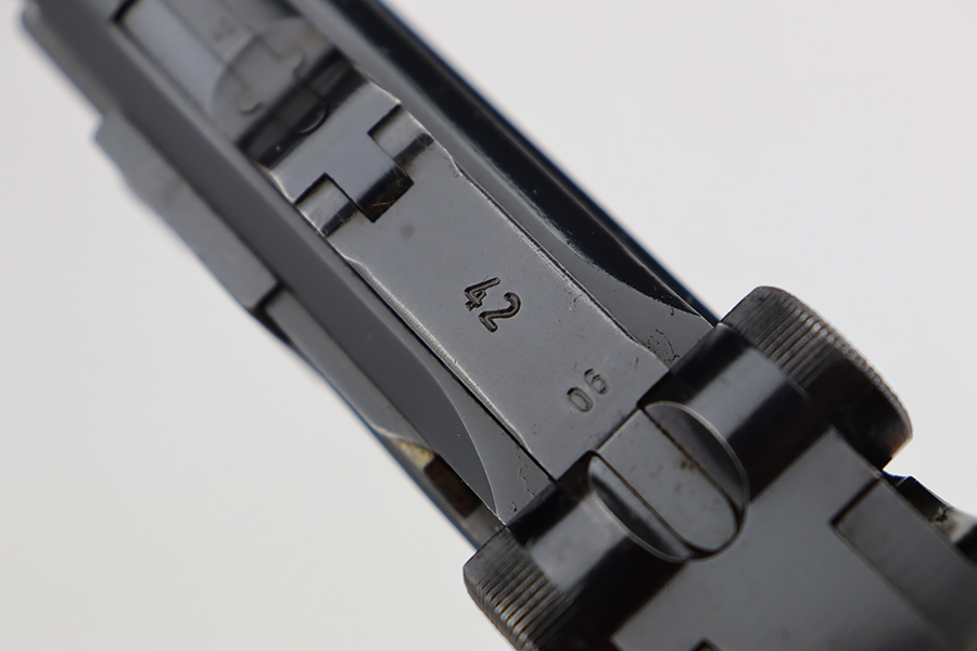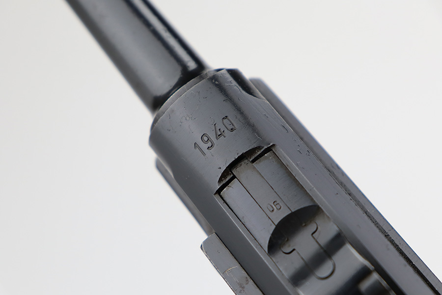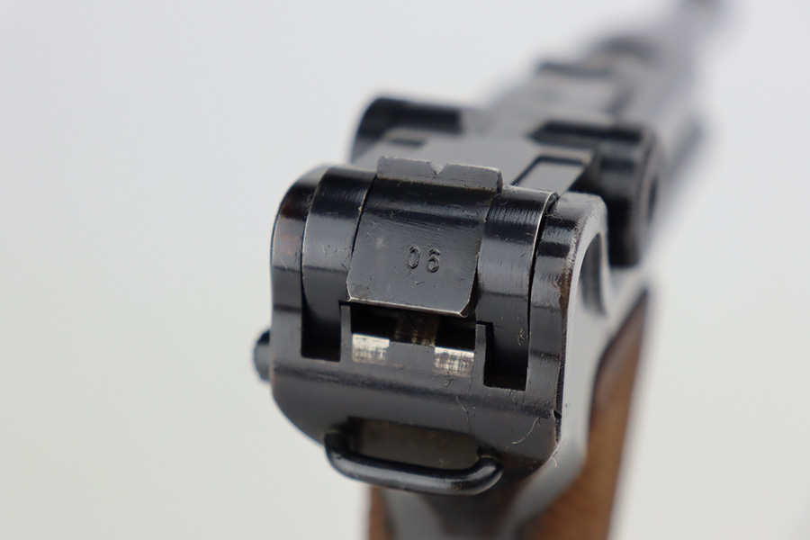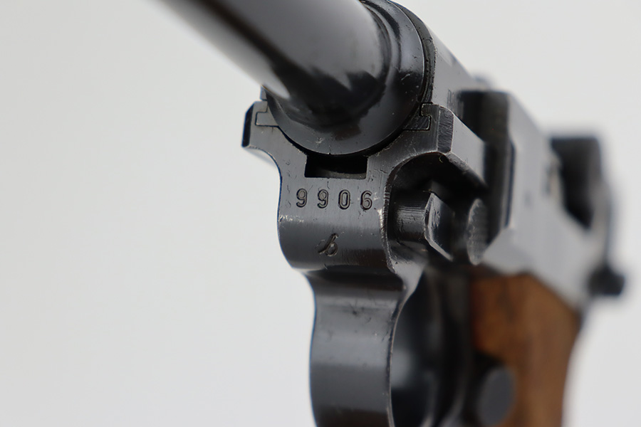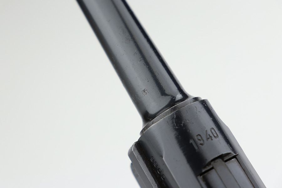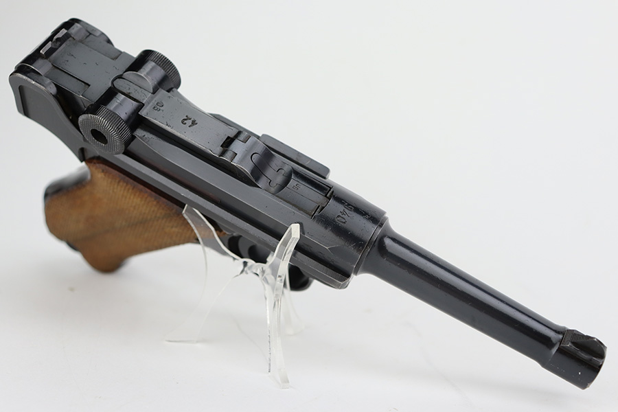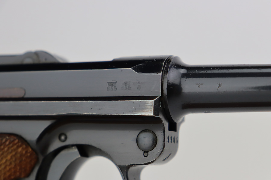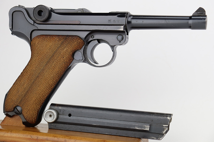 8/15/23 – This is a near-mint example of a Mauser Luger issued to the Nazi military in 1940. All matching with the proper “Eagle 655” military acceptance proofs. It has retained nearly all of its original finish with just hints of wear around the muzzle and on some of the high edges. Light freckling on the back strap. Fitted with minty matching-numbered and “Eagle 655” proofed wood grips. Comes with a mismatched magazine. The bore has strong rifling, but there is spotty oxidation throughout.
