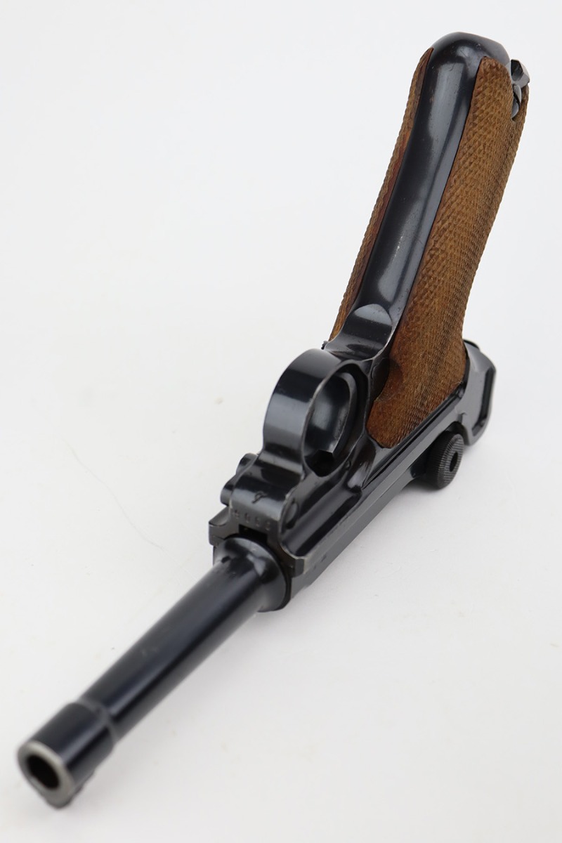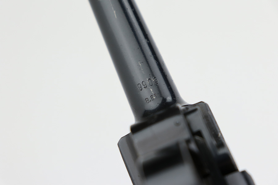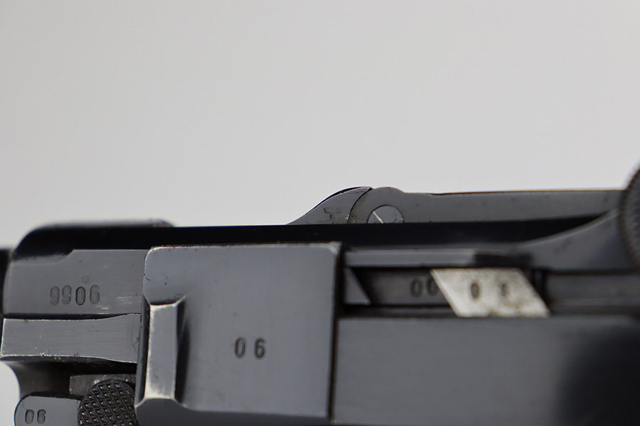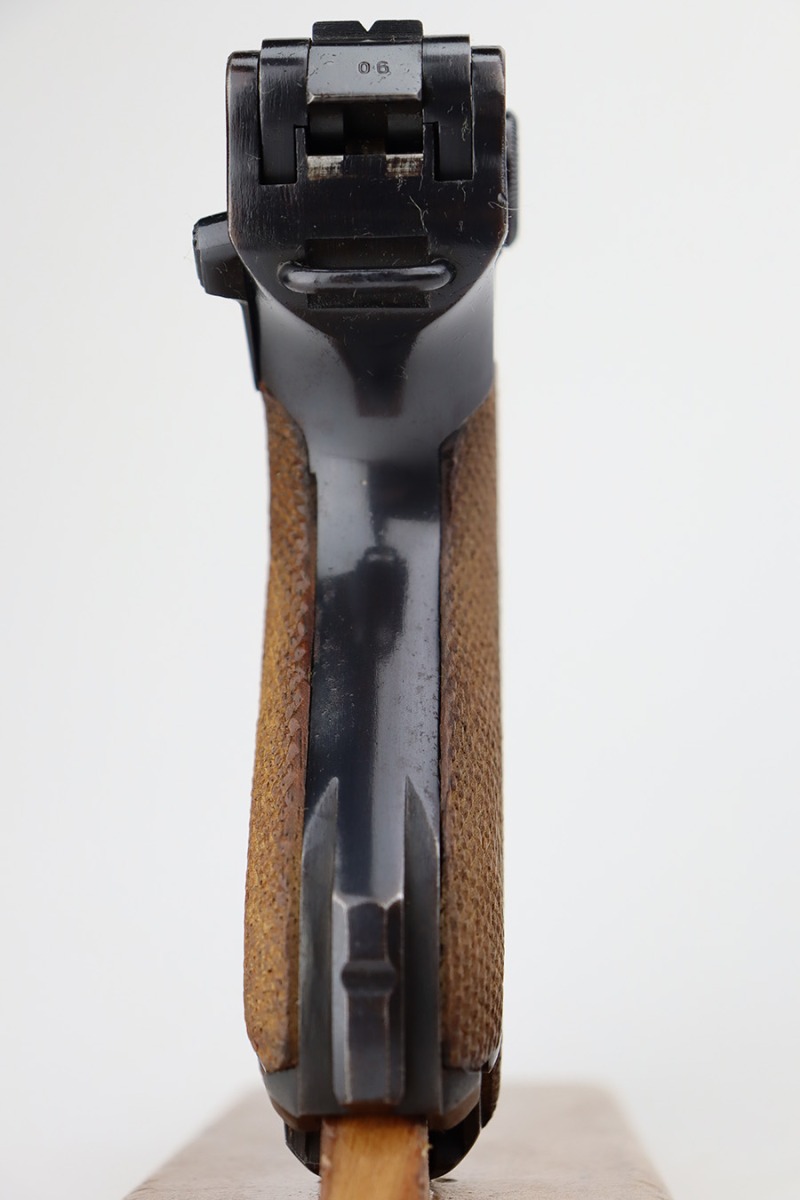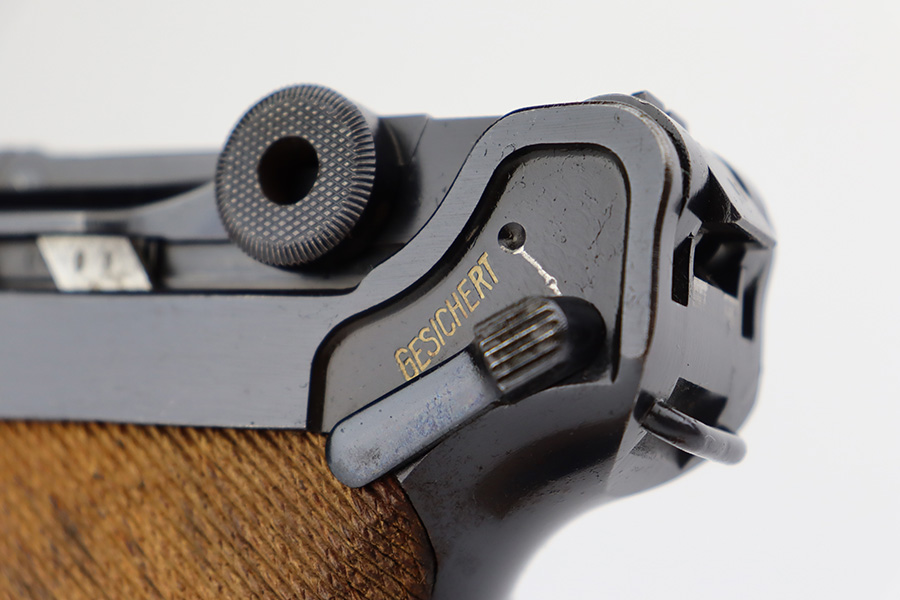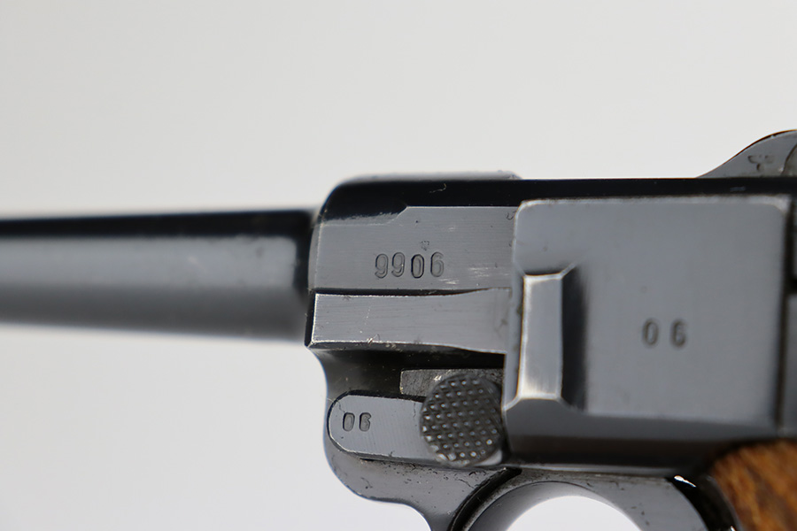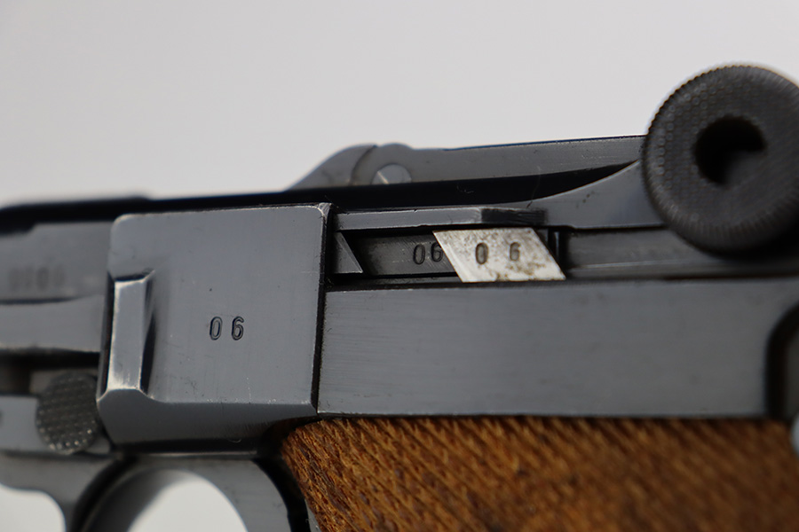8/15/23 – This is a near-mint example of a Mauser Luger issued to the Nazi military in 1940. All matching with the proper “Eagle 655” military acceptance proofs. It has retained nearly all of its original finish with just hints of wear around the muzzle and on some of the high edges. Light freckling on the back strap. Fitted with minty matching-numbered and “Eagle 655” proofed wood grips. Comes with a mismatched magazine. The bore has strong rifling, but there is spotty oxidation throughout.
