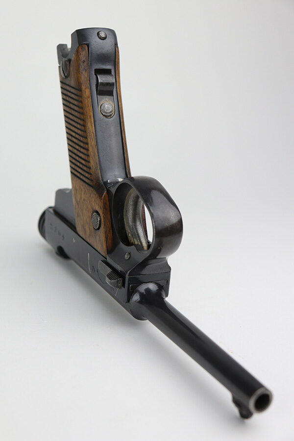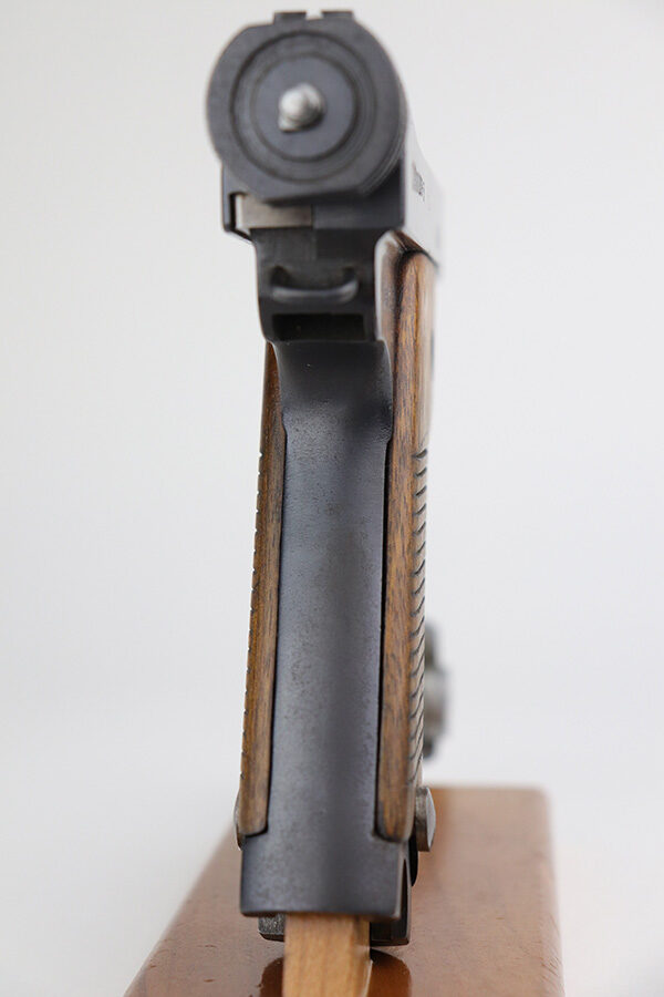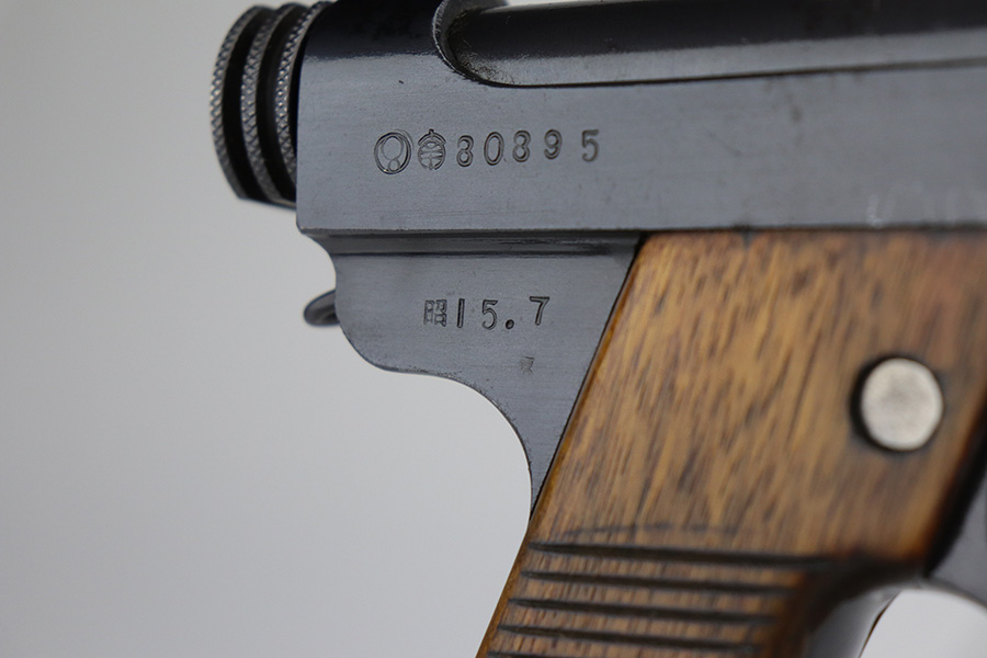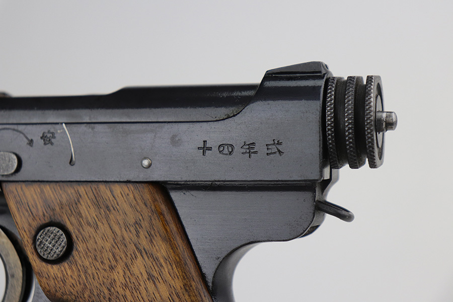 9/15/21 – This is a minty example of a Nambu Type 14 issued to the Japanese military in July of 1940. It is all matching and comes with one original matching magazine. The gun has retained more than 98% of its original finish – just hints of wear on the high edges. While there is next-to-no finish loss, there are areas of oxidation and discoloration most noticeable on the barrel and top of the slide. A few tiny pits in the same areas. A few very light scratches on the right side of the slide. Comes with nice matching hand-numbered grips. The bore is shiny with good rifling.