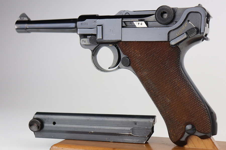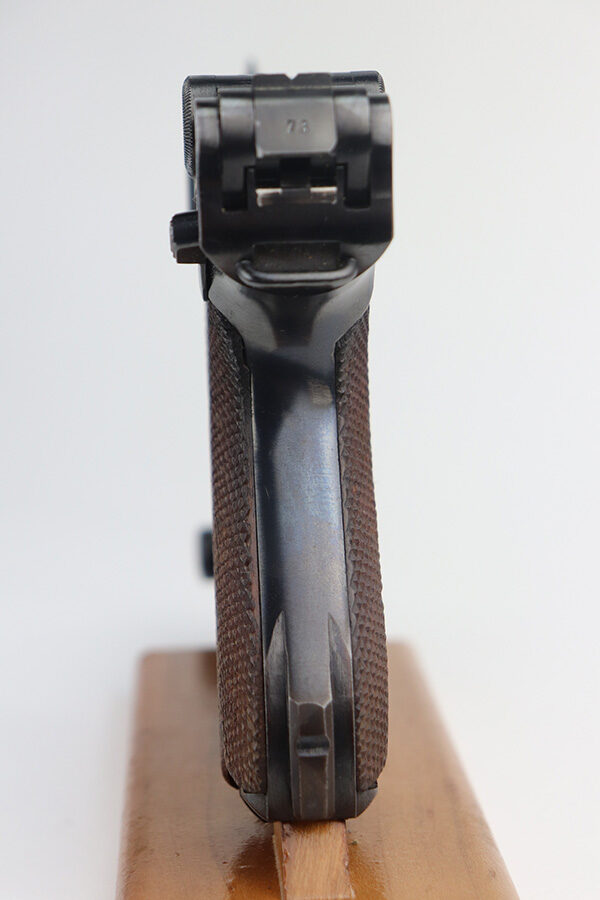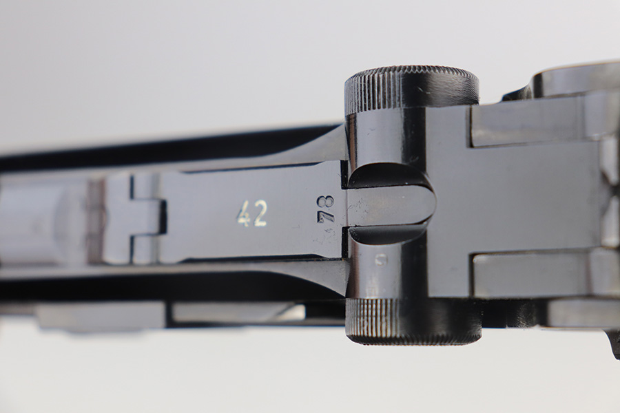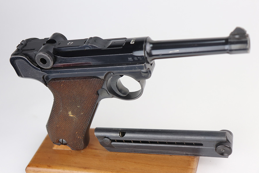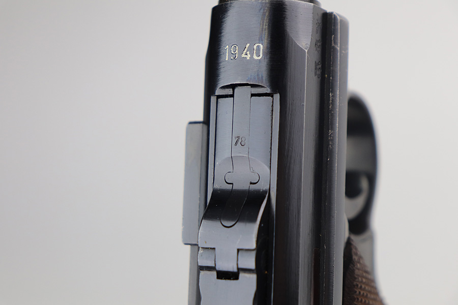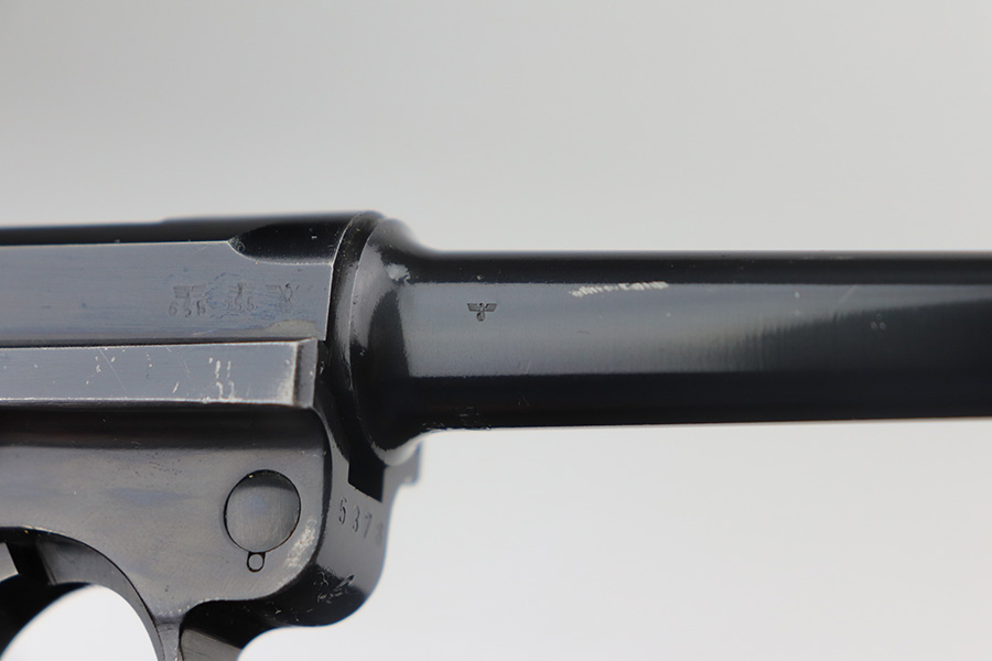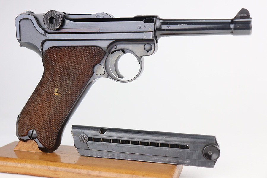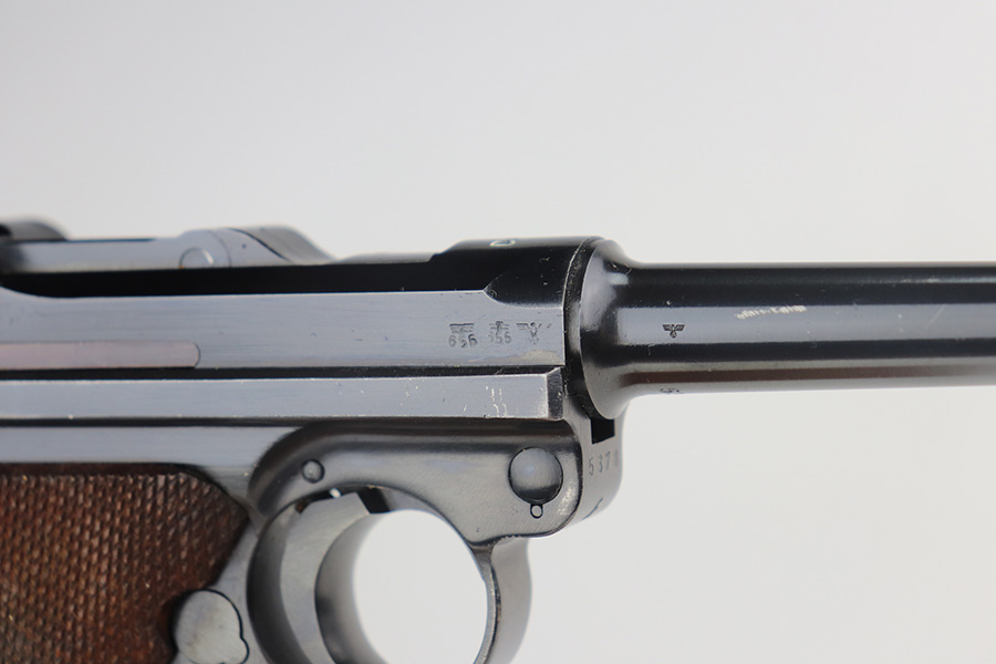 6/17/21 – This is a minty example of a Mauser Luger issued to the Nazi military in 1940. The gun is all matching and has the proper “Eagle 655” military proofs. It has retained about 98% of its finish with just hints of wear on the side rails and around the muzzle. One very small spot on the back strap. There are tiny handling marks on the barrel, side plate, left side of the frame, and on the front strap. Comes with very nice waffen-proofed grips (a few minor bruises) and a black widow magazine. The bore is factory-new.